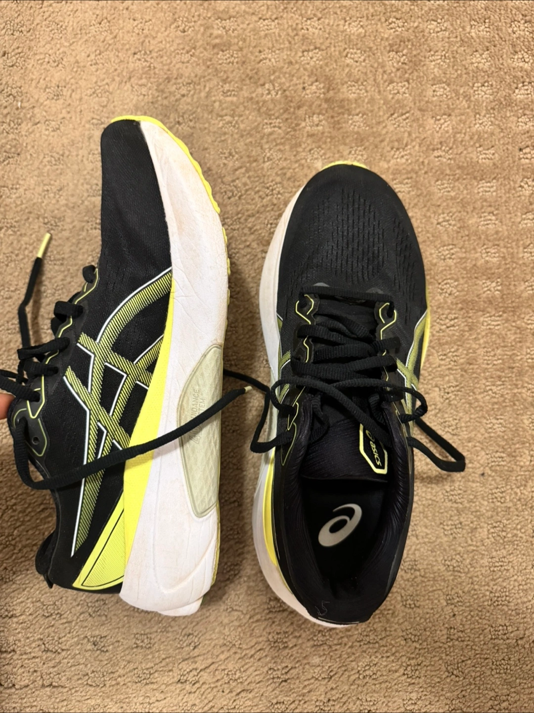 Men's running shoes. Black with lime green accents. Size 9 US. Good condition. PureGEL cushioning. Lightweight and breathable.