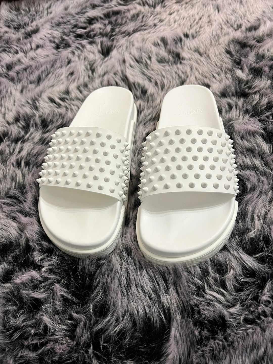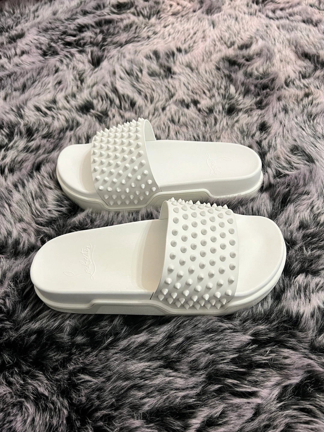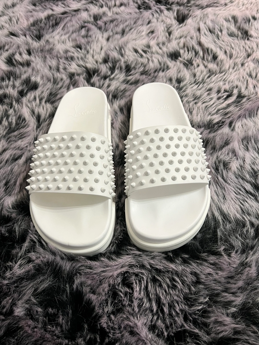 Brand new authentic pair of white Christian Louboutin studded slides. Comfortable summer footwear. Features a platform sole and signature red Louboutin sole. Serious buyers only. Price is firm.