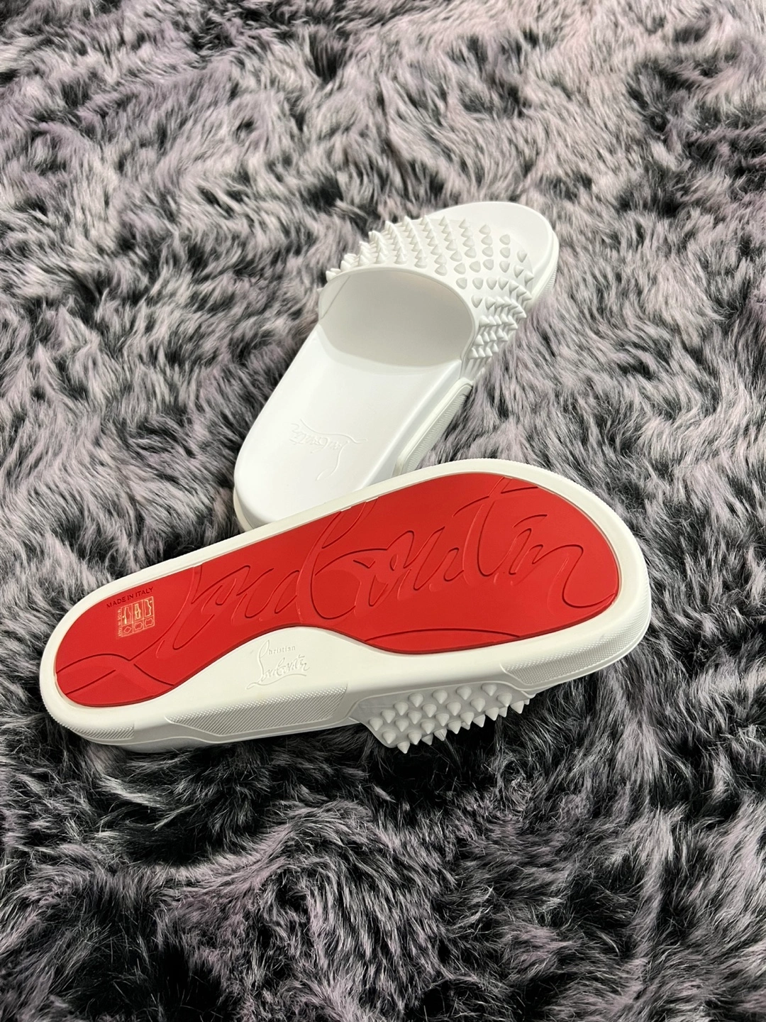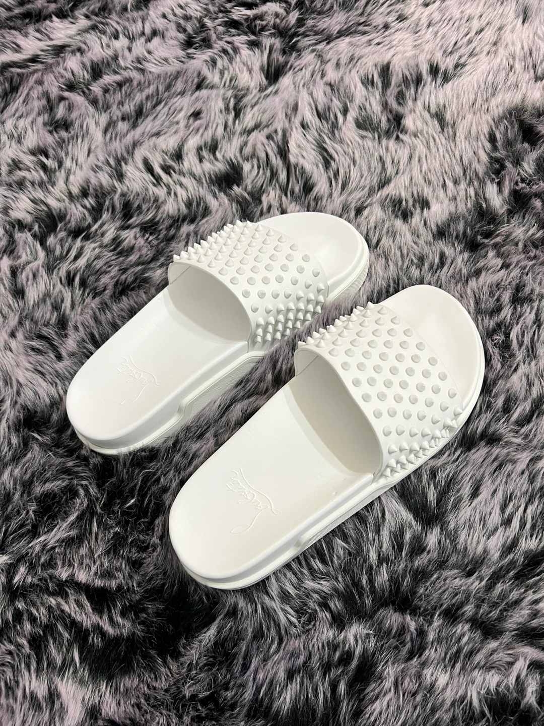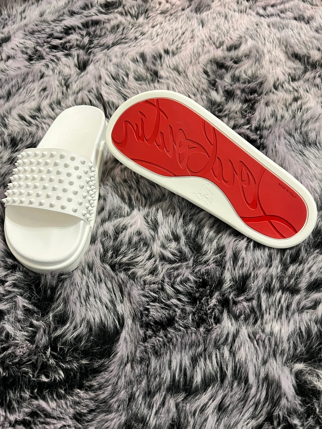 Brand new authentic pair of white Christian Louboutin studded slides. Comfortable summer footwear. Features a platform sole and signature red Louboutin sole. Serious buyers only. Price is firm.