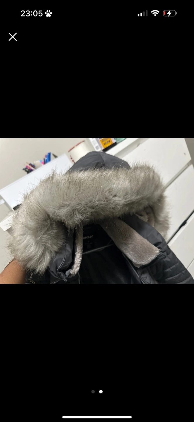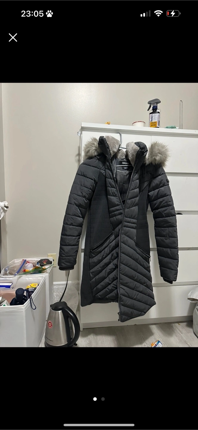 Stylish long puffer jacket. Features a faux fur trimmed hood and quilted design. Great for colder weather. Zipper closure. Side pockets.