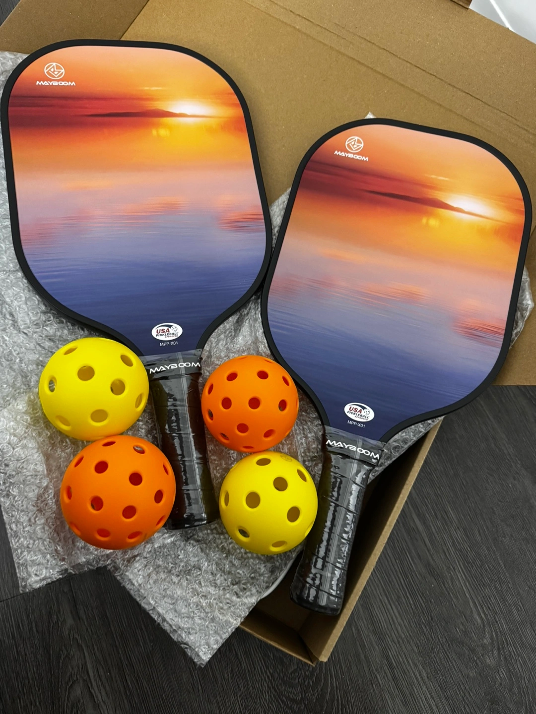 New Mayboom pickleball set. Includes two paddles, four balls, and a carry bag. Sunset design. Great for recreational play. Instruction book for how to play and maintain the pickle set is included. Pick up from Jarvis and Dundus intersection. Cash only. No delivery option. Thank you!