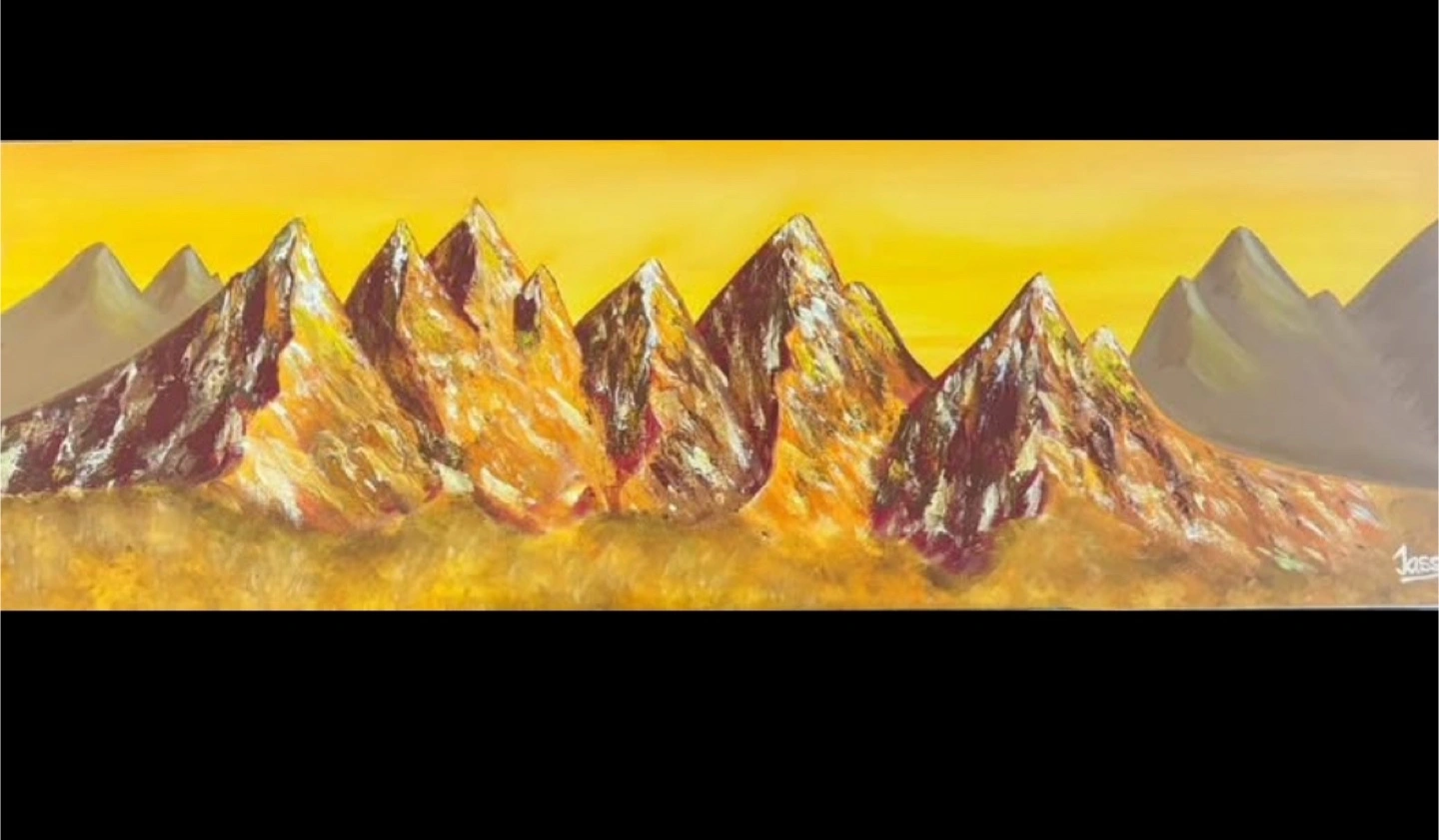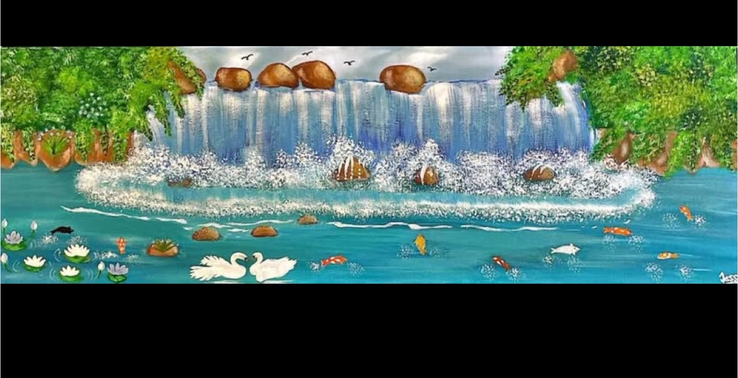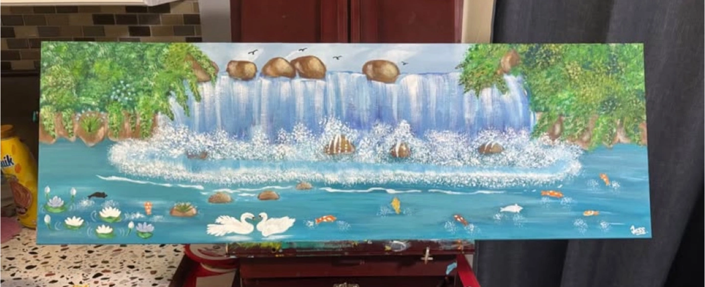 Set of two original landscape paintings. One depicts a mountain range at sunset, the other shows a waterfall scene with swans and koi. Both are painted on canvas. Beautiful colours and details. Perfect for home décor. $60 each