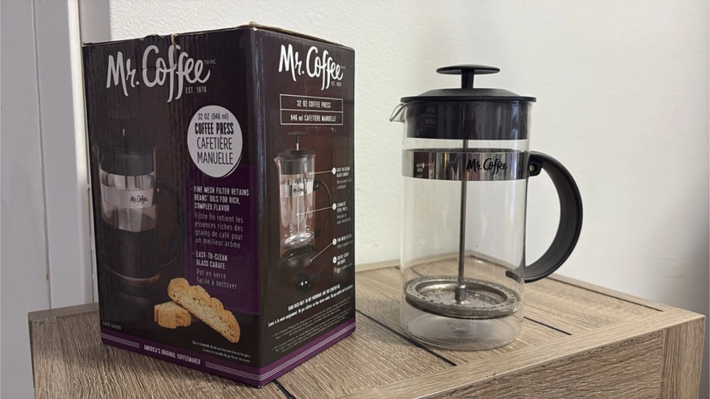 New in box, Mr. Coffee French press. 32 oz capacity. Easy-to-clean glass carafe. Fine mesh filter retains bean oils for rich flavour.