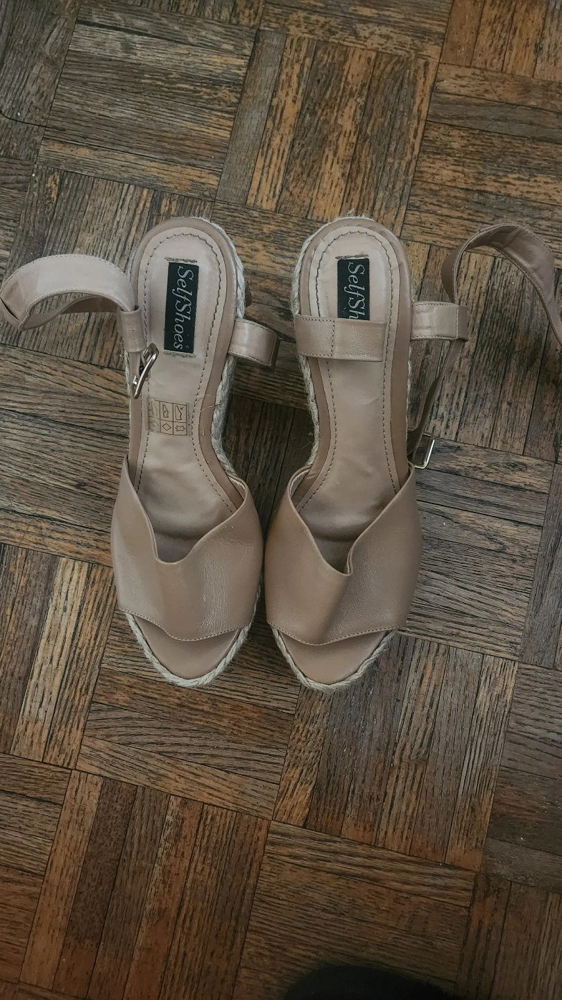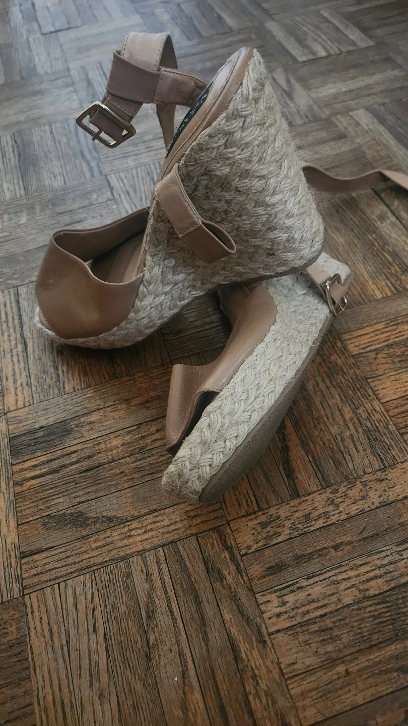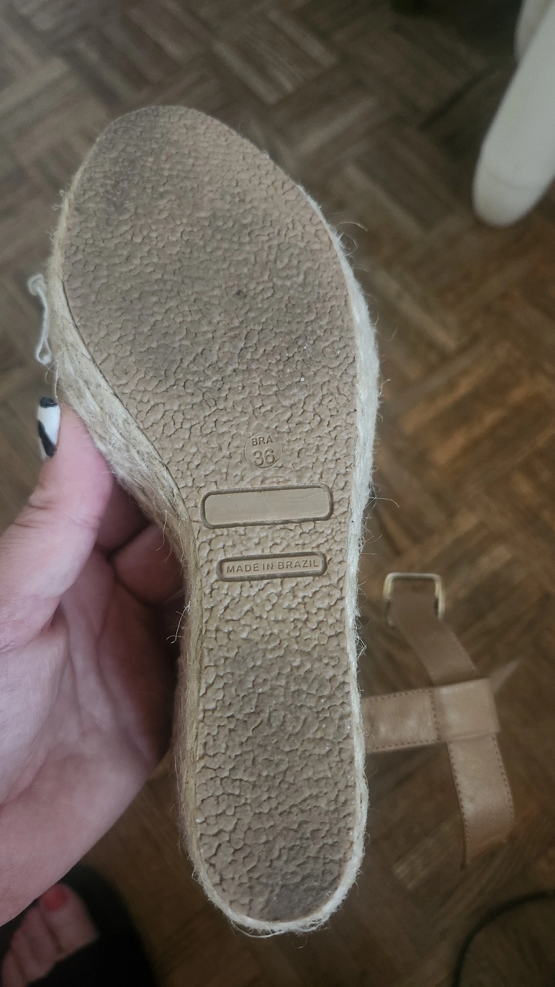 Lightly used beige leather sandals. Wedge heel with rope detailing. Ankle strap closure. Size BRA 36. Made in Brazil.