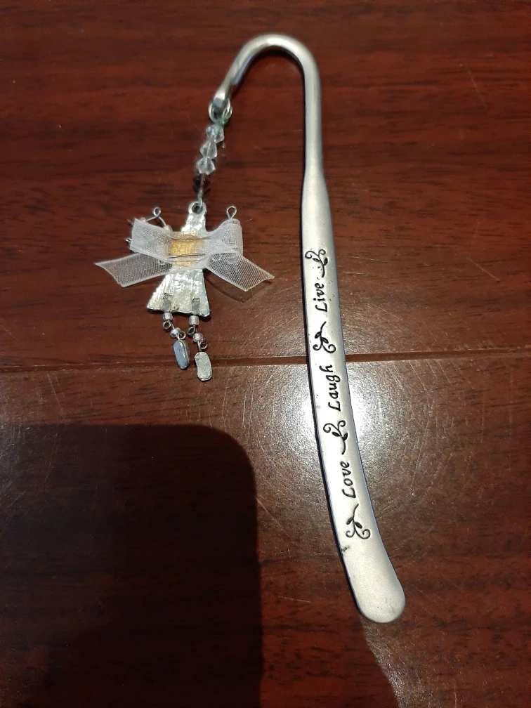Silver metal bookmark. Features an angel charm and the words "Love, Laugh, Live". Unique and lovely. Pick up Scarborough.