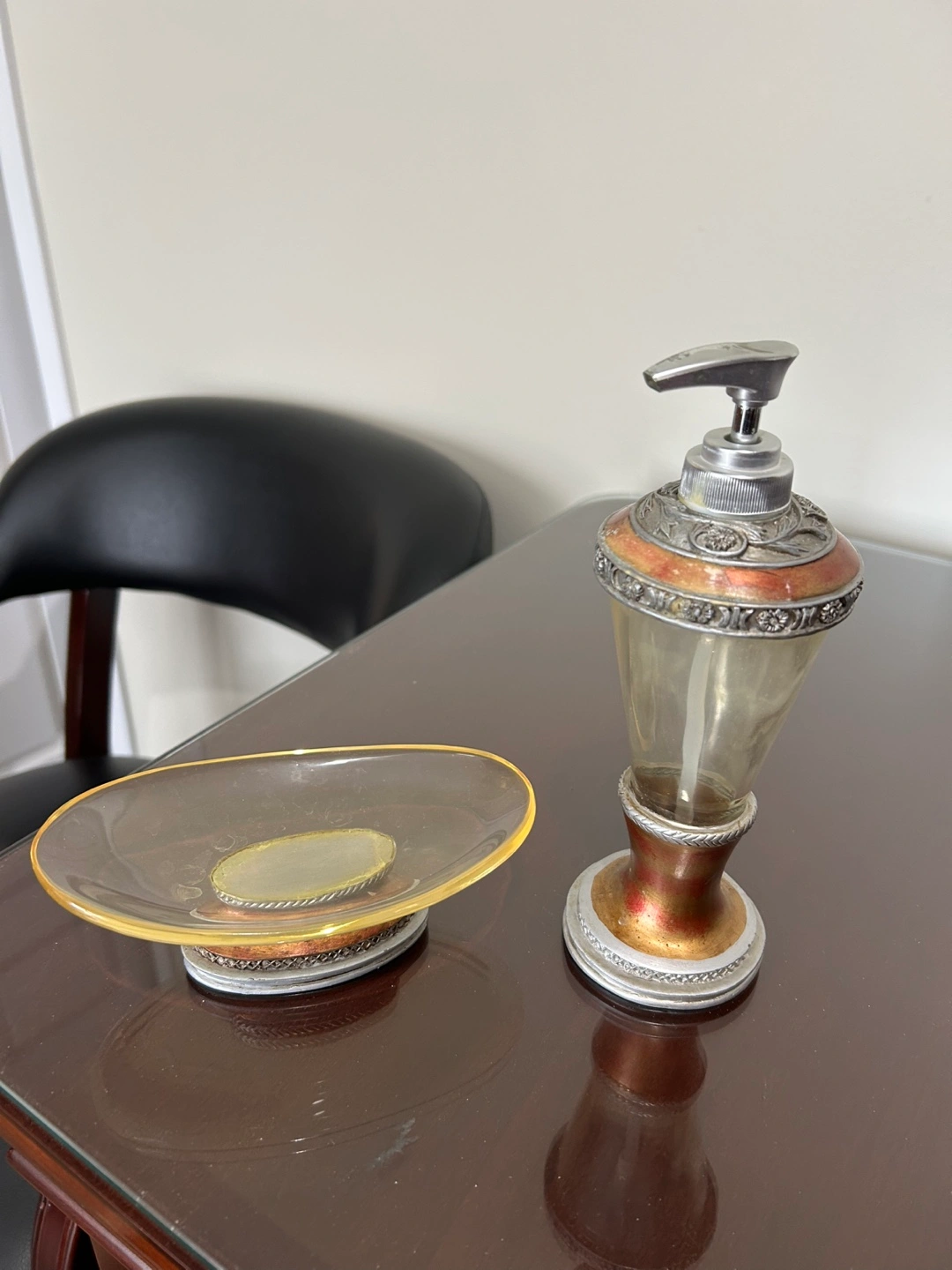 Beautiful bathroom set. Features an oval soap dish and a lotion dispenser. Both pieces boast an ornate metallic base and accents. Clear glass components.