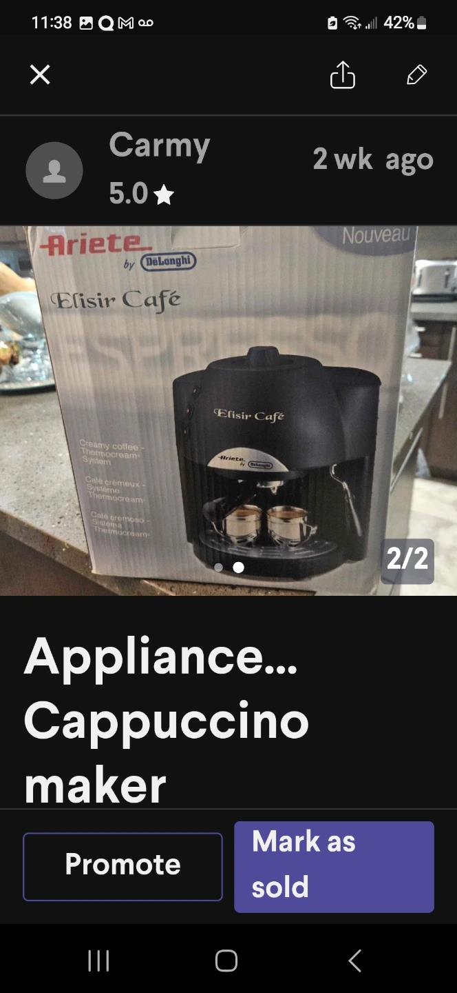 New in box cappuccino maker. Creamy coffee system. Makes delicious cappuccinos.