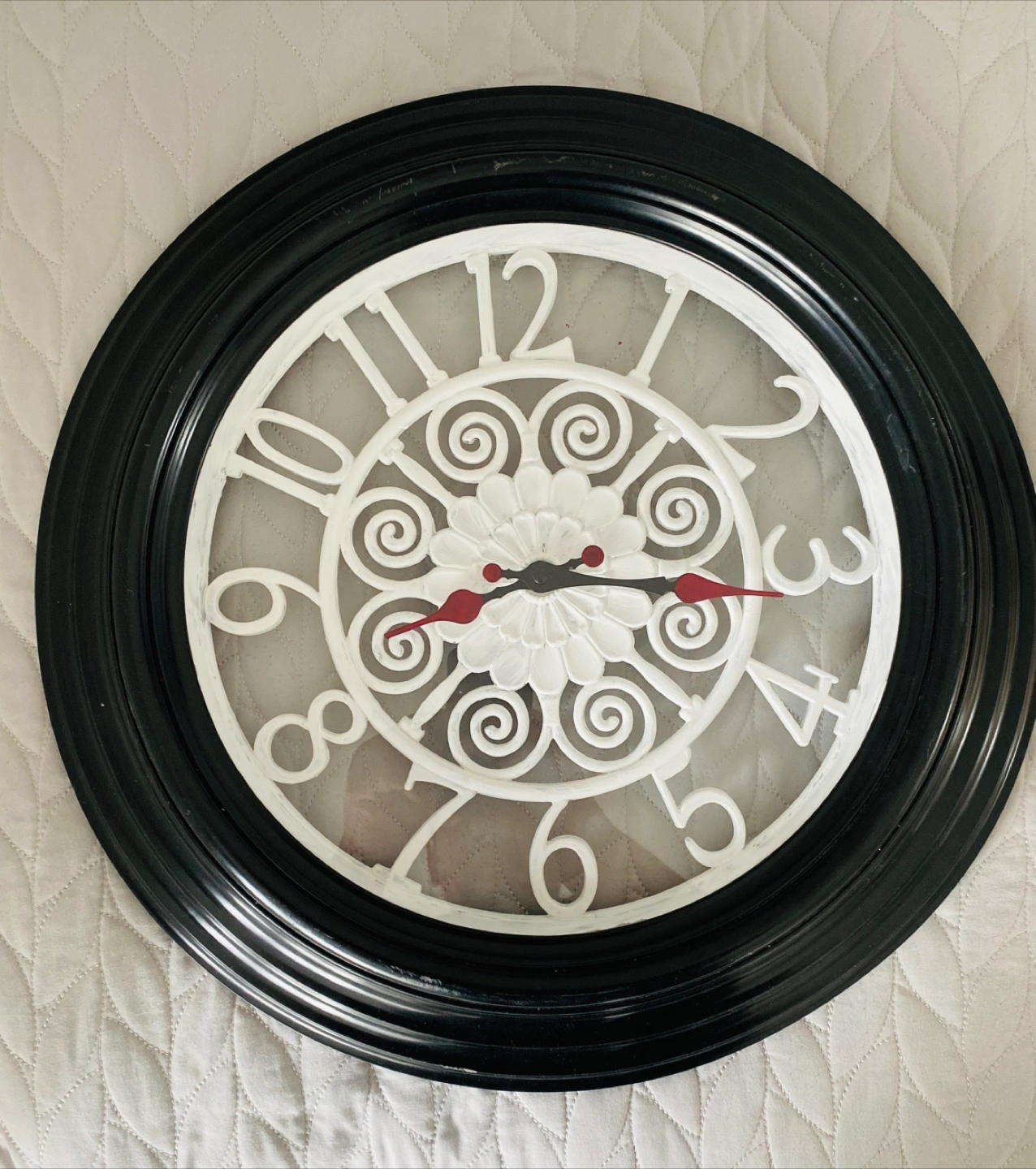 Large round wall clock. Black frame, white face. Intricate design. Quartz movement.