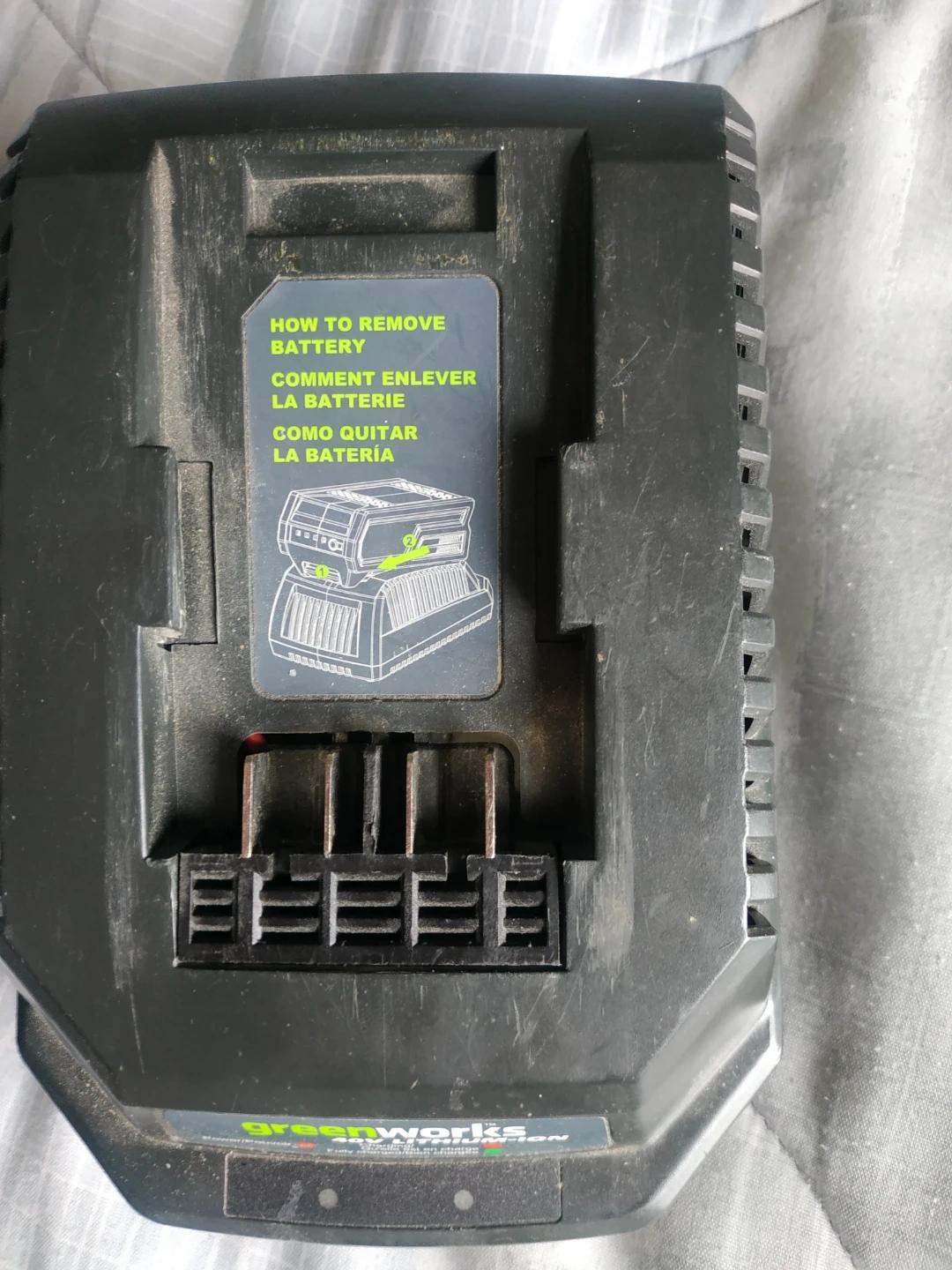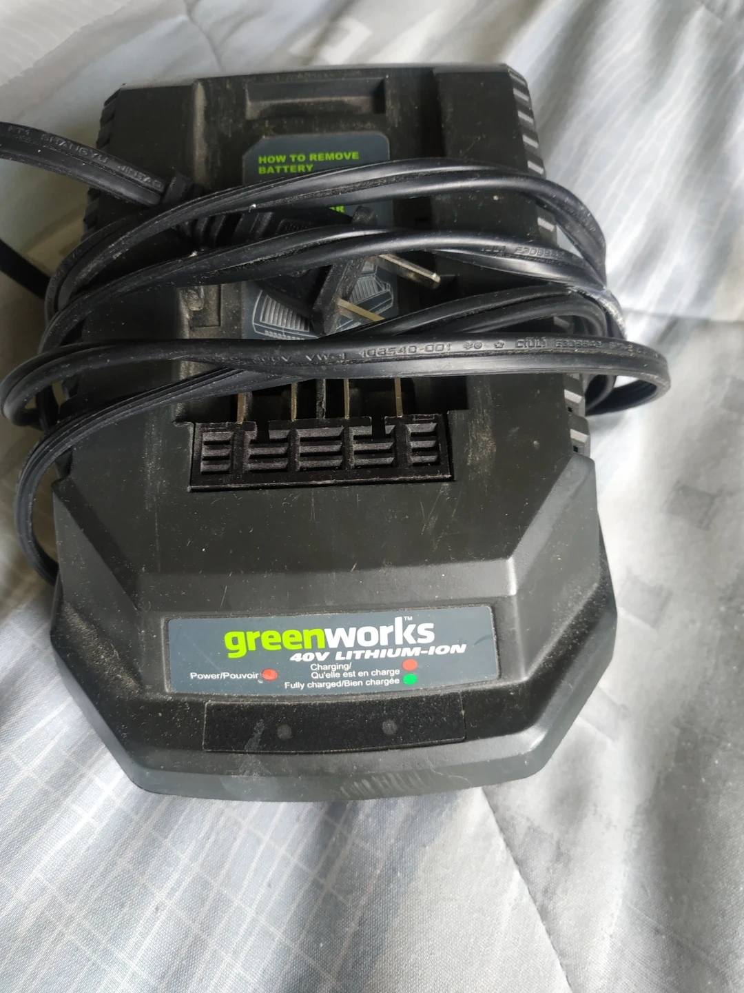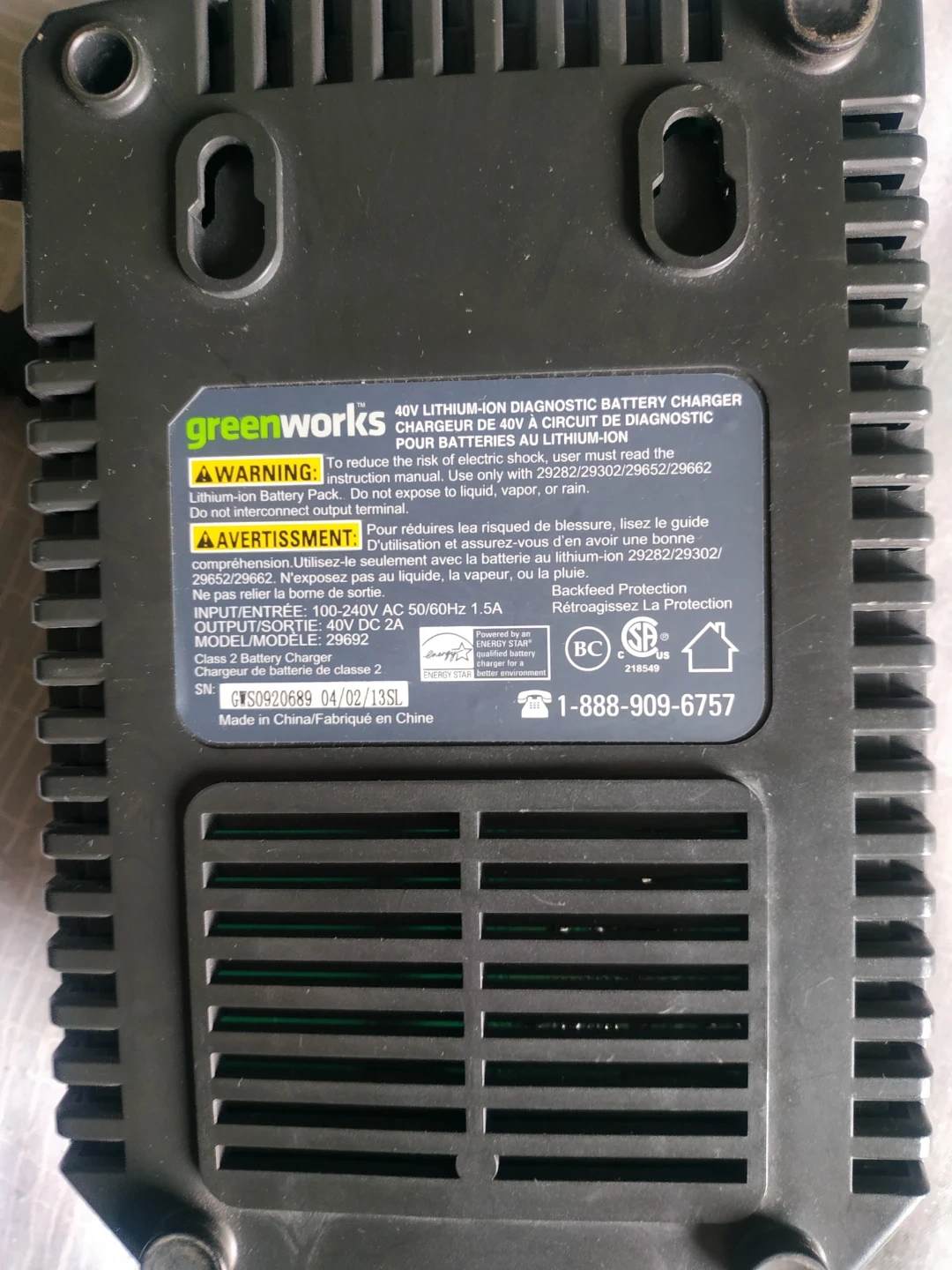 Greenworks battery charger. 40V lithium-ion. Includes power cord. Diagnostic charger.