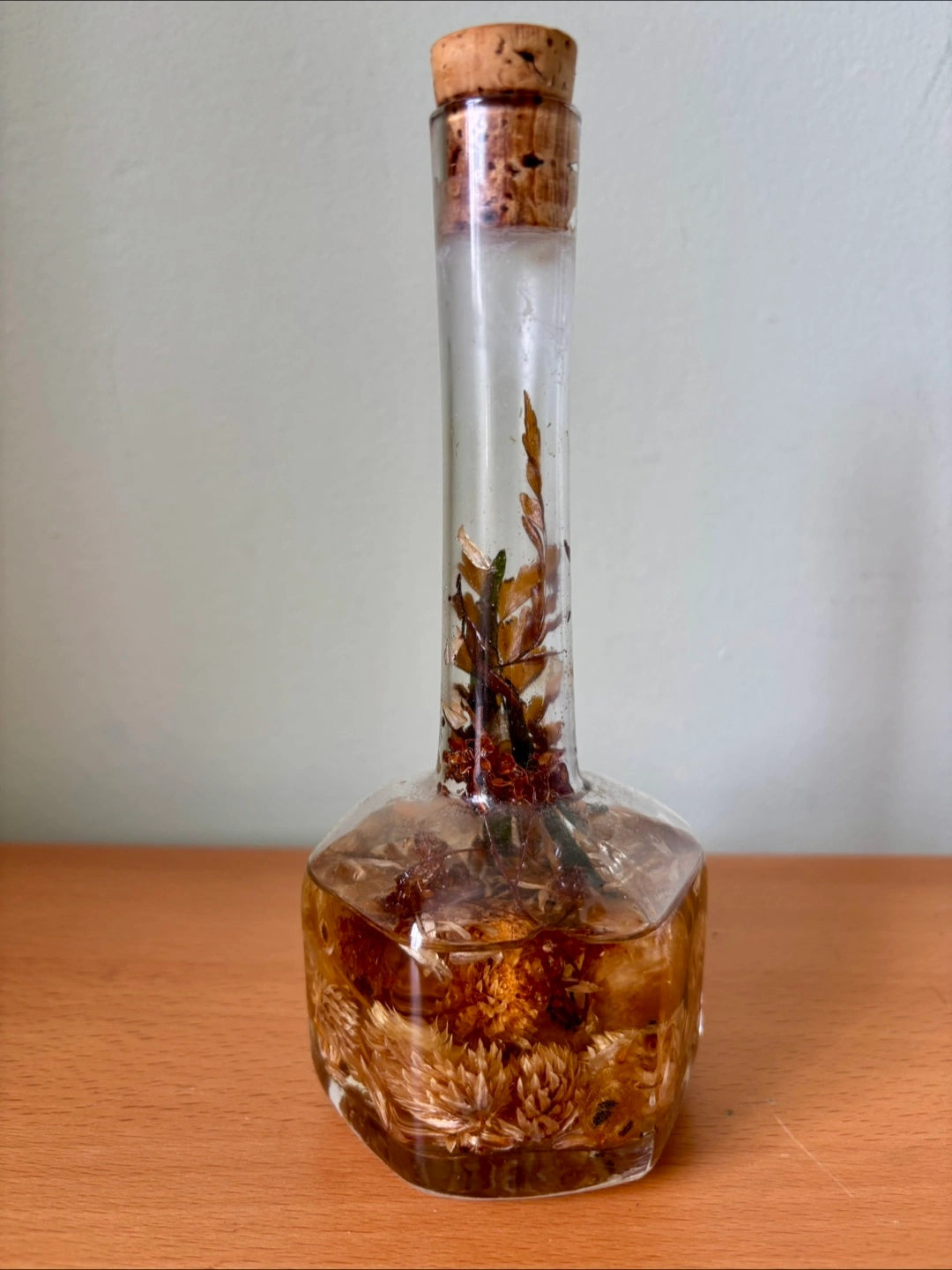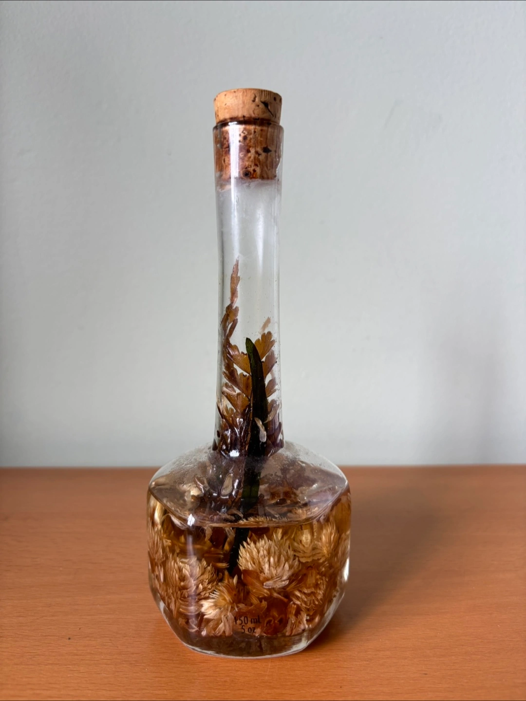 Small glass bottle with cork stopper. Contains dried flowers and plants preserved in scented liquid. Unique decorative piece. Approximately 150ml, 6 3/4β tall. Click on my name and scroll down to see my other listings and pickup locations.