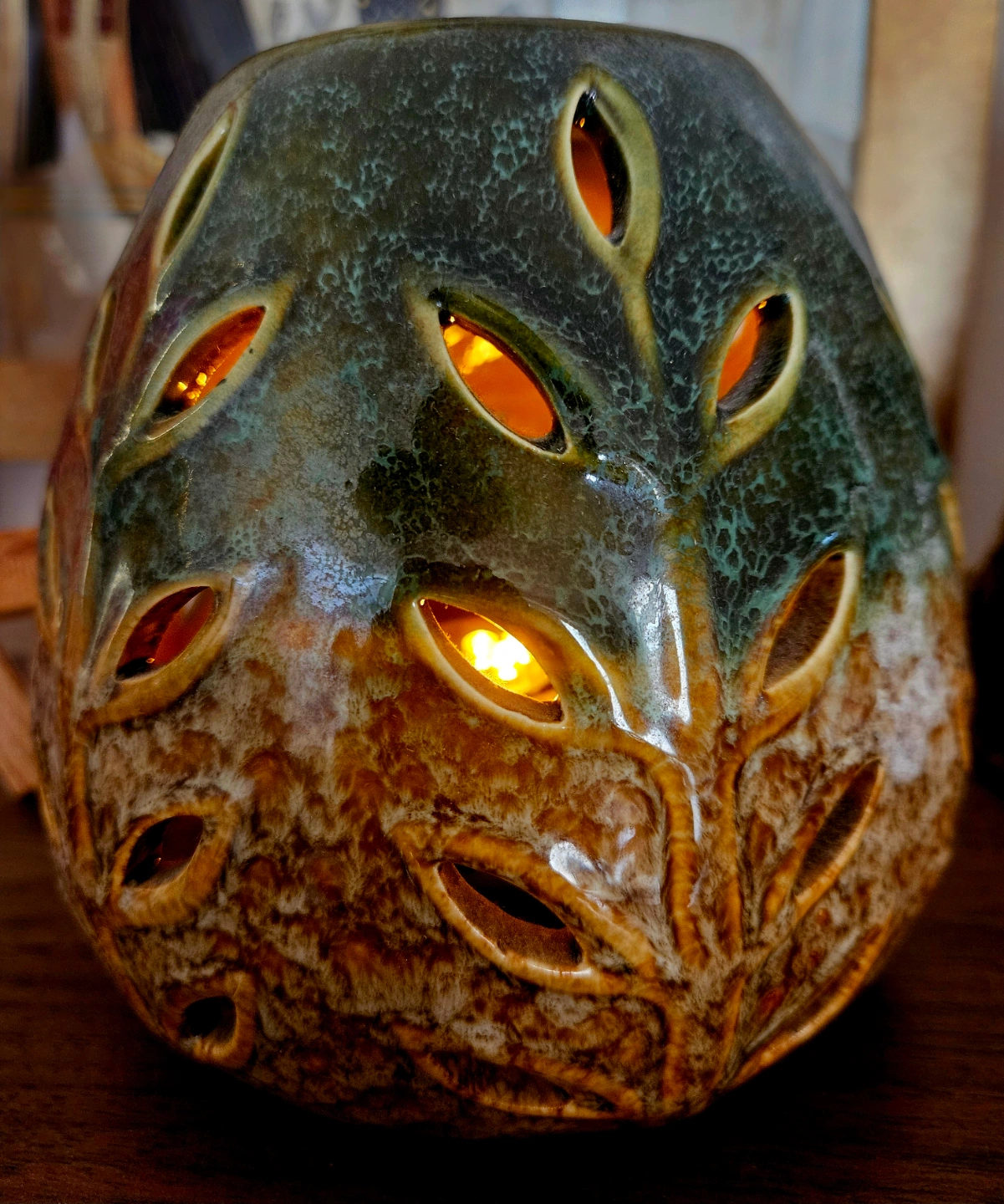 Ceramic wax warmer. Unique leaf design. Model WG510011. Made in China. Subtle light illuminates the warmer when in use.
