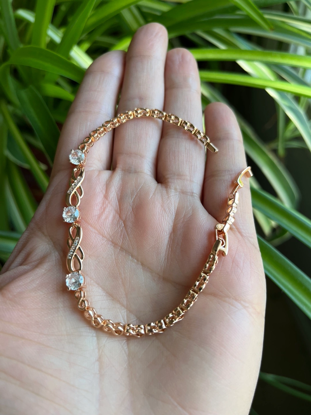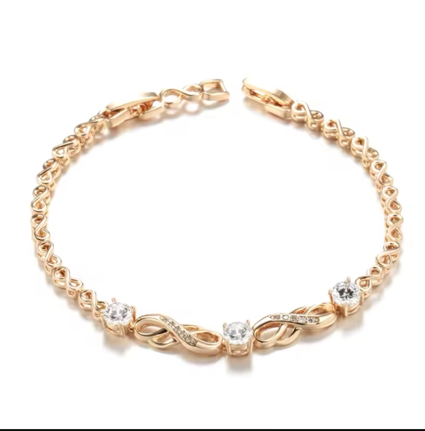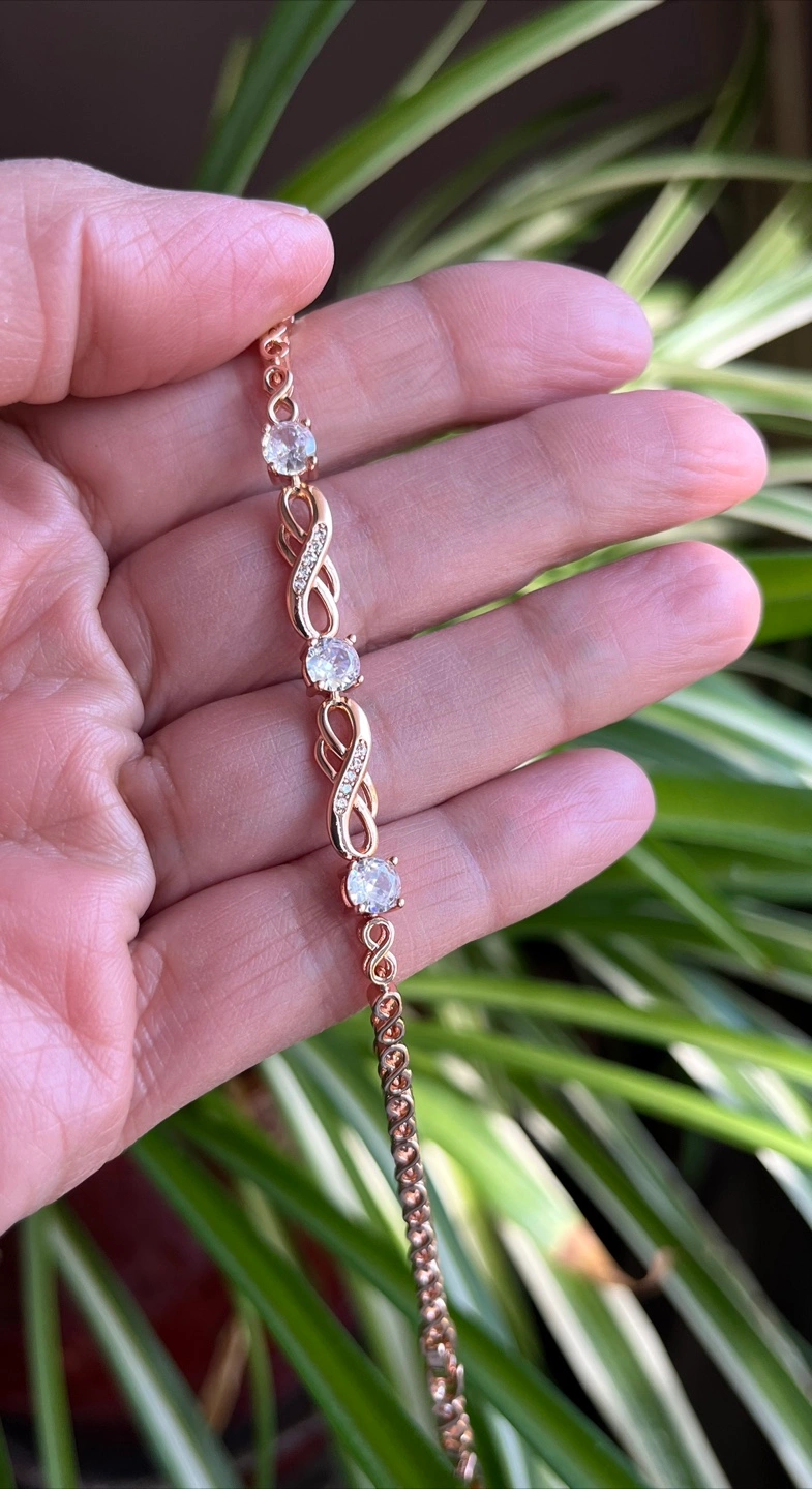 Elegant rose gold bracelet. Features infinity symbol accents and zircon stones. Lobster clasp closure. Approximately 18cm in length.