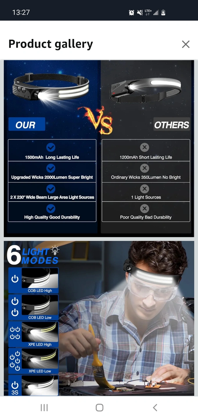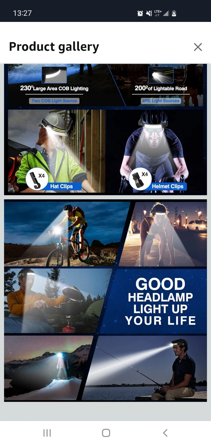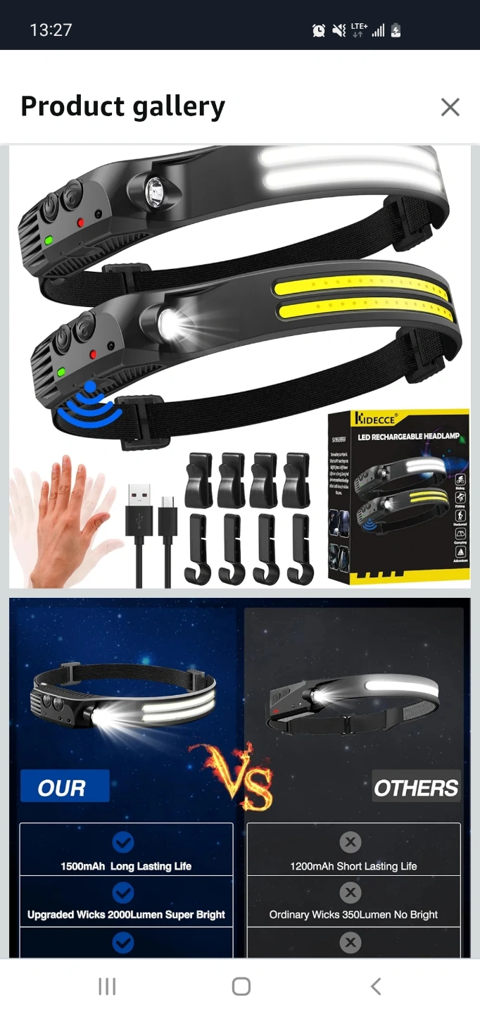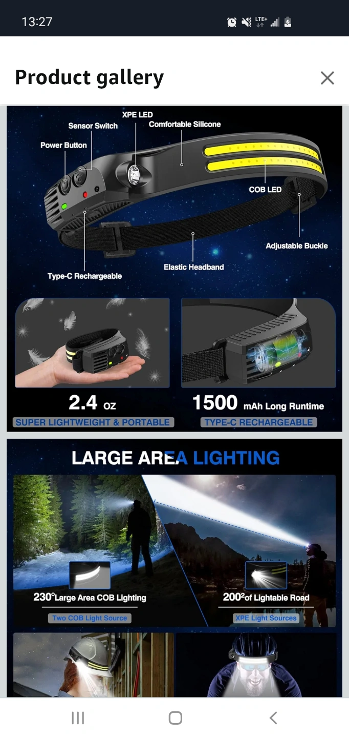 Rechargeable headlamp with 6 light modes. Features 1500mAh battery, USB-C charging, adjustable headband, and multiple clips. Great for various activities. Lightweight and portable. BRAND NEW