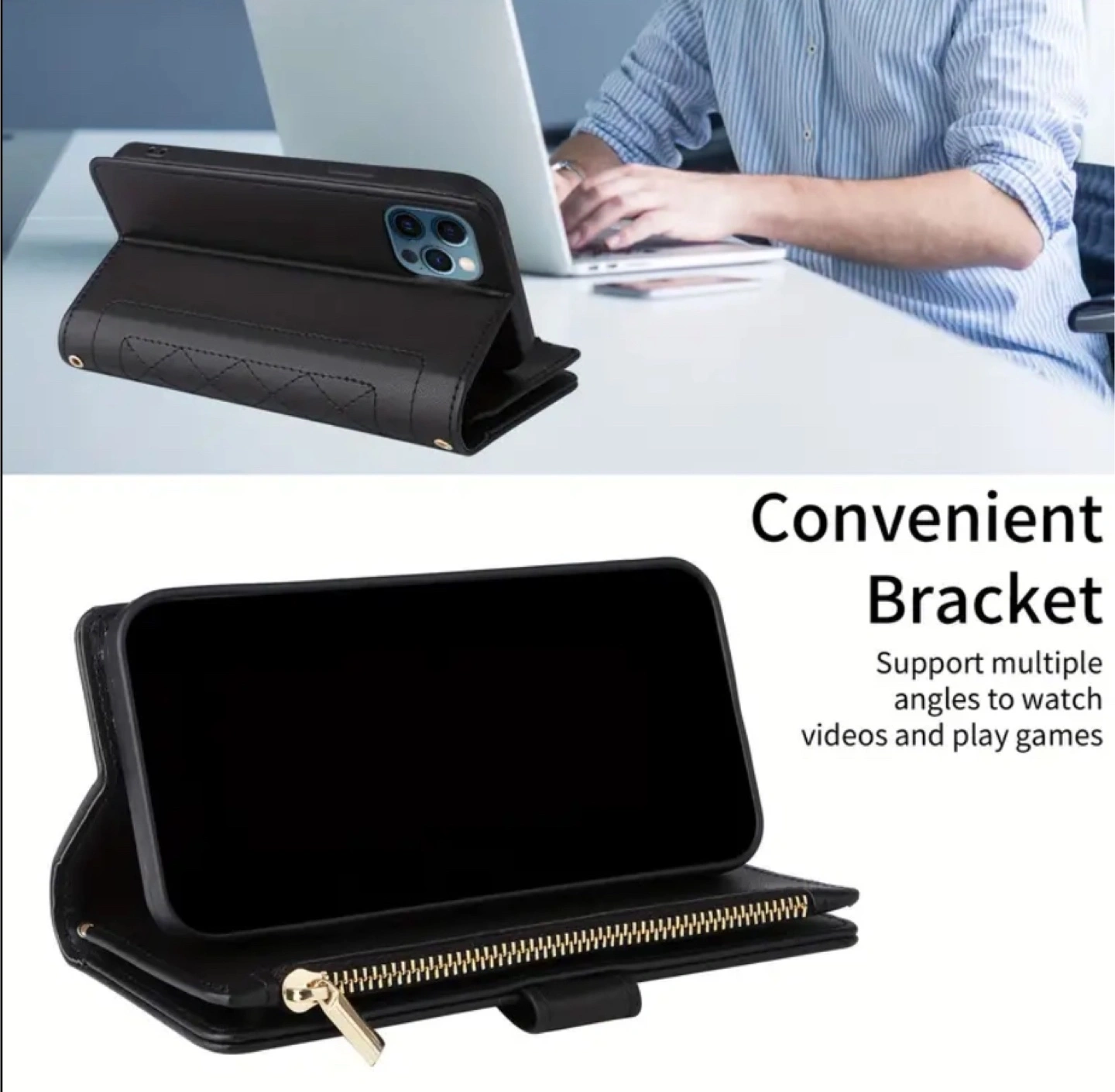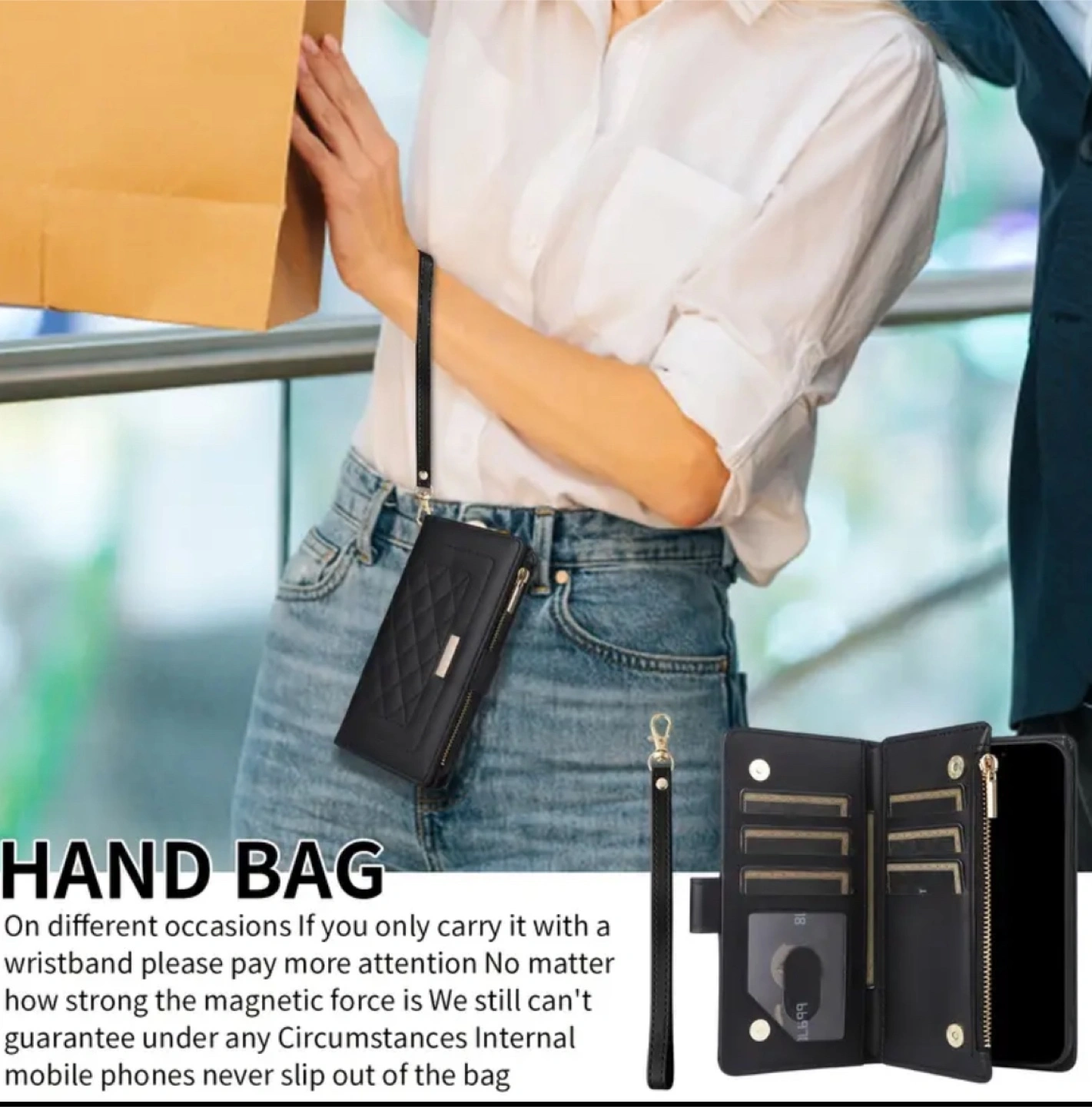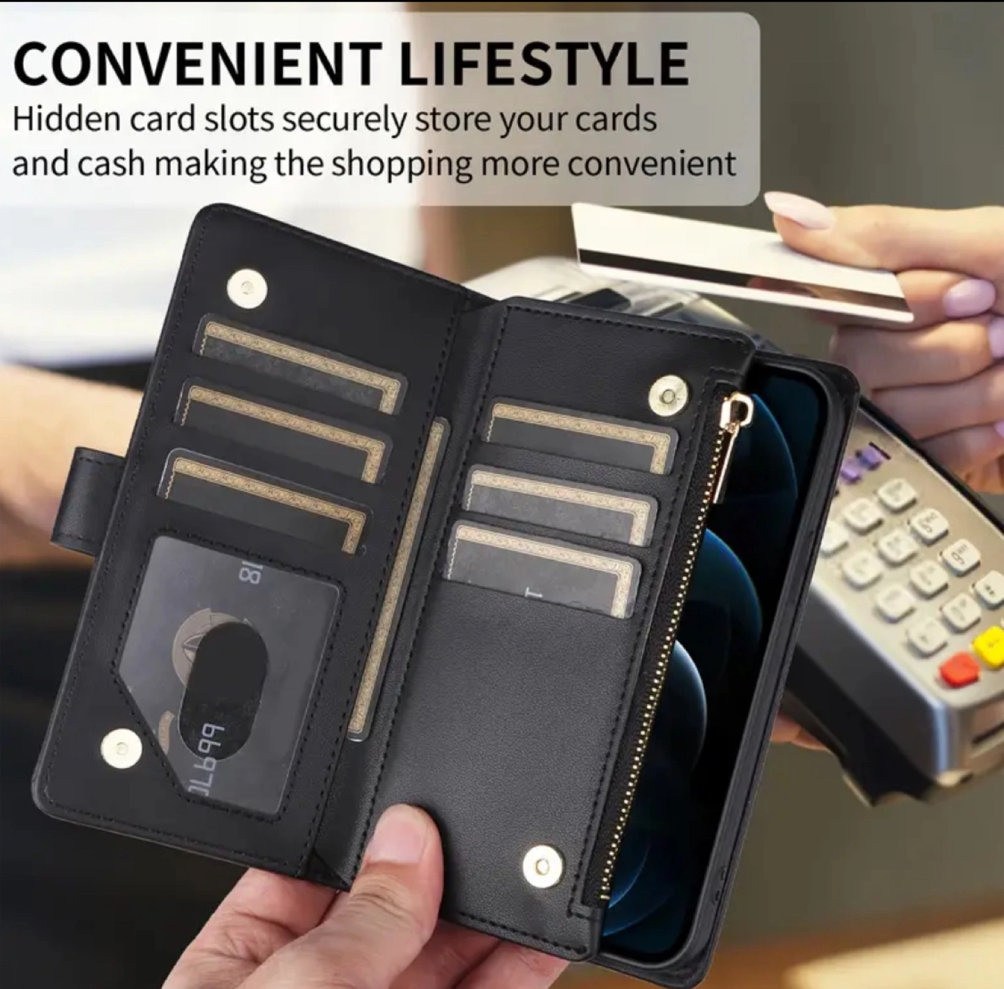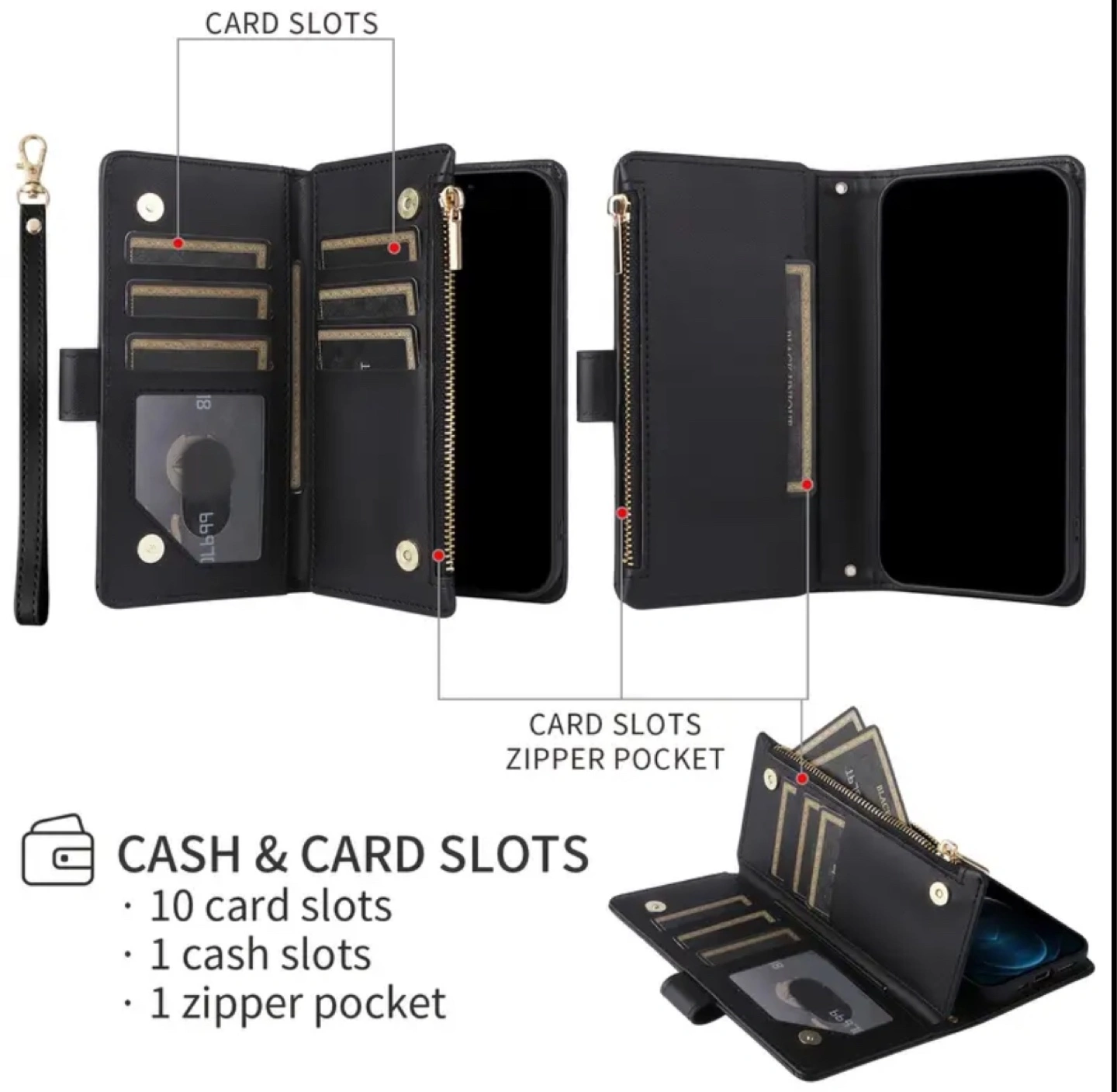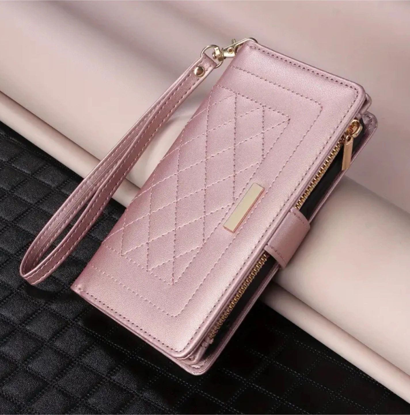 New. Phone case and wallet combo. Features zippered pockets, card slots, and wrist strap. Rose gold and black colours available. Designed for iPhone 14 Pro Max.