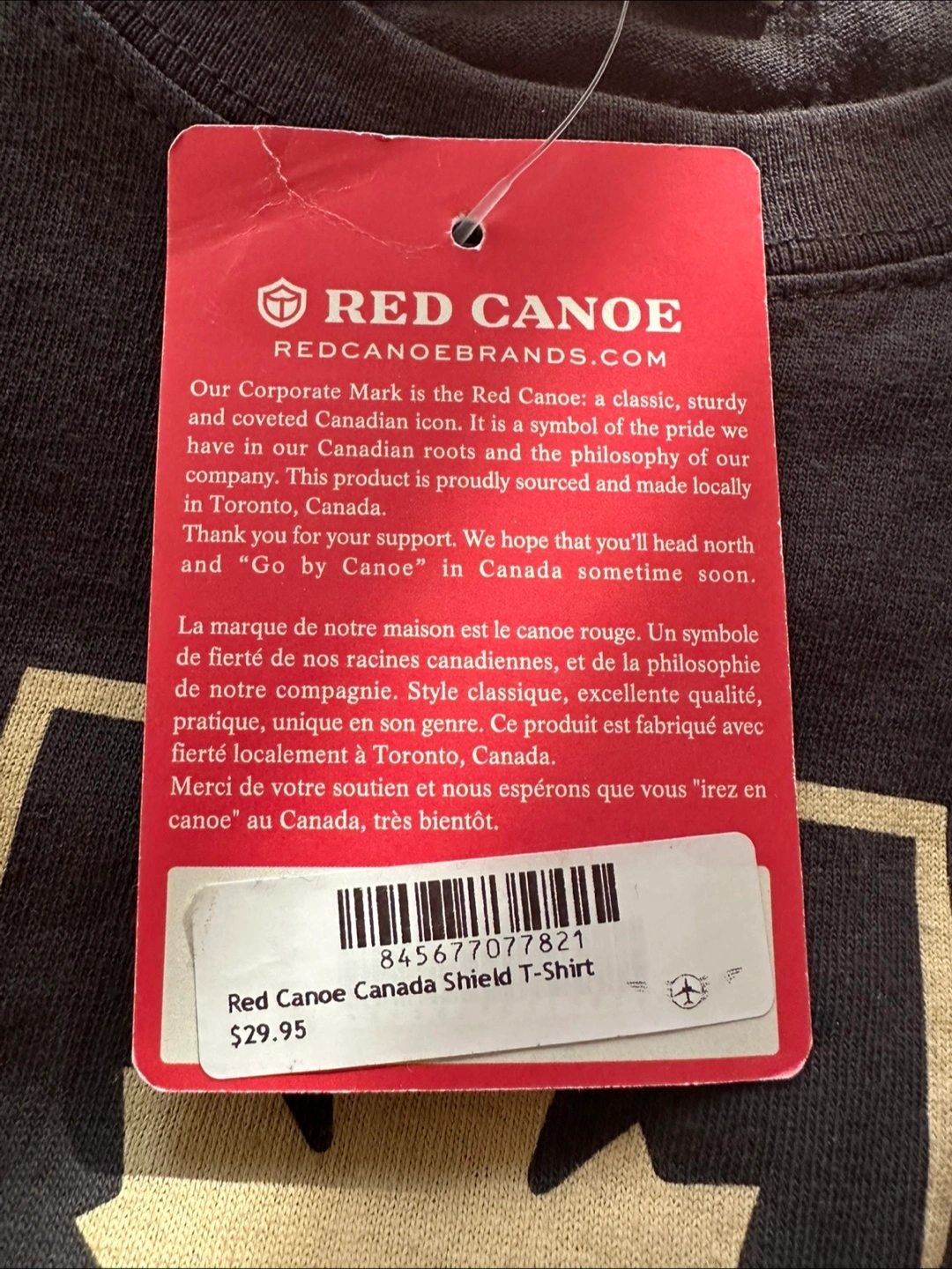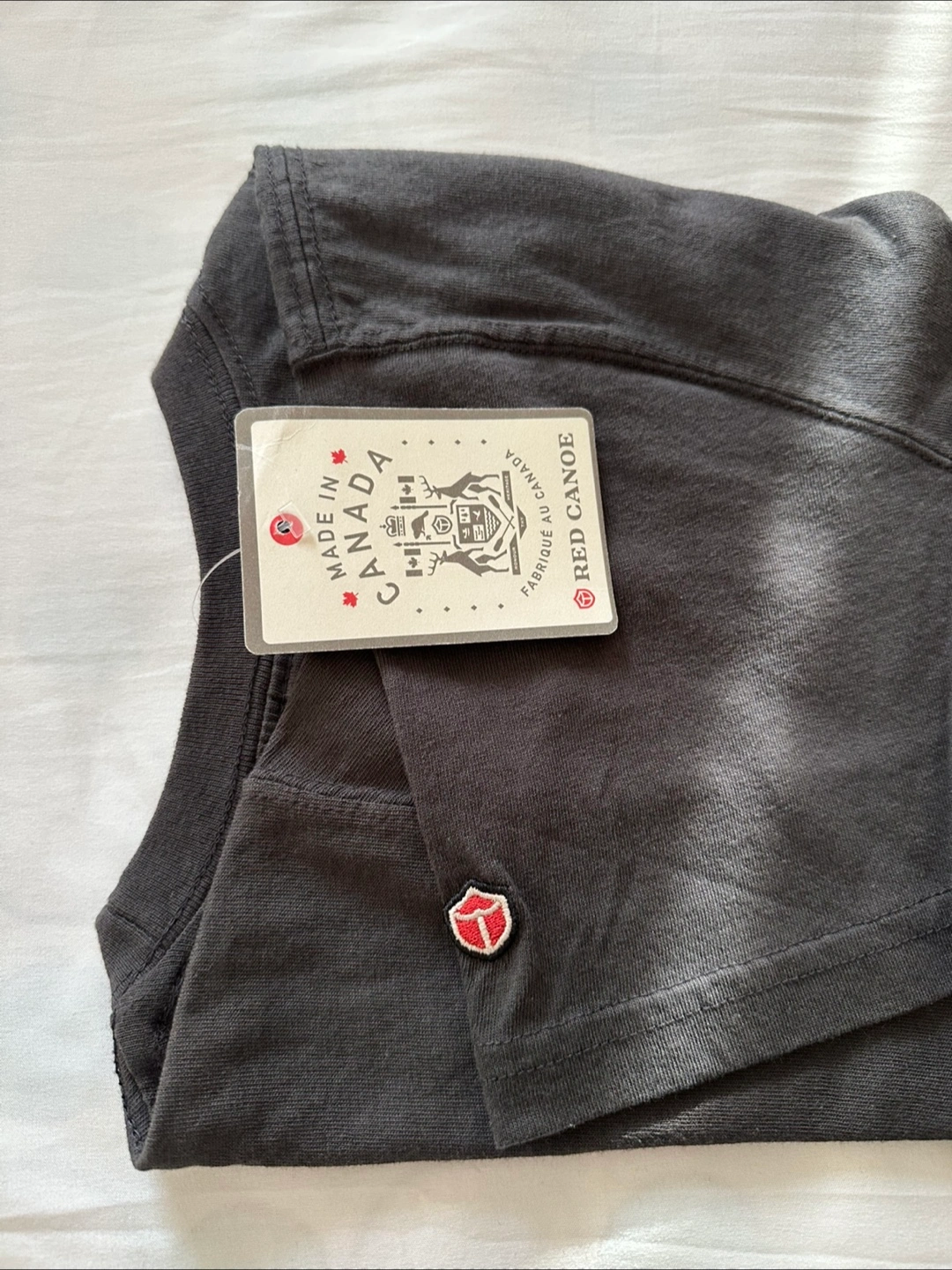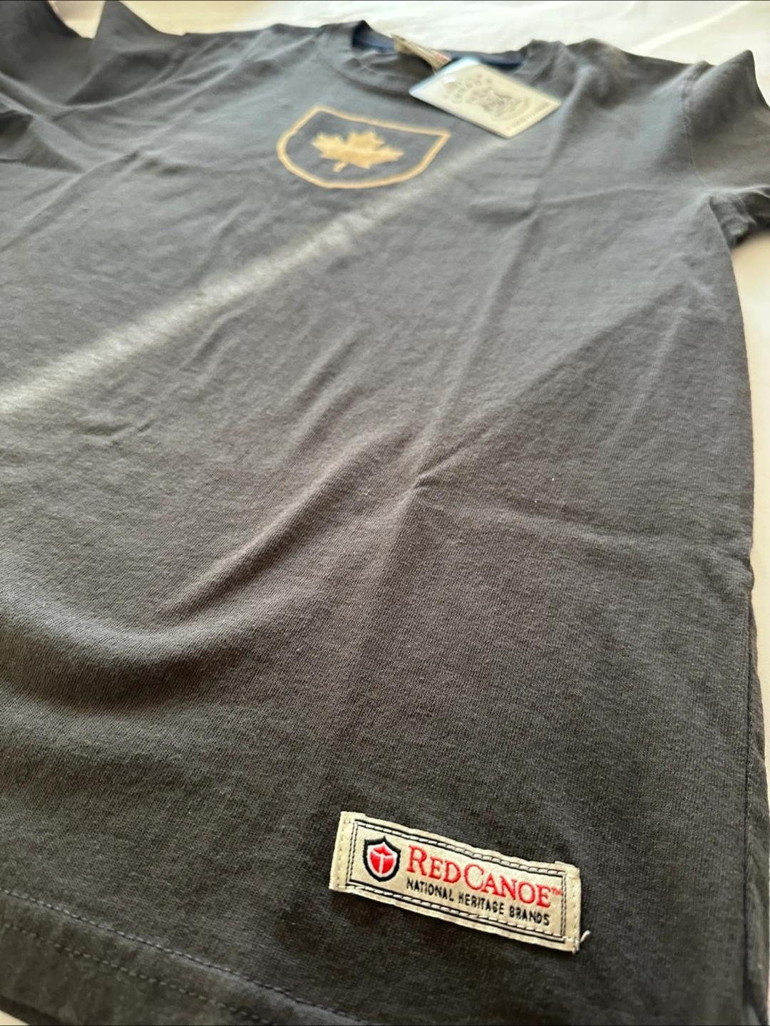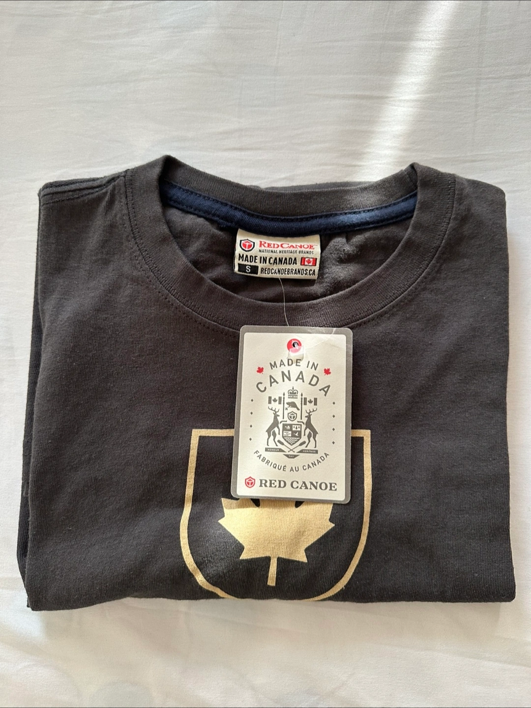 Men's Red Canoe t-shirt. Dark grey colour. Features a gold Canadian shield logo. Made in Canada. Size small. New with tags. Retail was $30. I am asking for half. Price is firm. Pick up near Scarborough Town Centre.