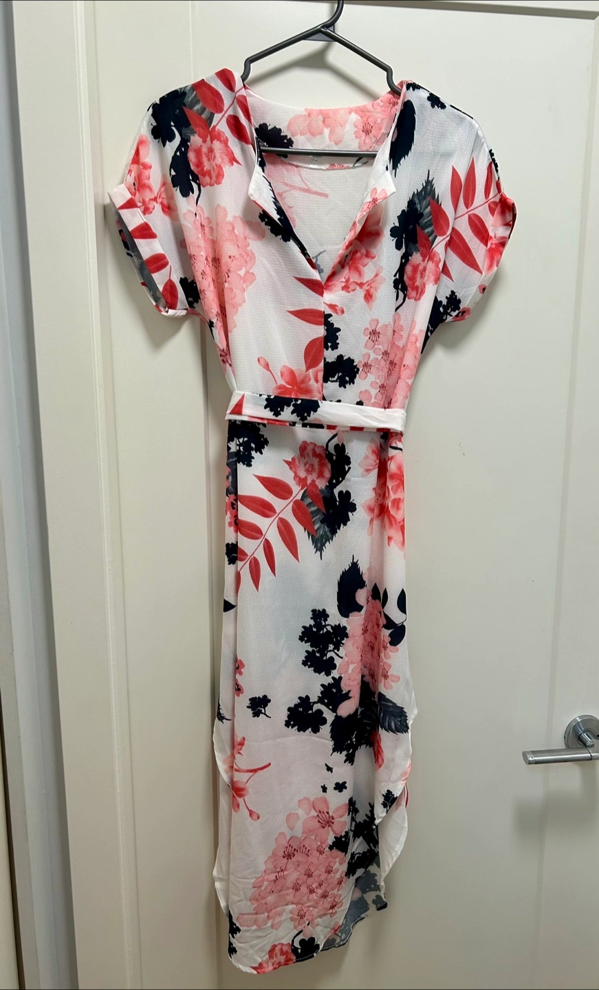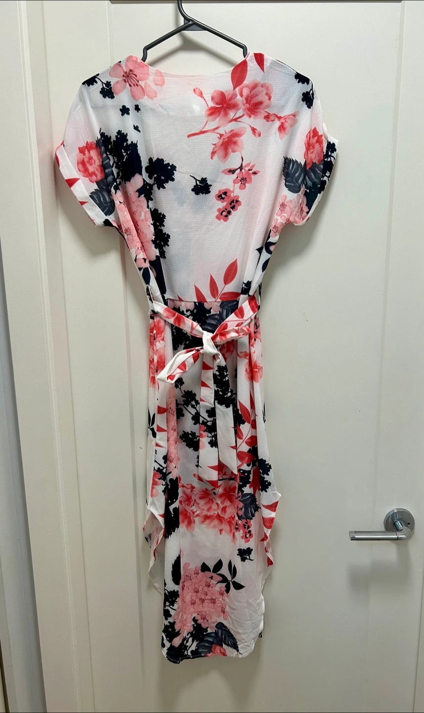 Women's casual dress. Features a floral print, short sleeves, and a self-tie belt at the waist. Lightweight and flowy fabric. Perfect for spring or summer.