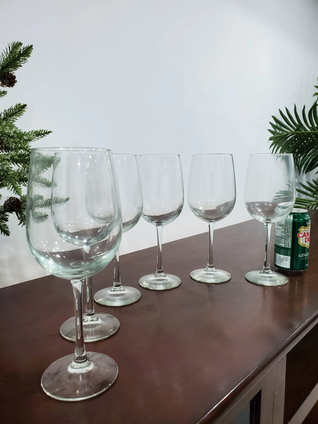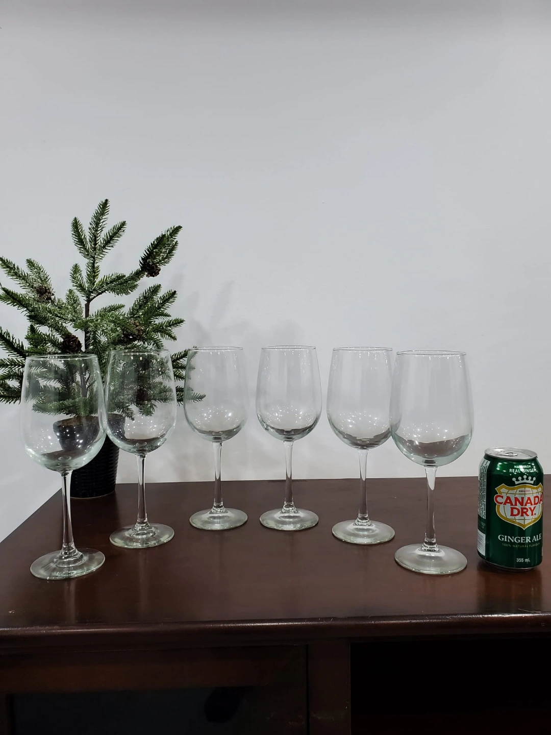 six clear wine glasses. Perfect for entertaining. Simple design. Excellent condition.