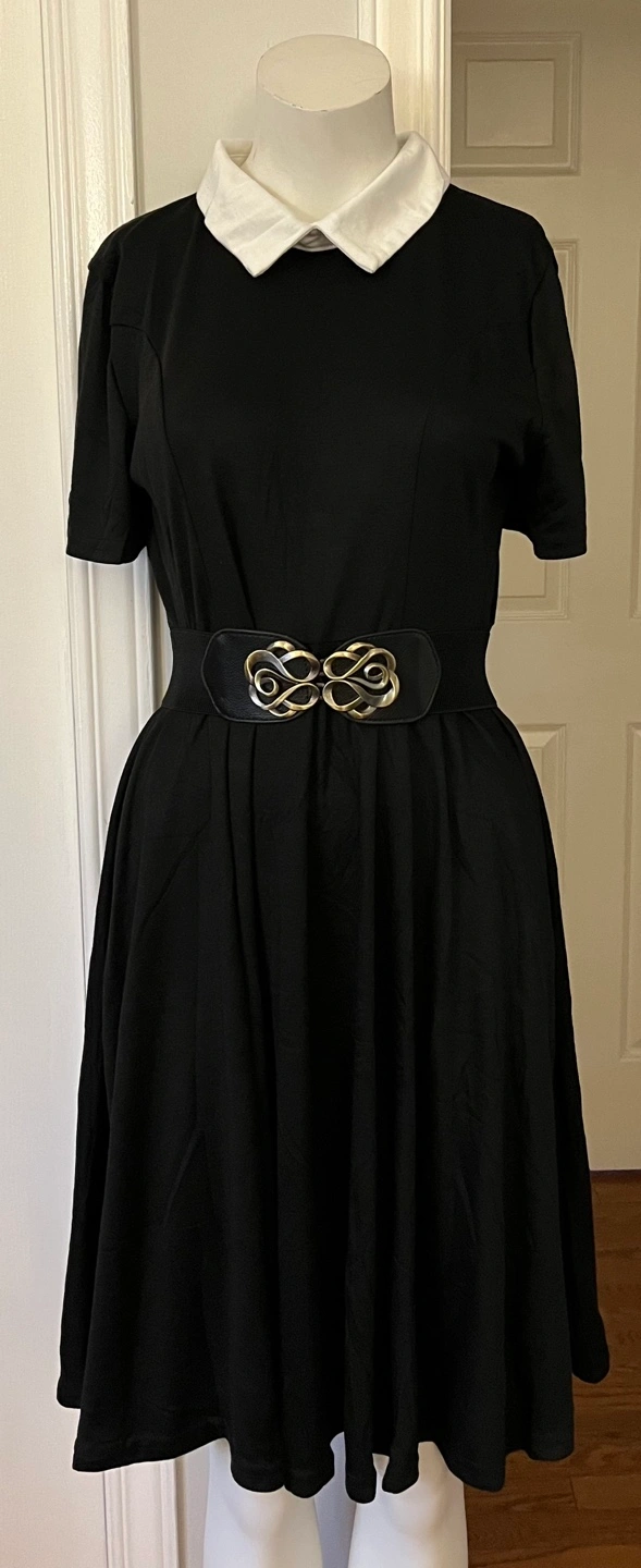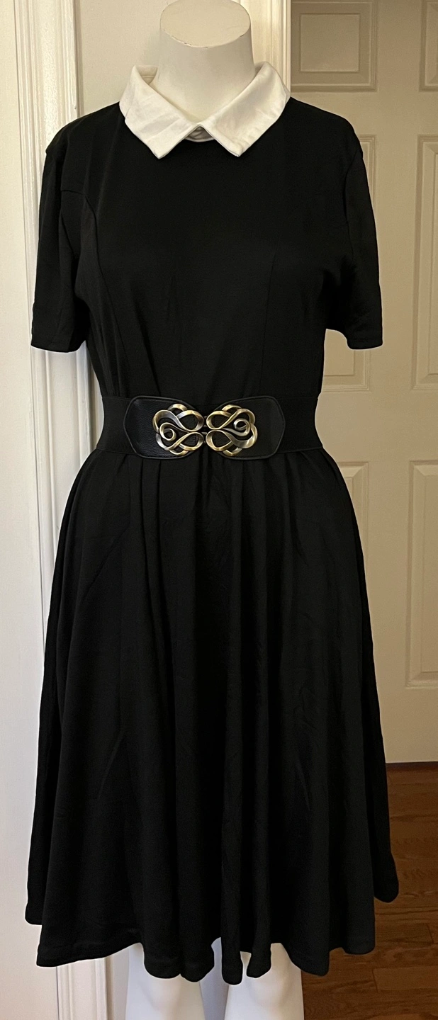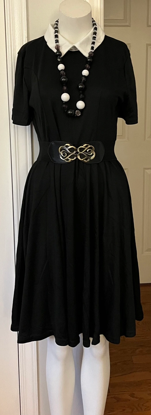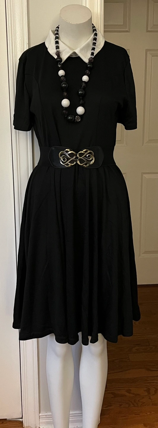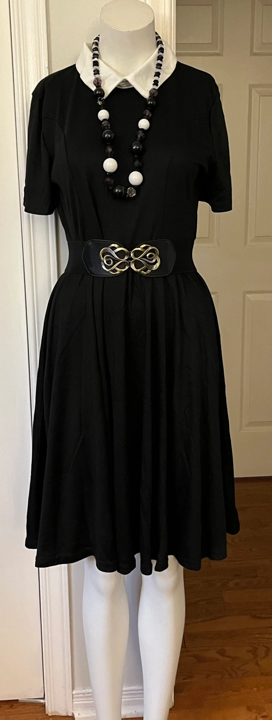 Cute black skater dress. white Peter Pan collar ,Short sleeves. Great for everyday wear or special occasions.
