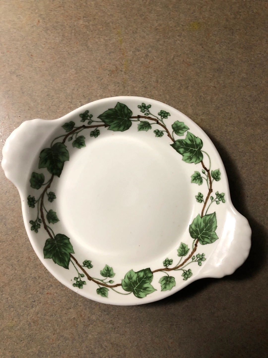 Small porcelain serving dish. Features an ivy leaf design. Two handles. Made in France.