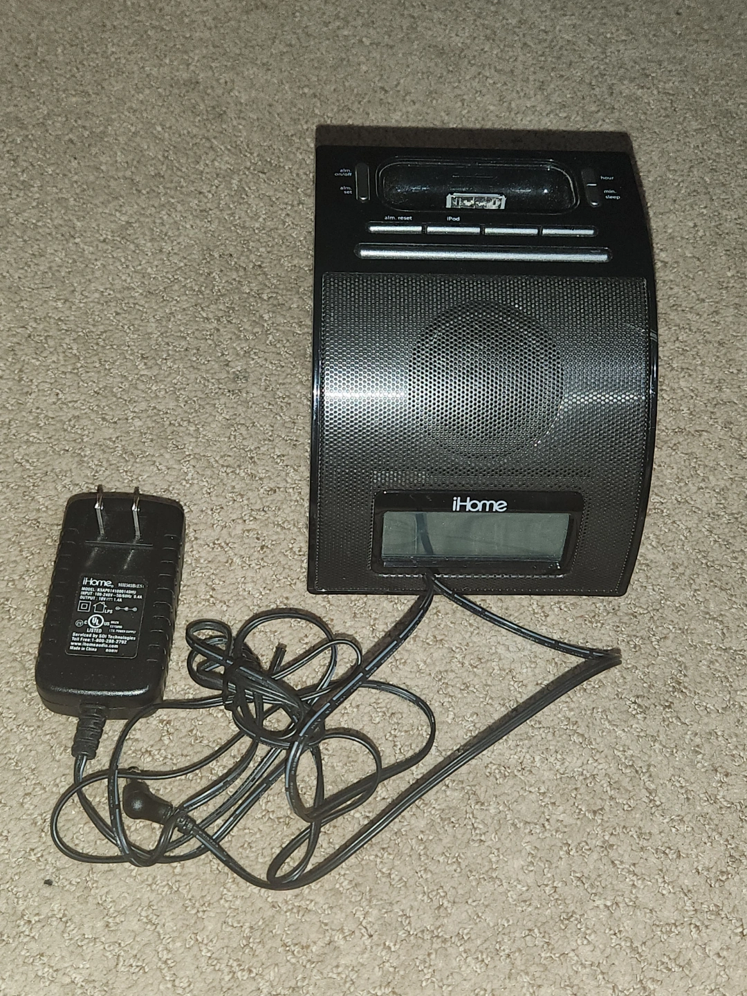 Black iHome clock radio. Features an iPod dock, alarm clock, and sleep timer. Includes power adapter. Used condition.