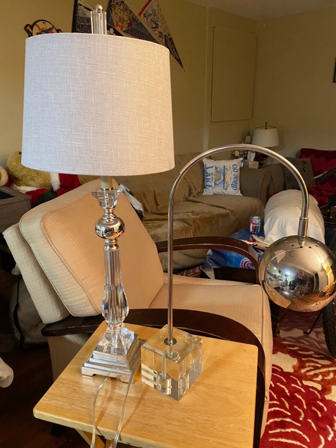Perfect for university or college students living away our first time movers out of the house. Two stylish table lamps. Chrome bases and crystal accents. One features a flexible gooseneck arm and spherical shade. The other has a classic design with a fabric shade. Minor wear consistent with age and use. Chip out of the bottom seen in 2nd picture and reflected in price.$12.00 each or 2 or $20.00. PICK UP PICKERING WHITES RD & STROUDS LANE
