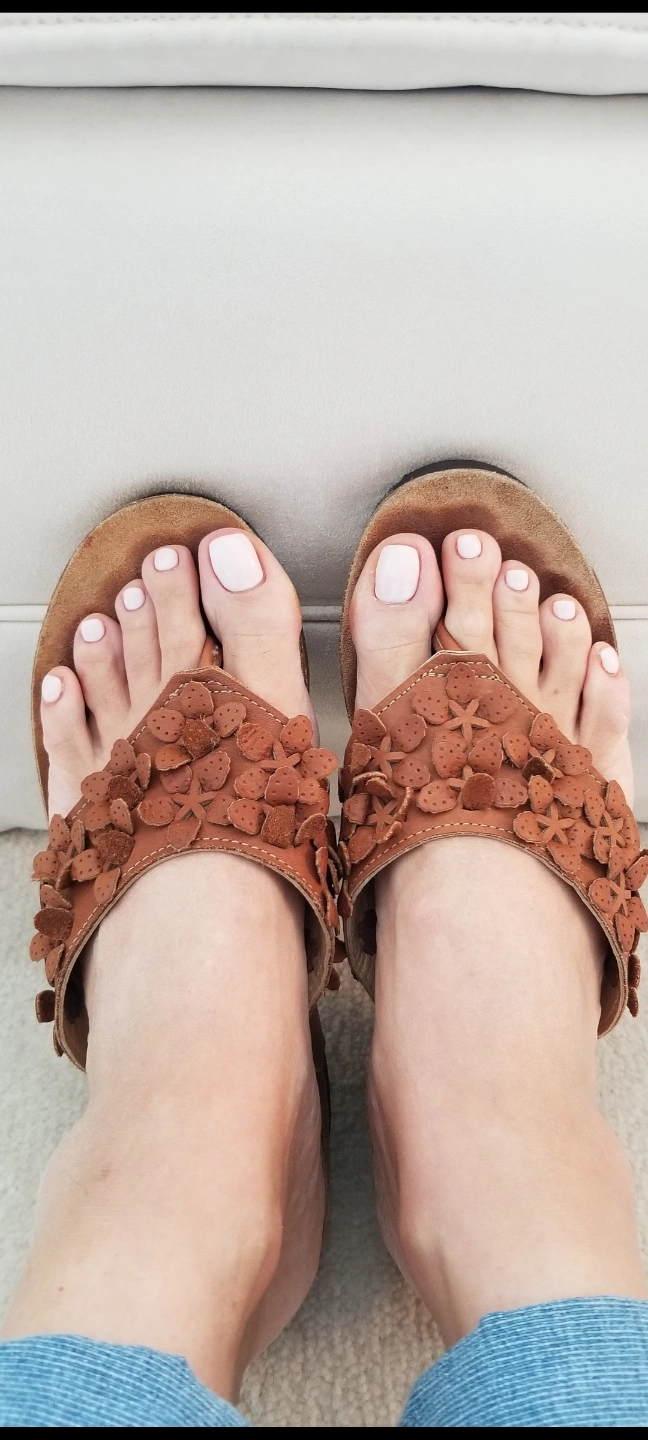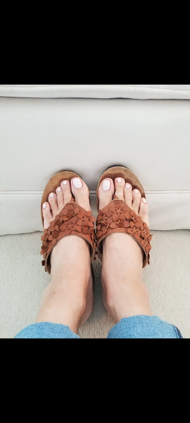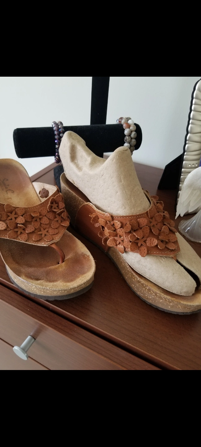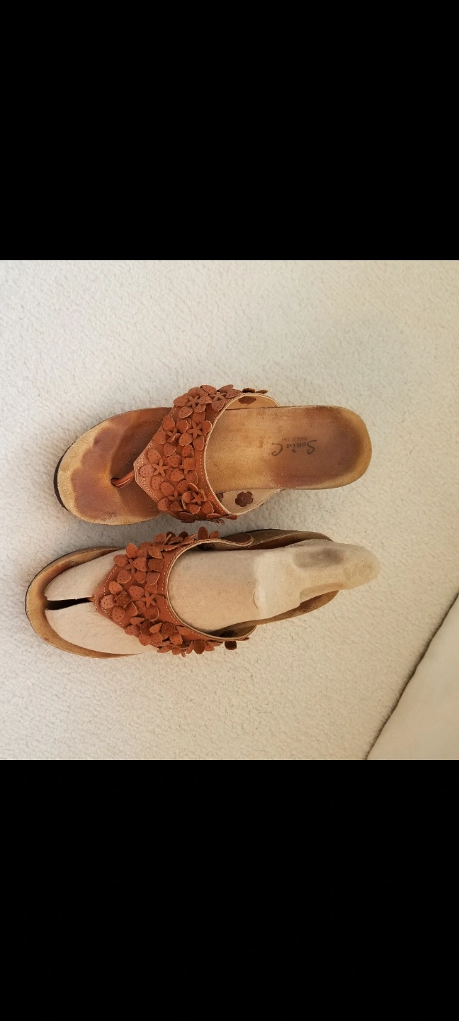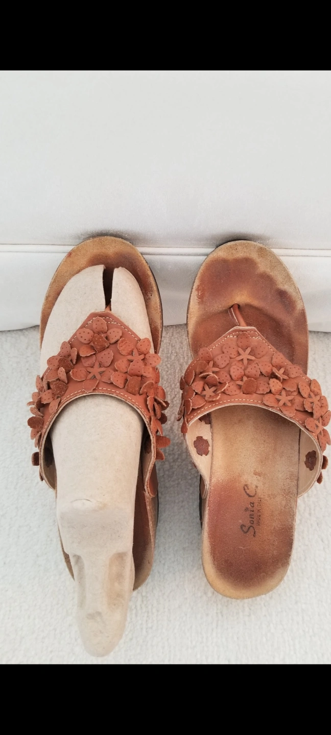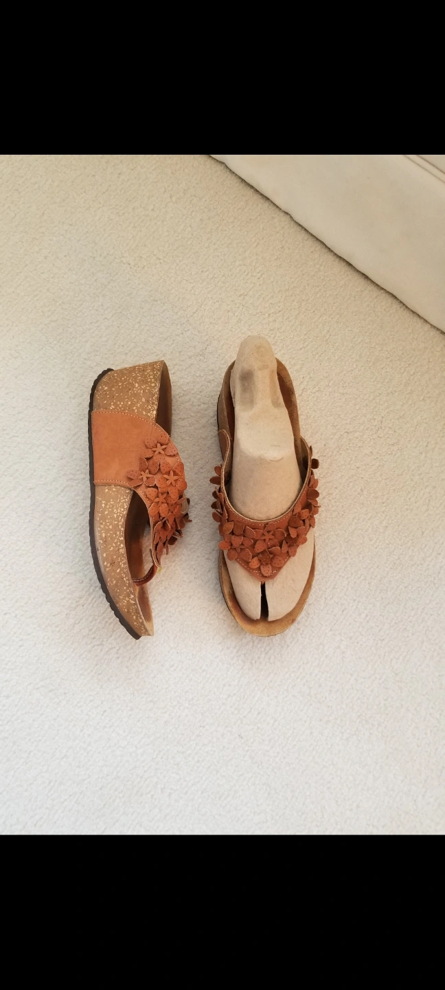 Wedge sandals. Honey Brown made in Italy soft leather upper. Flower accents. Very comfortable soft Cork soles. Size 8. Gently used.