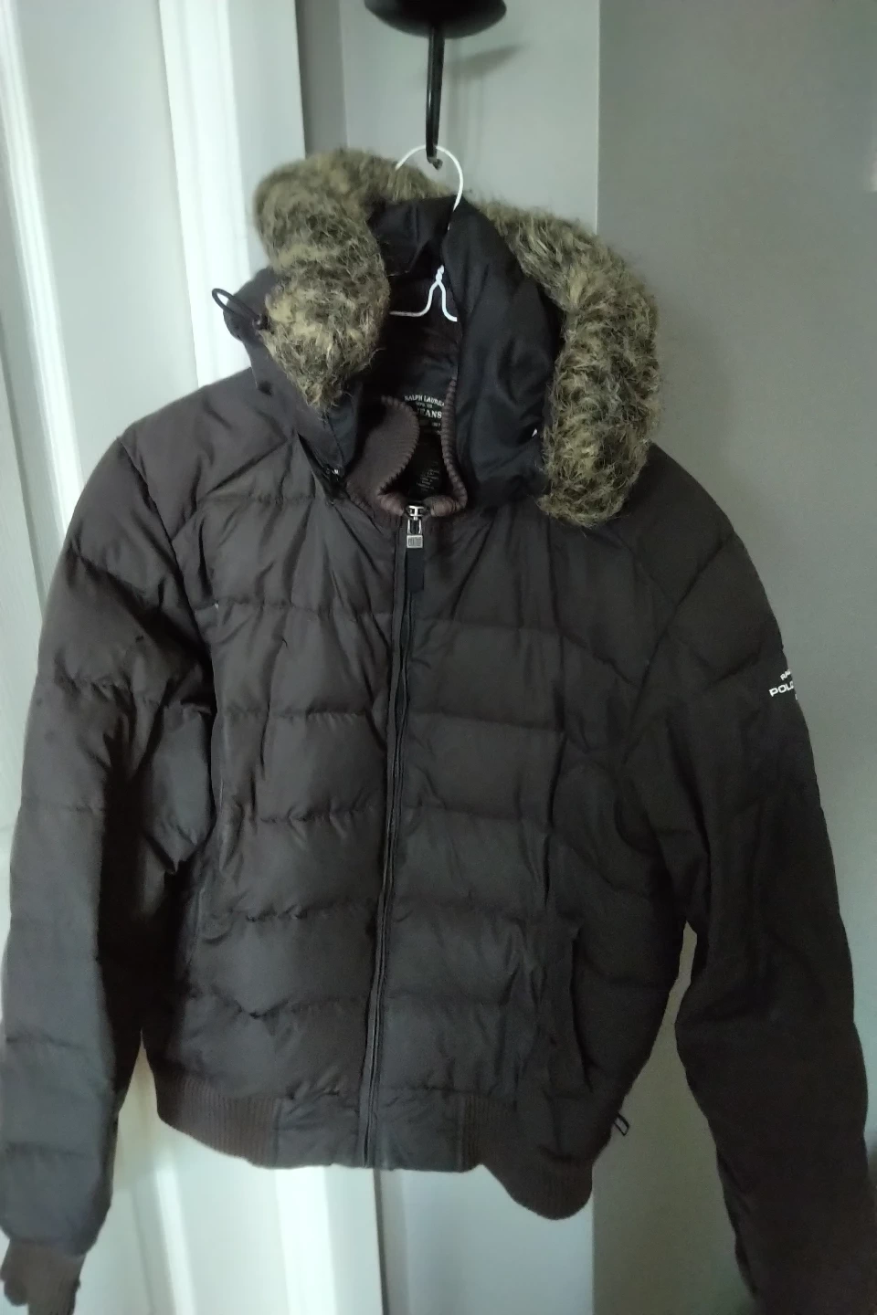 Men or women medium puffer jacket. black colour. Features a faux fur-trimmed hood and ribbed inner collar. Zipper closure. Down fill. Good condition. authentic,timeless polo puffer. stay stylish and warm !! sfpf home . pick up Weston rd@401 may accommodate at various locations within distance only.