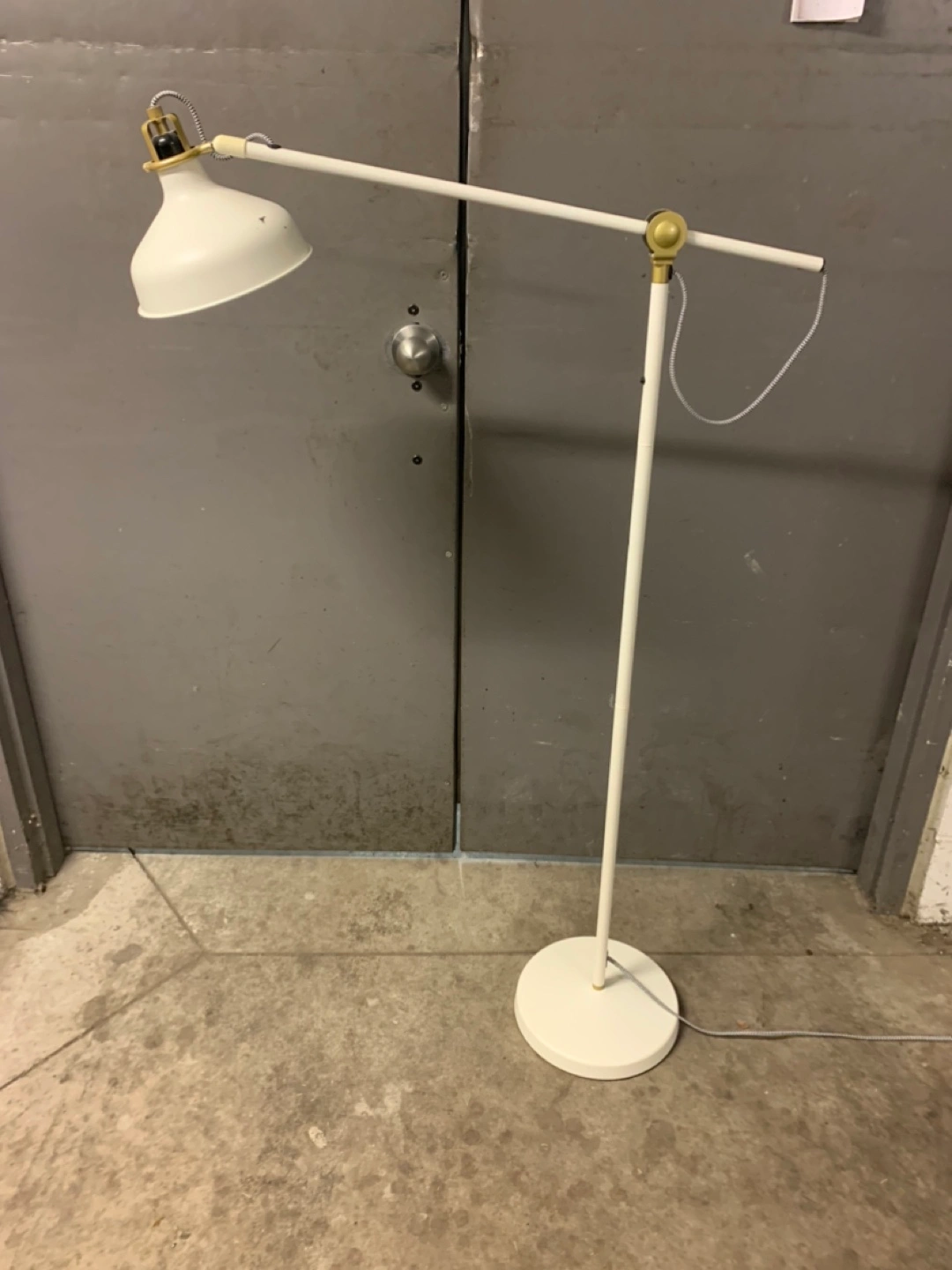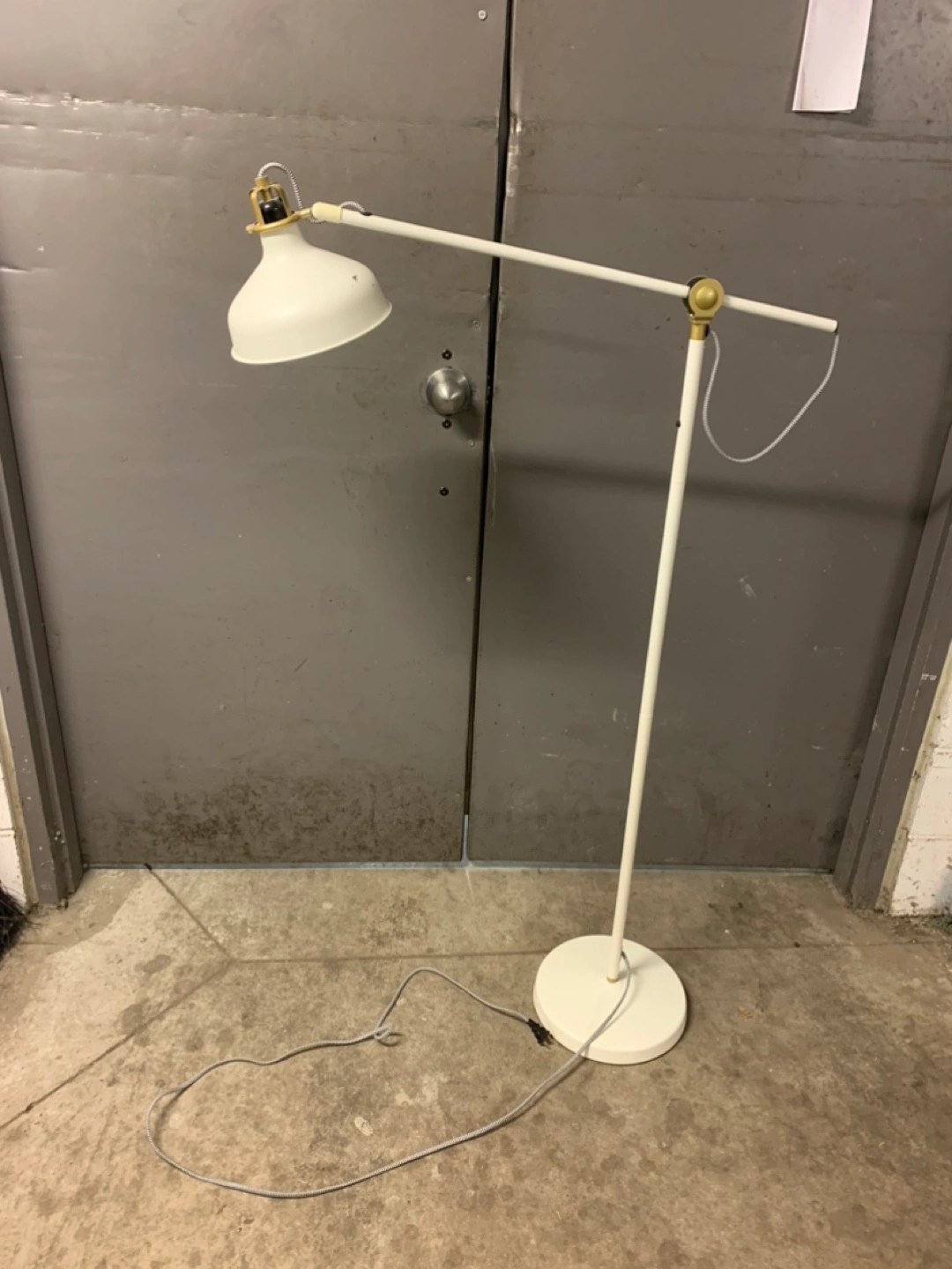 Industrial style floor lamp. Features an adjustable arm and a white shade. Minor imperfections on shade….touched it up with white acrylic paint. Good condition….height is 50 inches tall.