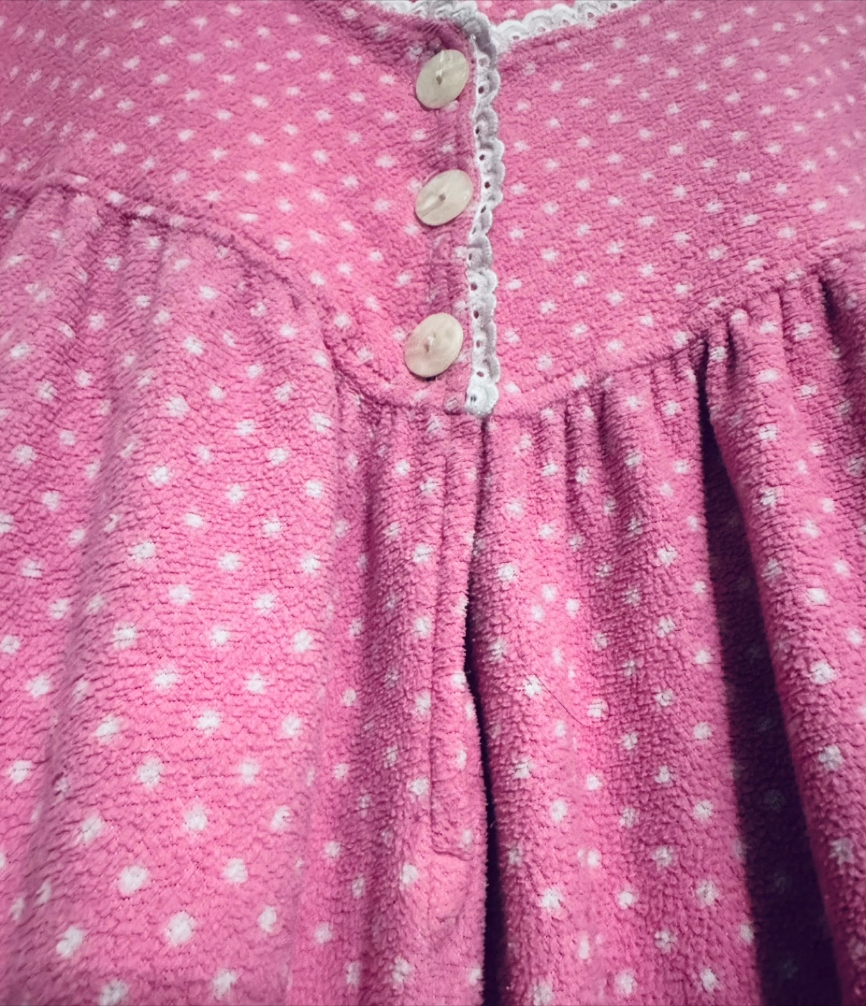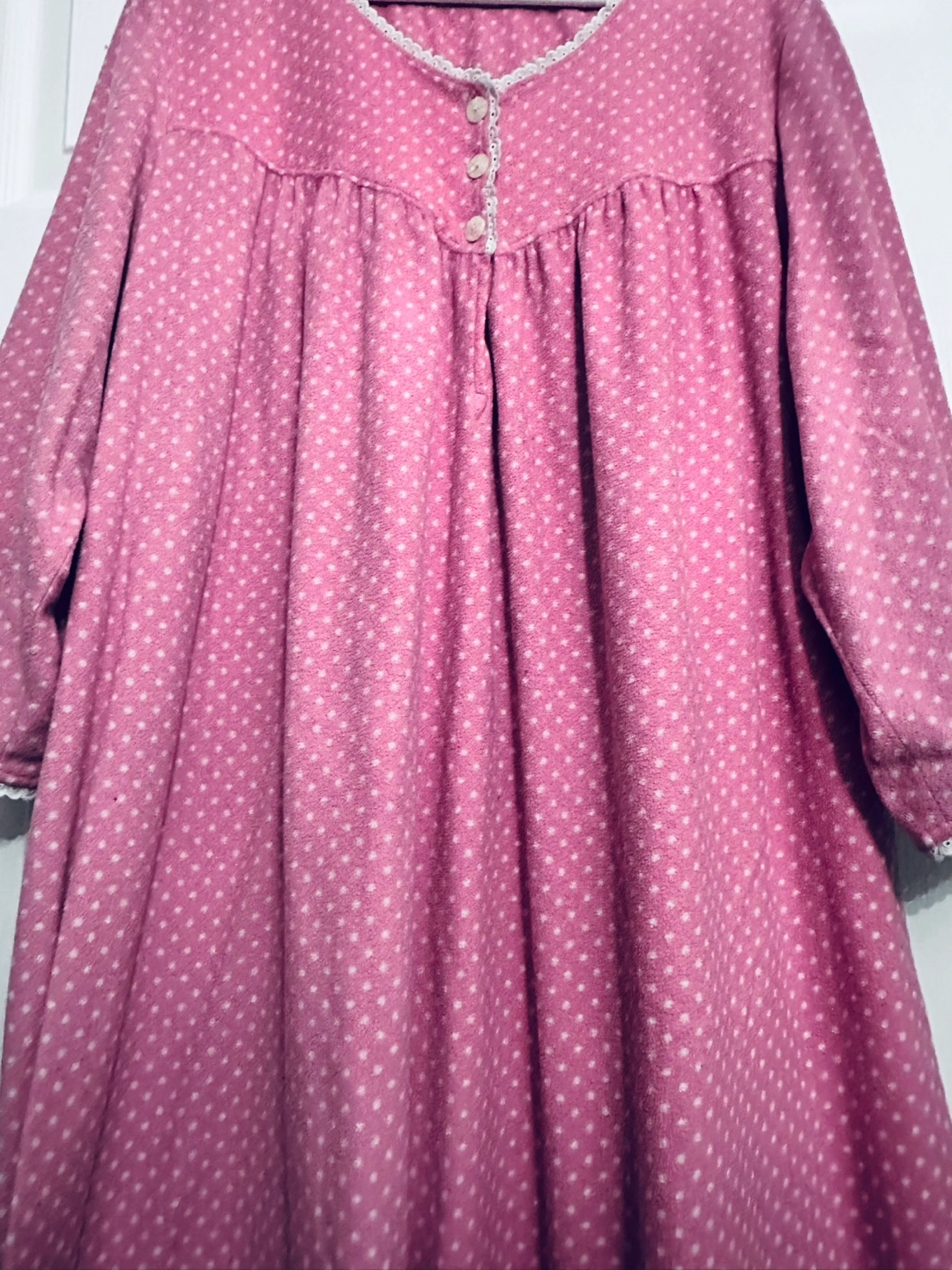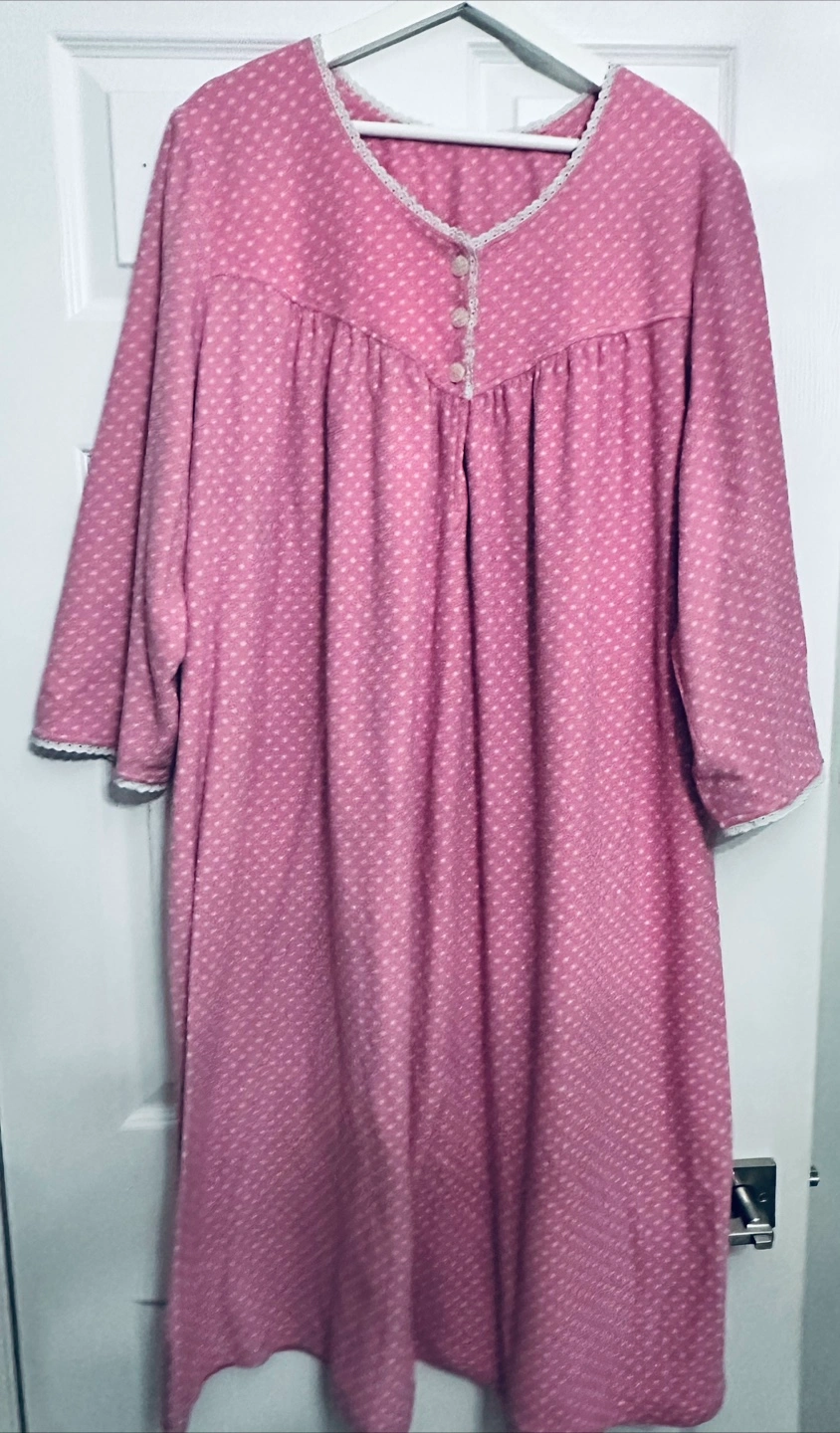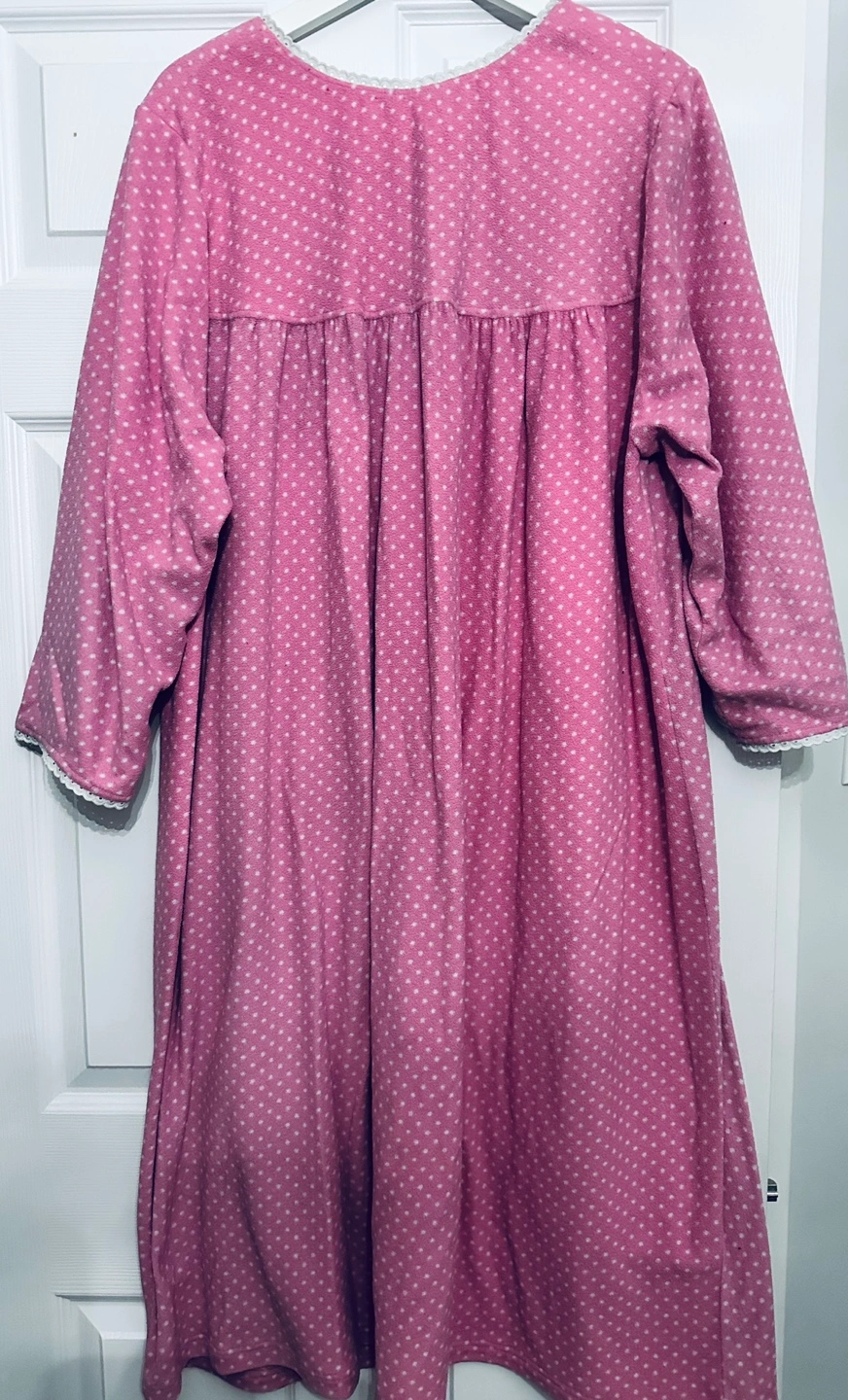 Cozy pink nightgown. Features a button placket and white lace trim. Three-quarter sleeves. Soft fleece material. Excellent for lounging. Pit to pit 32” Length 44”