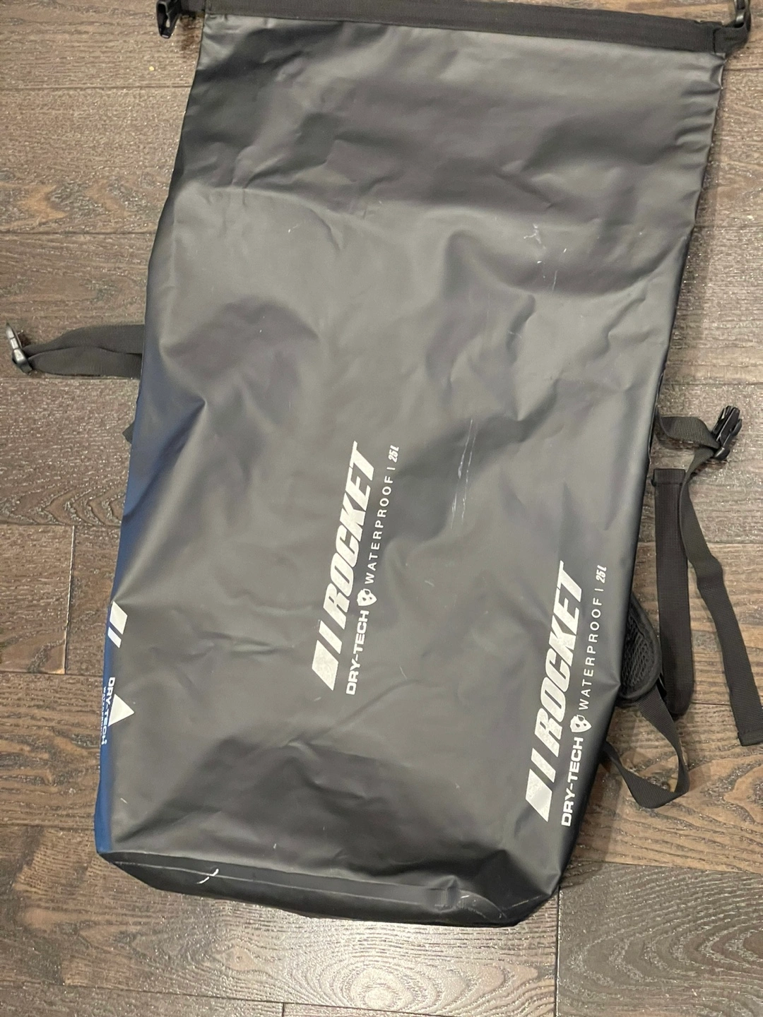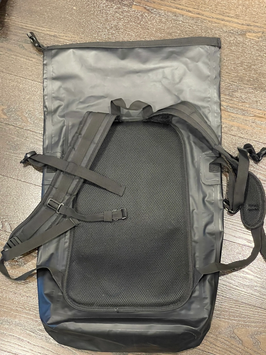 Large black waterproof backpack. Adjustable straps. Mesh back panel for breathability. Great for outdoor adventures.