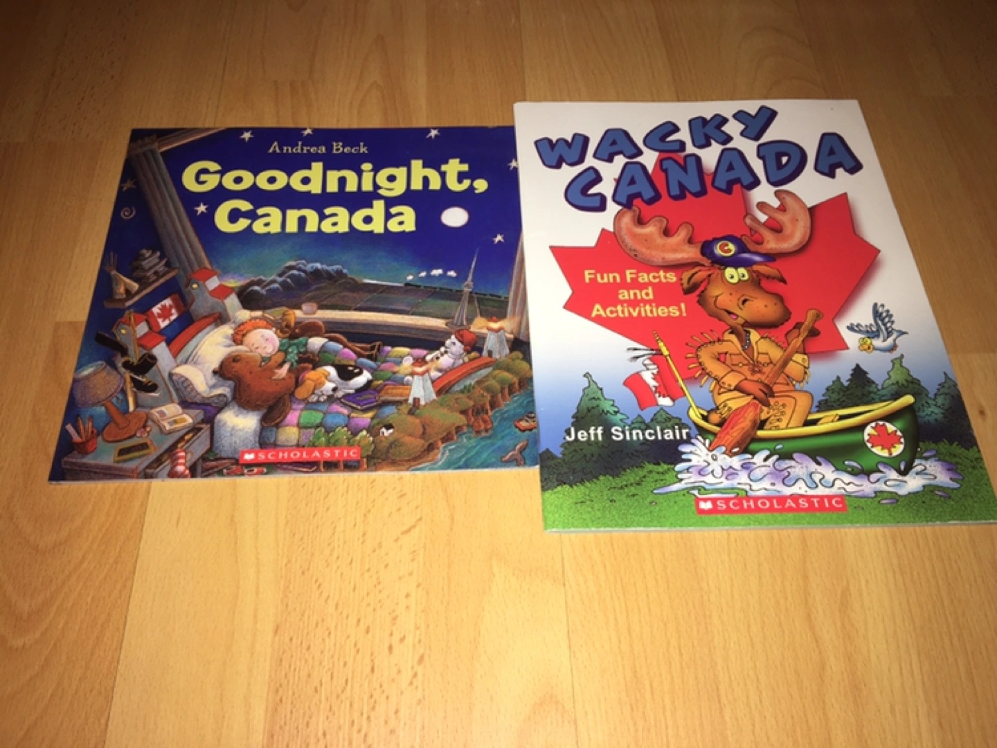 Two Scholastic Canada children's books. 1. Goodnight, Canada by Andrea Beck. 2. Wacky Canada by Jeff Sinclair. Fun facts and activities. Selling both books for $7.