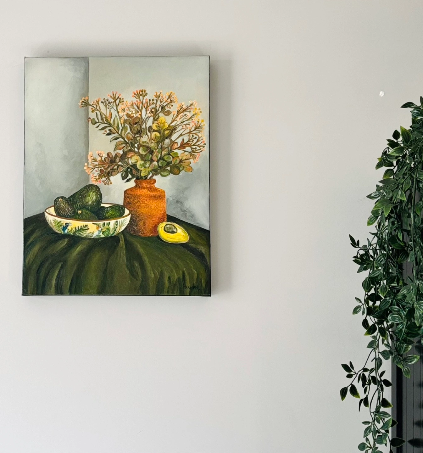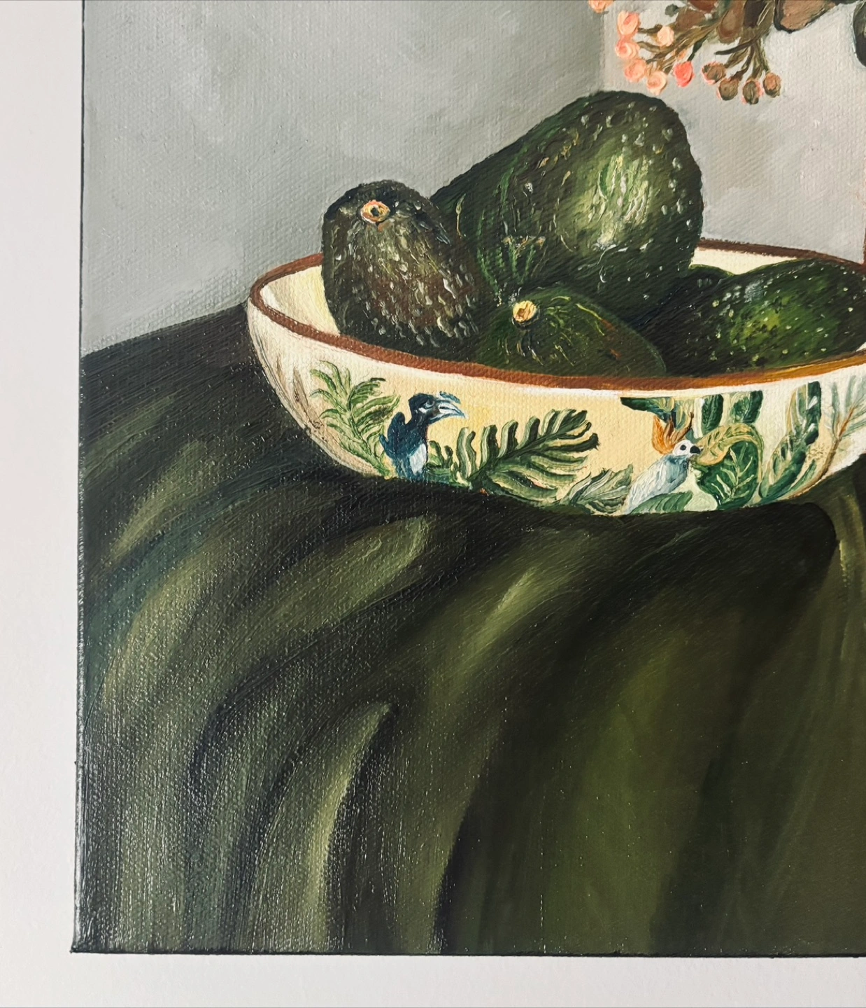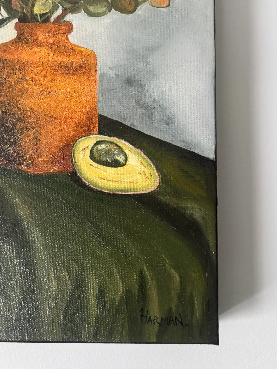 Size- 14” by 18” inches Beautiful original oil painting. Features flowers in a vase and avocados. Dark green tablecloth. Signed by artist Harman.