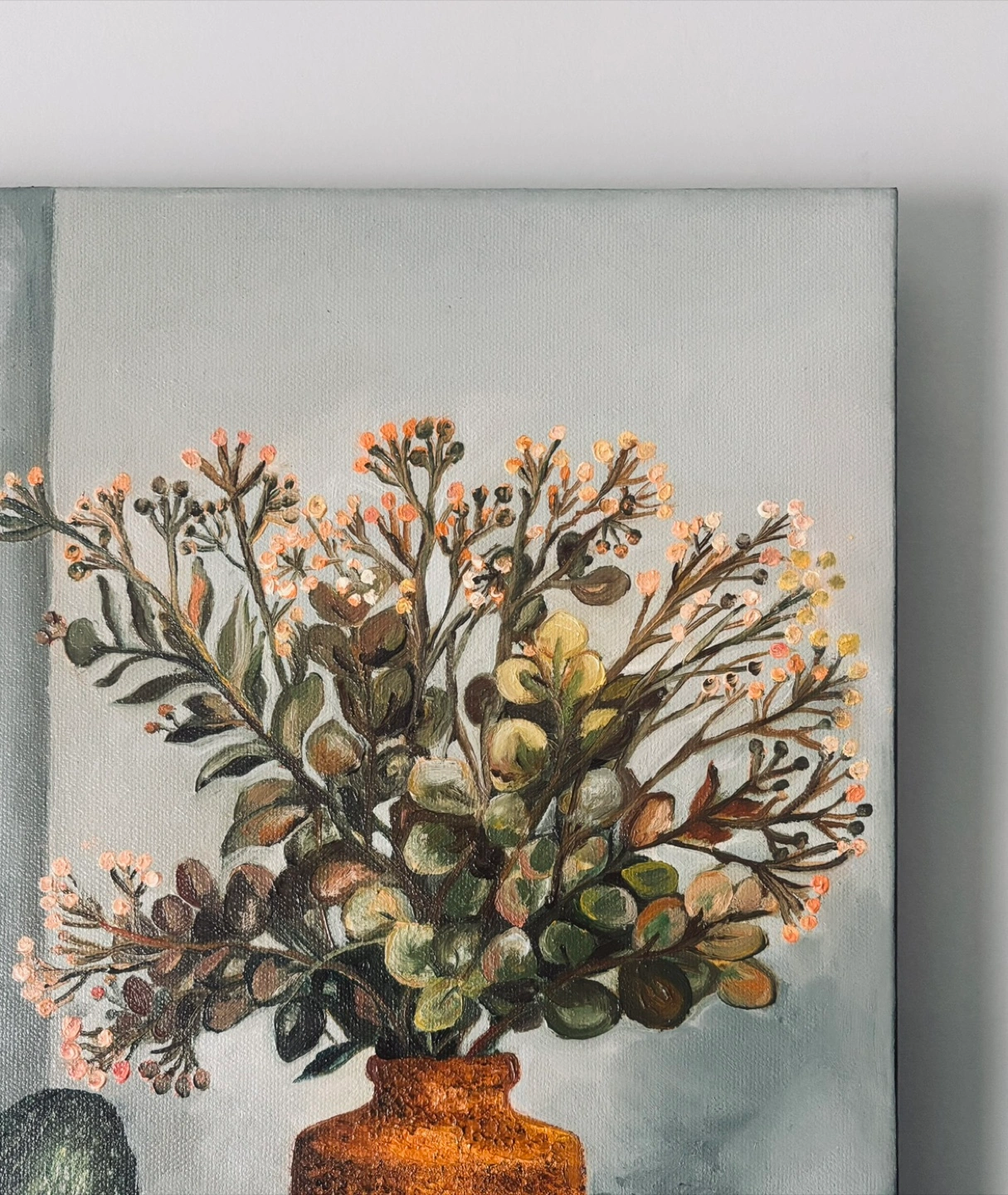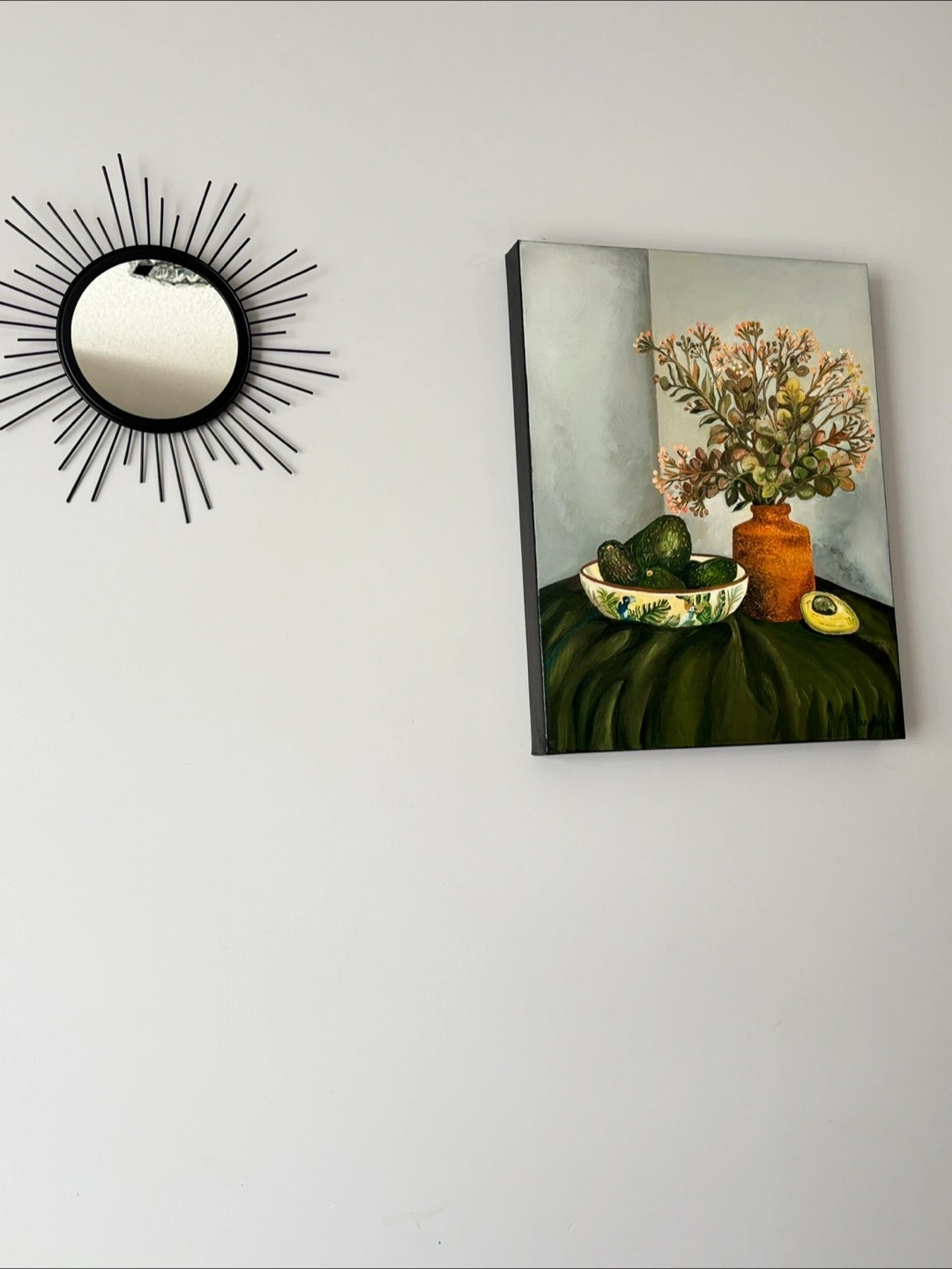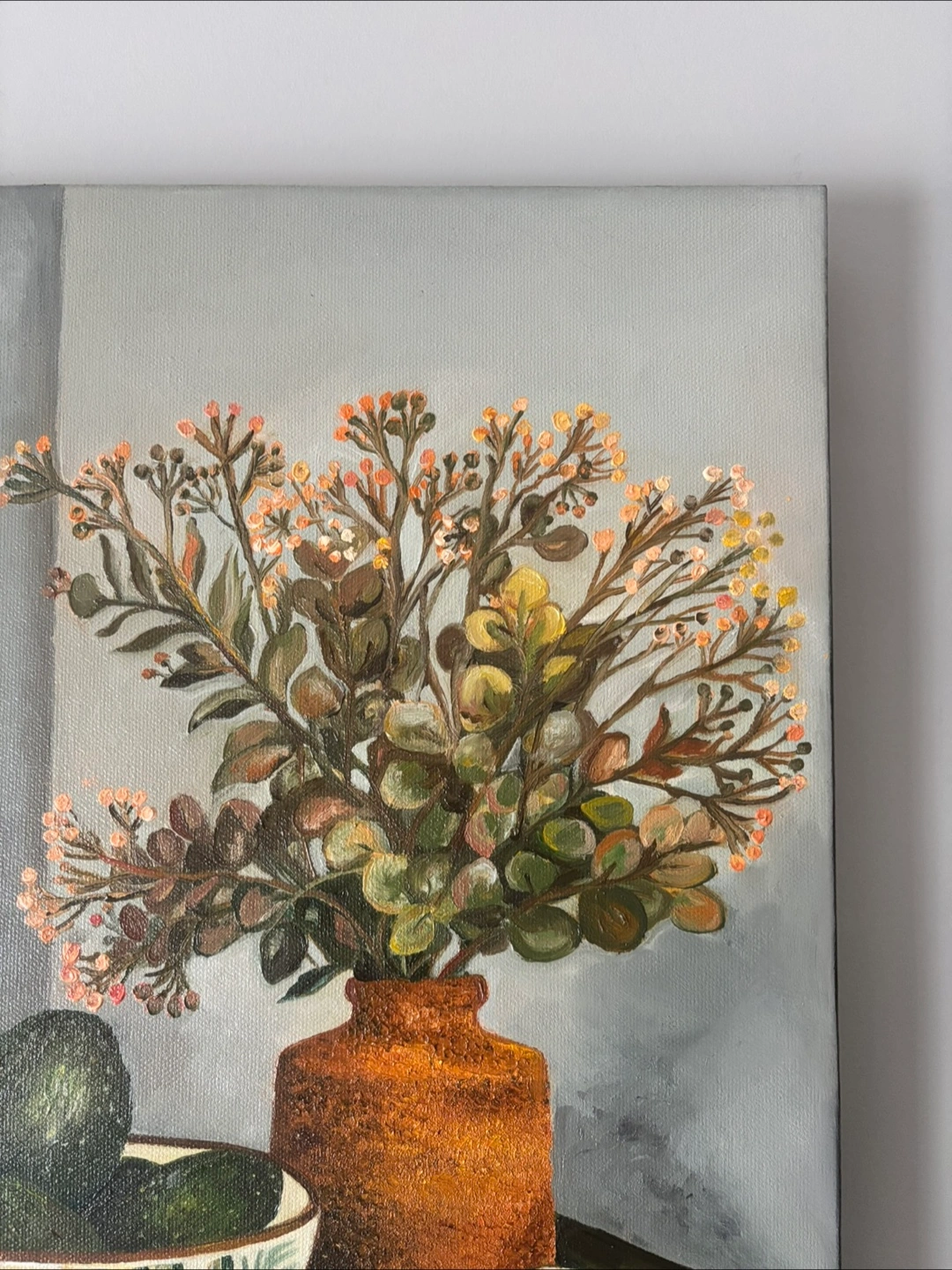 Size- 14” by 18” inches Beautiful original oil painting. Features flowers in a vase and avocados. Dark green tablecloth. Signed by artist Harman.