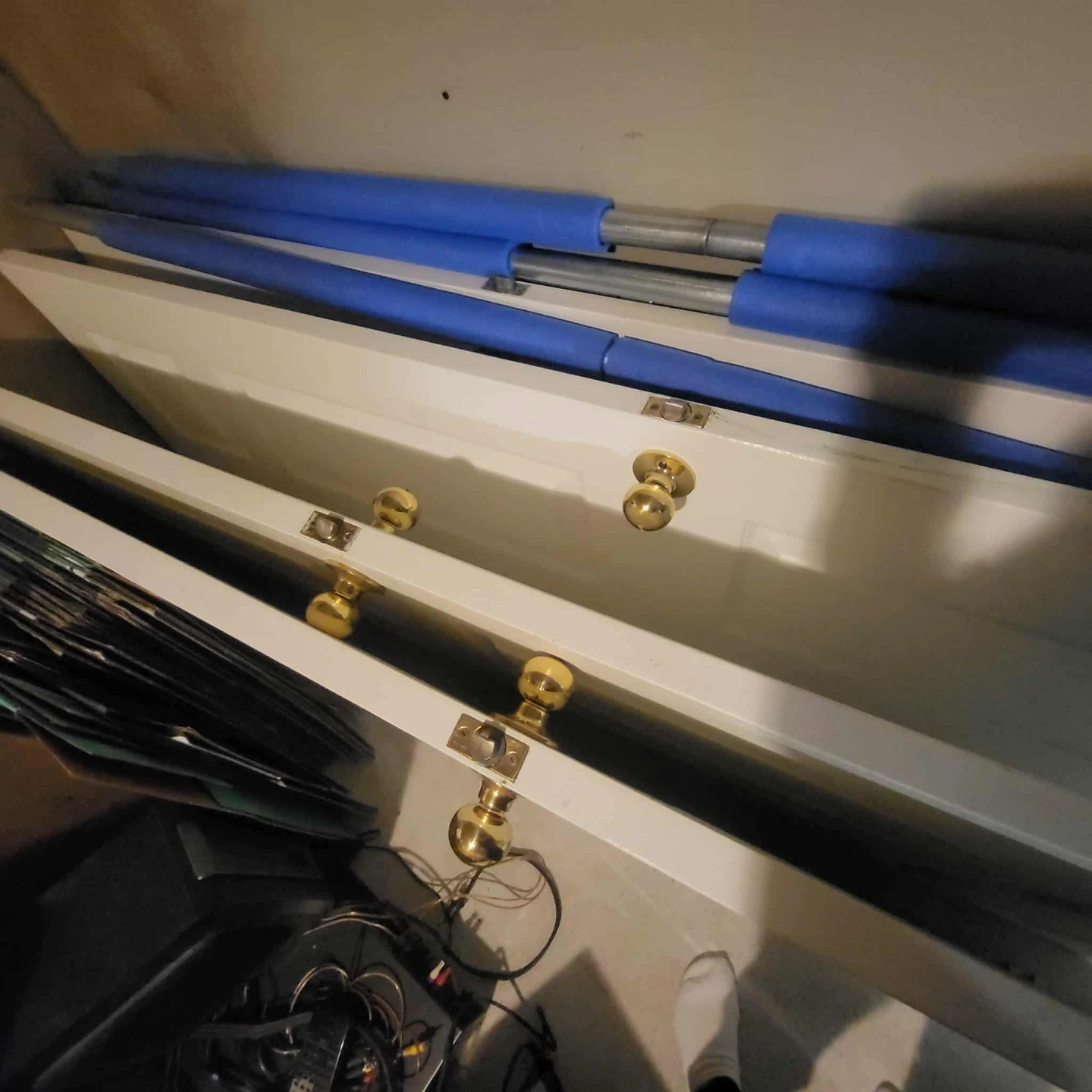 Pair of off-white interior doors. Gold-toned door knobs. Good condition. Solid core doors. $30 each