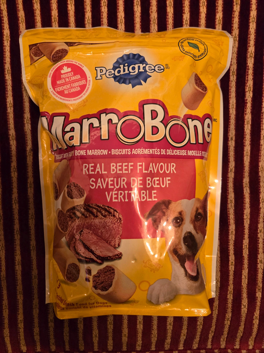 Bag of Pedigree KarroBone dog treats. Real beef flavour. Biscuits with tasty bone marrow. Made in Canada. 2026 expiry