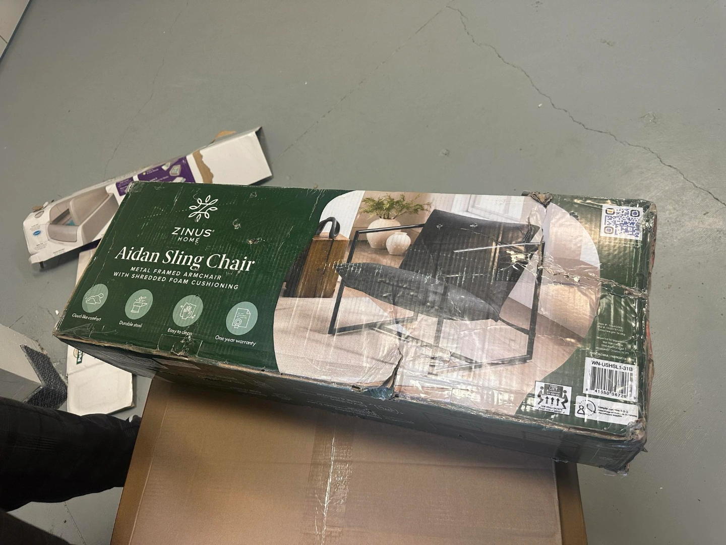 Brand new in box, never used. Metal frame sling chair with shredded foam cushioning. Black fabric. Modern design. Box shows some wear. READ ME BEFORE PURCHASING Please note that all items listed are available for pickup only at our warehouse location: 265 Rimrock Rd, Unit 2B, North York, ON Kindly ensure availability before arriving. If you have any questions or need more information about an item, feel free to message us directly. Thank you for your interest