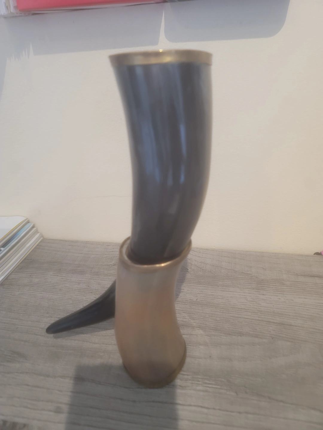 Unique drinking horn. Features a dark horn with a gold-coloured rim and base. Perfect for collectors or enthusiasts.