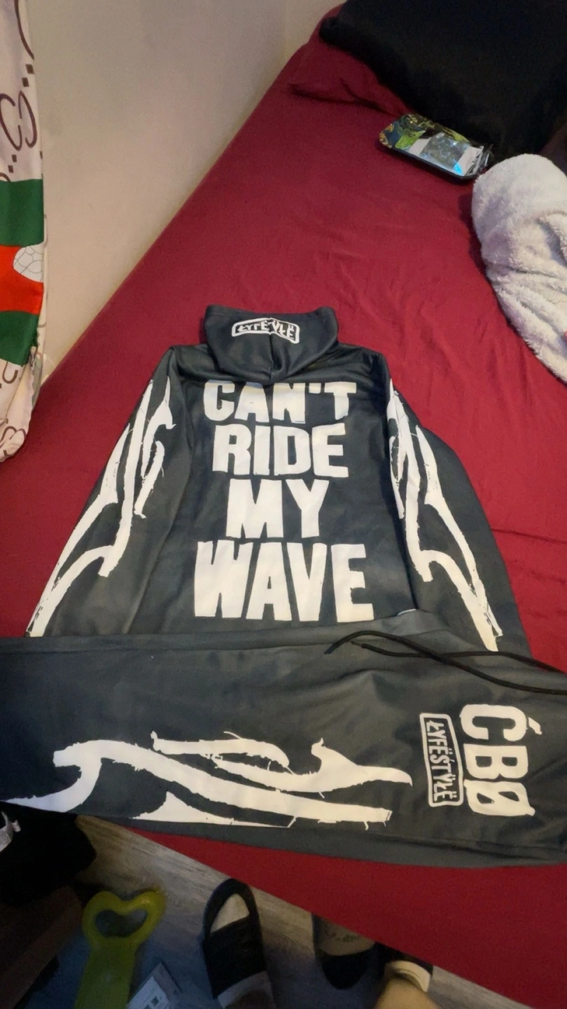 Black hoodie and joggers set. Features white graphic design. Hoodie has a hood and pouch pocket. Joggers have an elastic waistband and 2 pockets. Bought for my nephew but did not fit him. Price is negotiable just be reasonable I paid $150 for this set