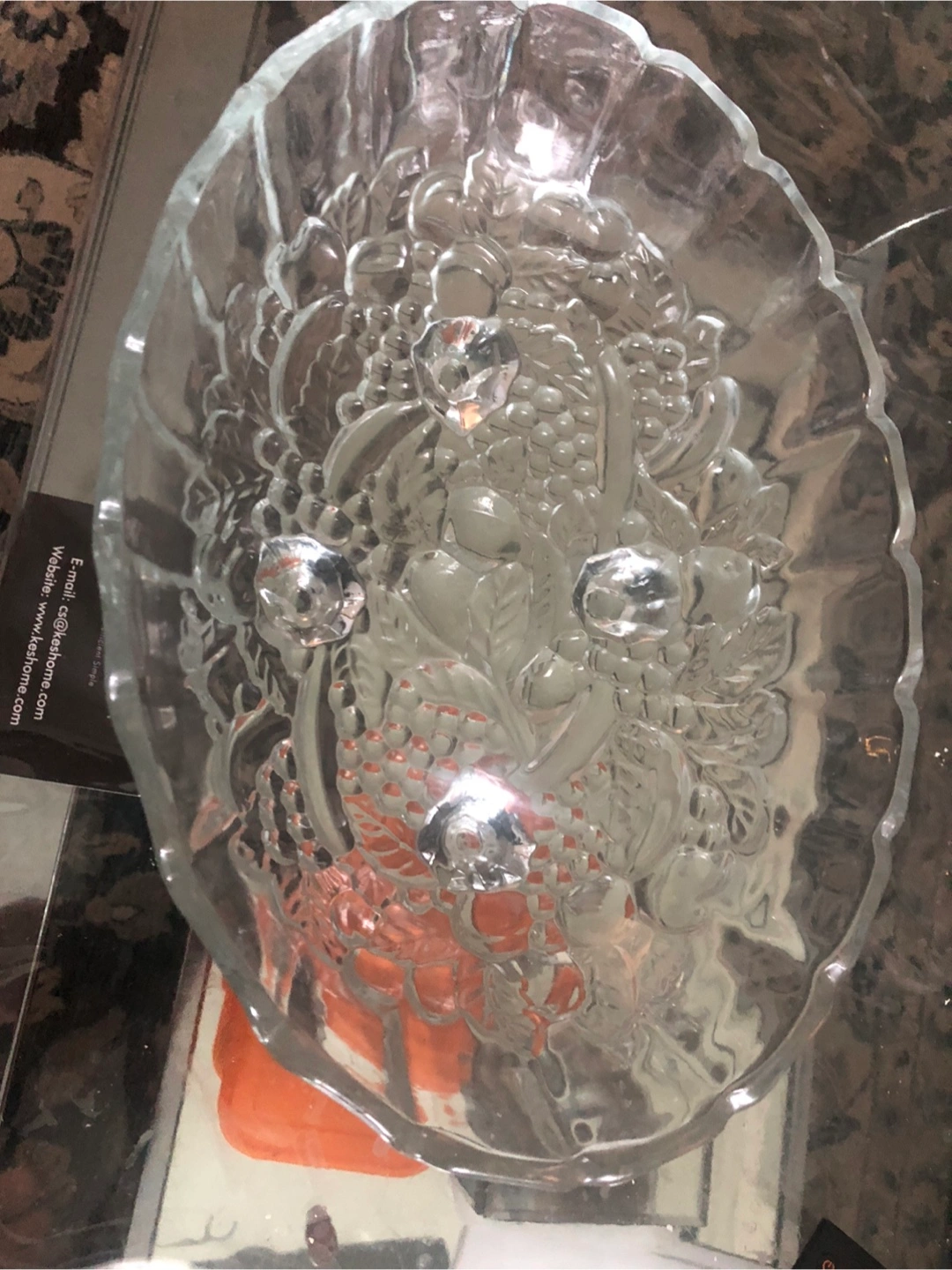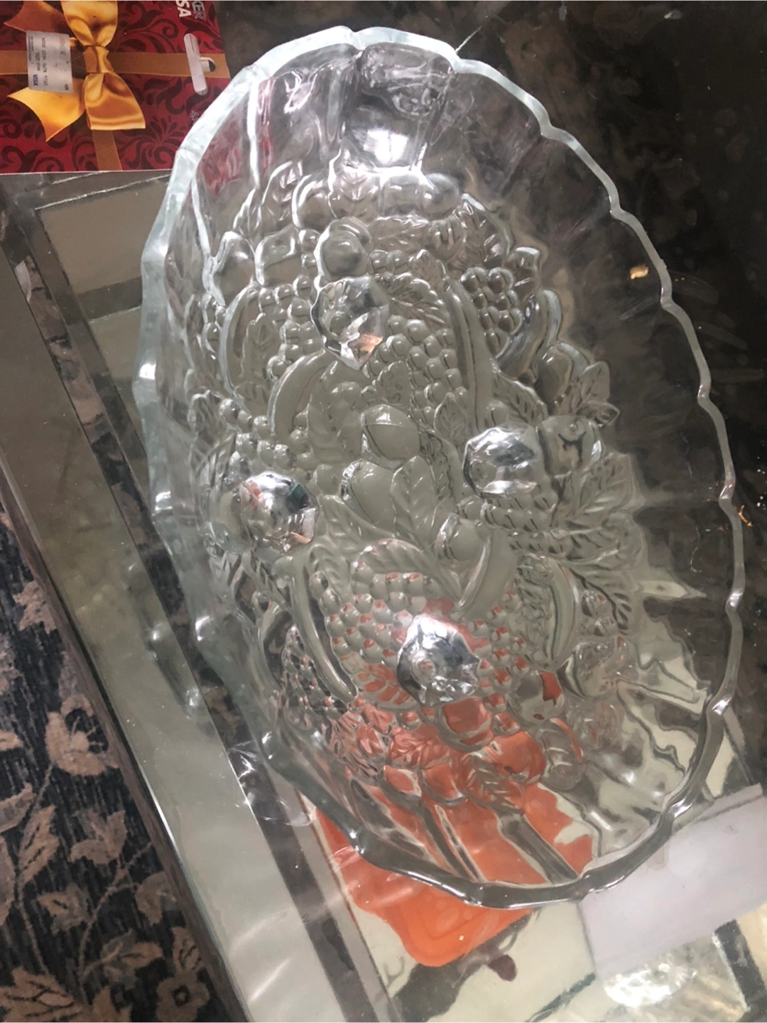 Oval-shaped glass bowl. Features etched fruit design. 4 small feet. Beautiful centrepiece or serving dish.