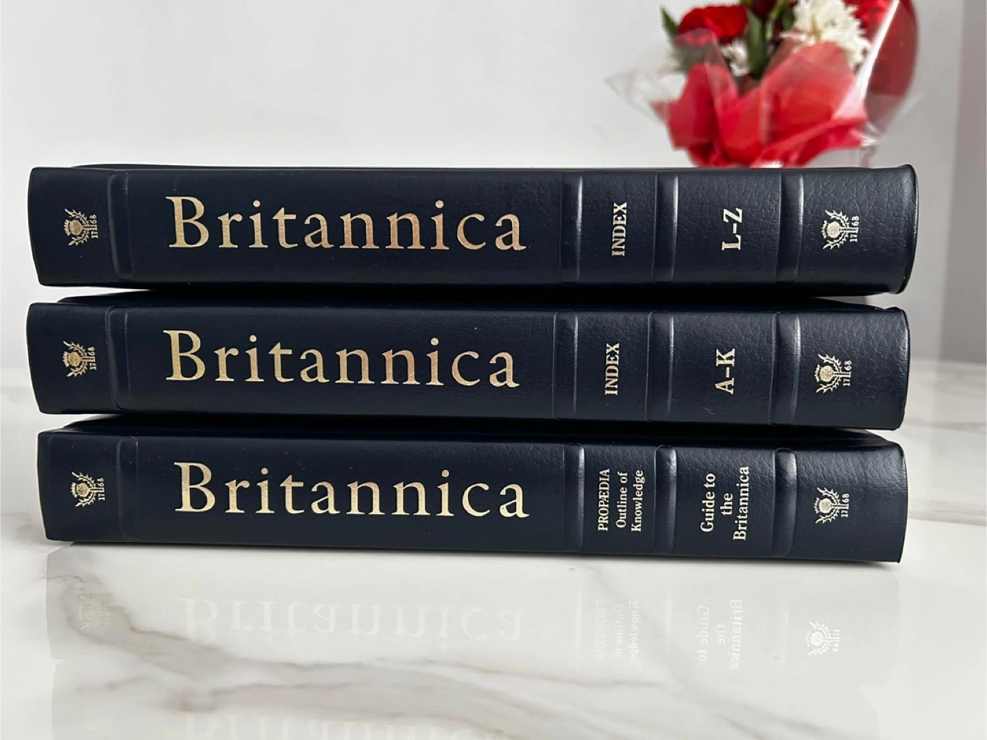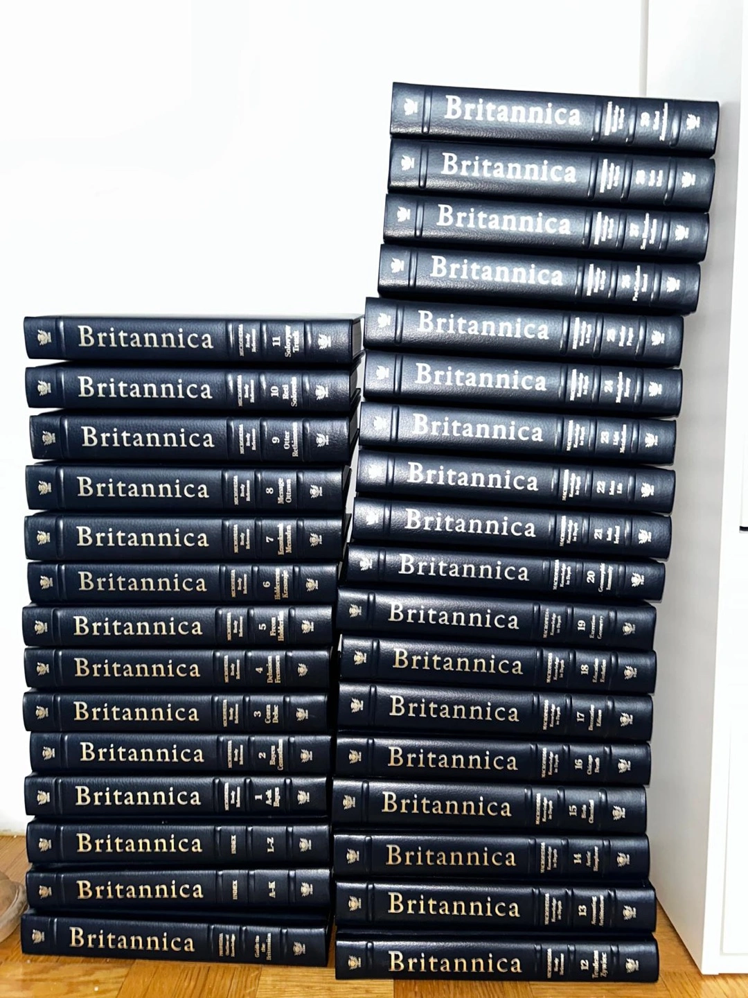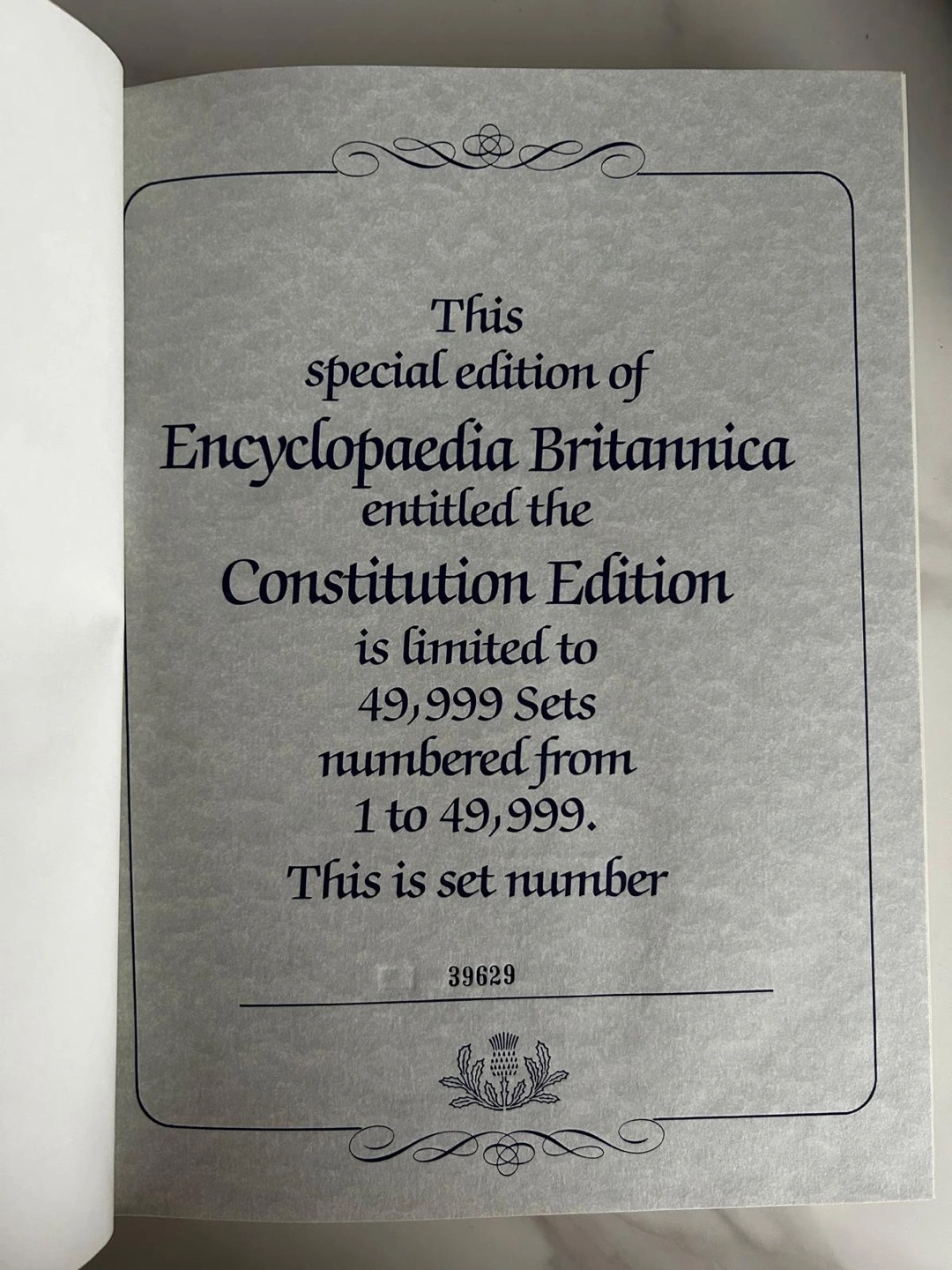 Complete 29 volume set of the Encyclopaedia Britannica Constitution Edition. Limited edition, numbered set. Excellent condition. Includes index volumes. Dark blue leather-bound books. 15th Edition