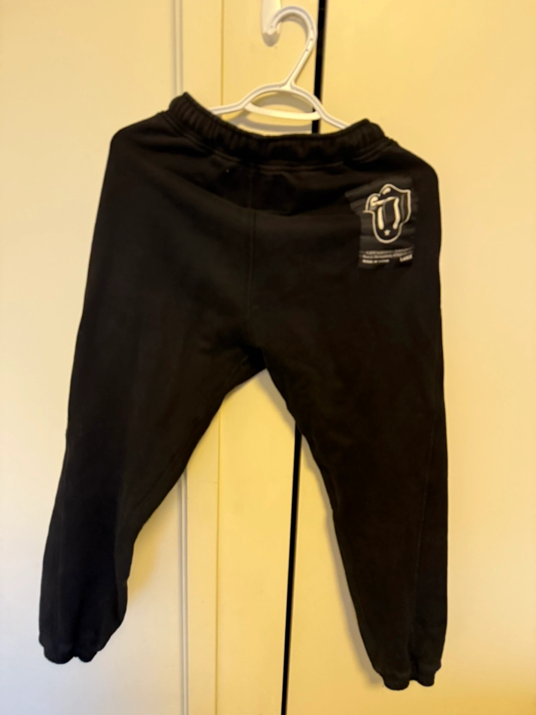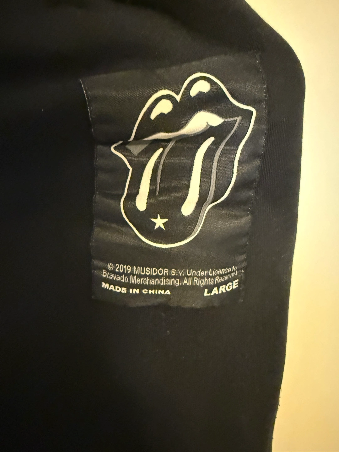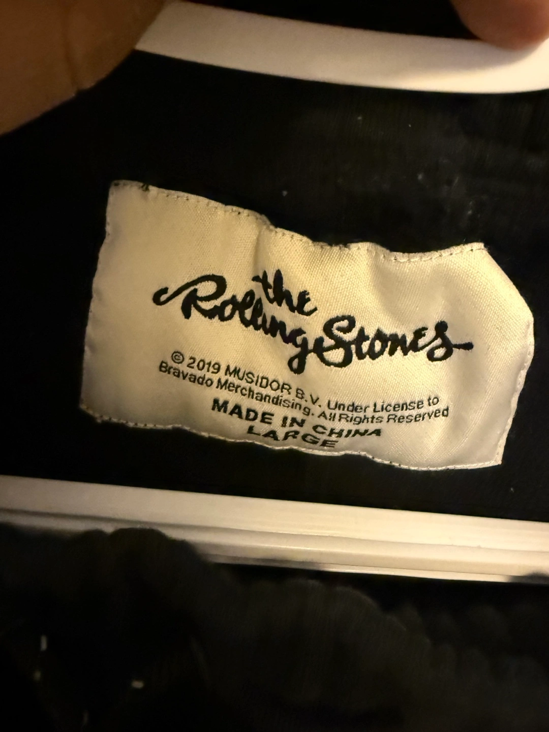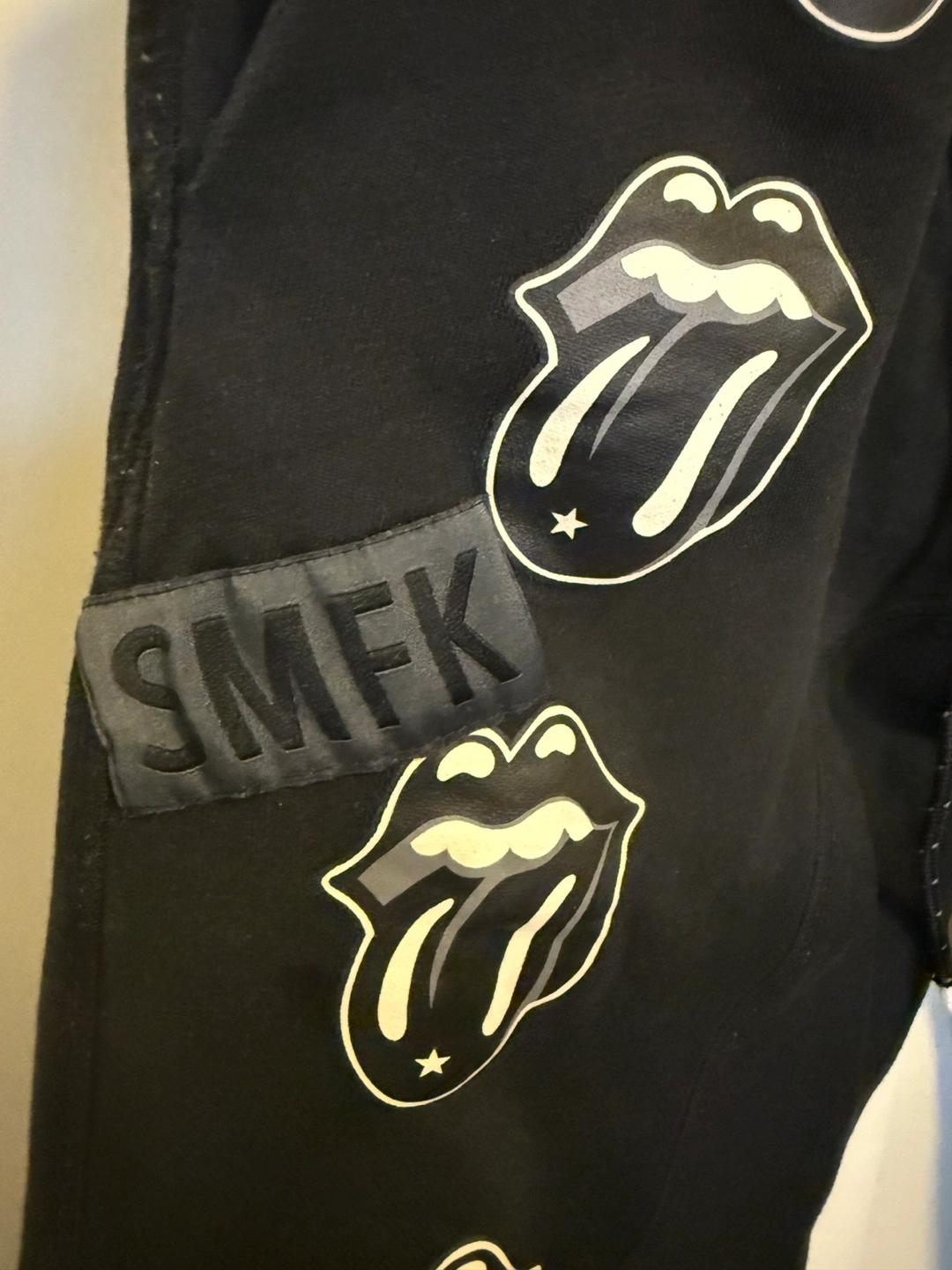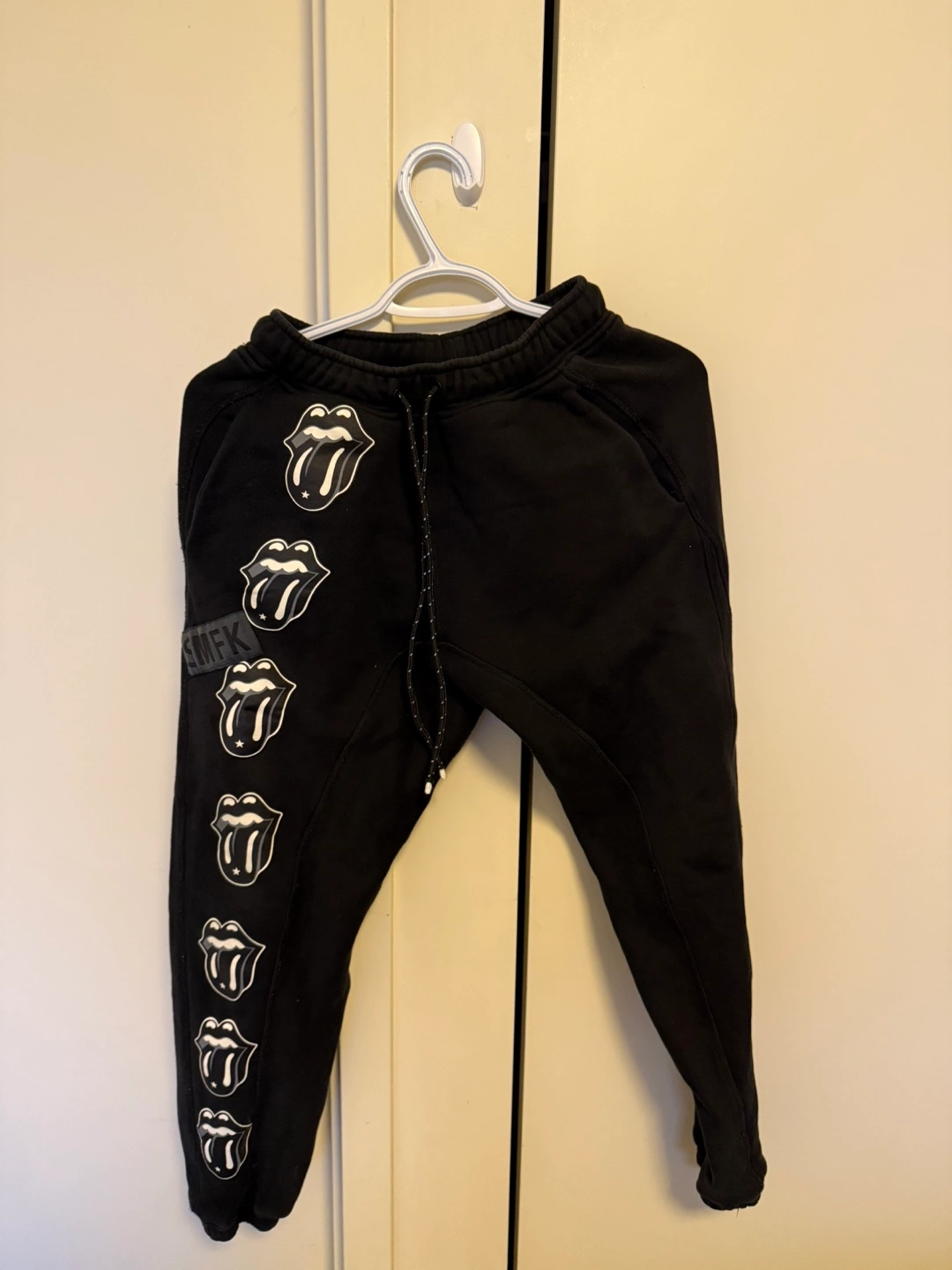 Black jogger pants. Features multiple Rolling Stones tongue logos down one leg. Large size. Made in China.