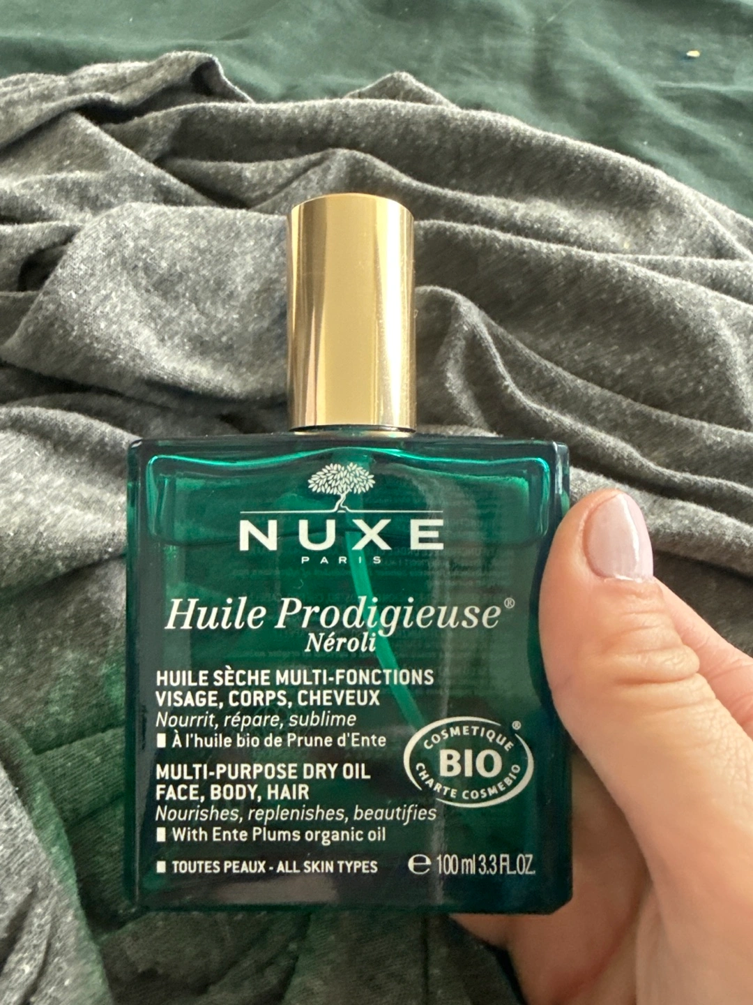 100ml bottle of Nuxe Huile Prodigieuse Neroli. Multi-purpose dry oil for face, body, and hair. Nourishes, replenishes, and beautifies. Contains Ente Plums organic oil. For all skin types.