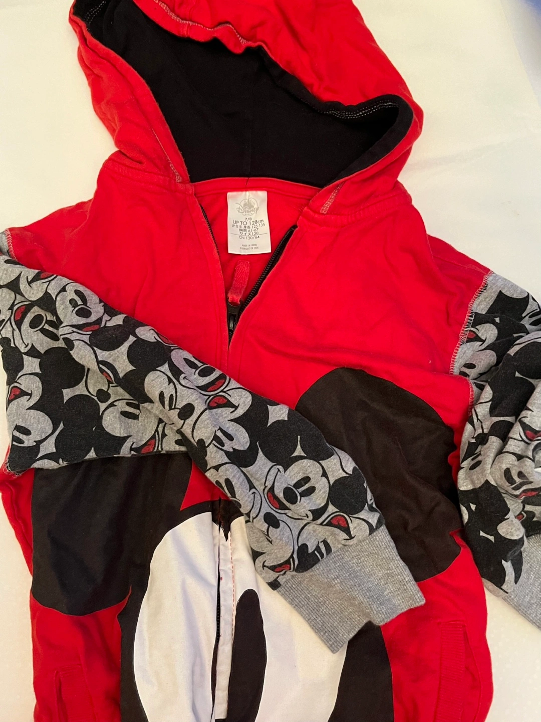Red zip-up hoodie featuring Mickey Mouse. Size 7/8. Made in India.