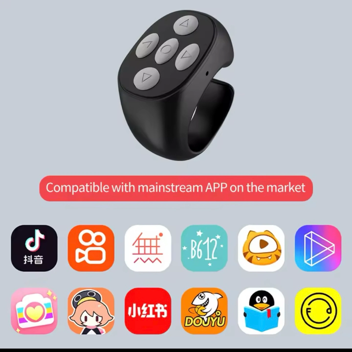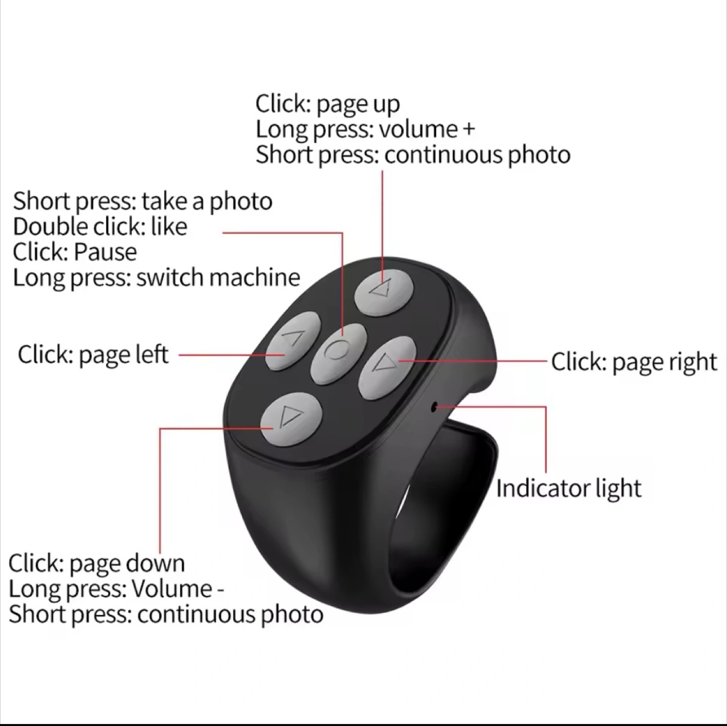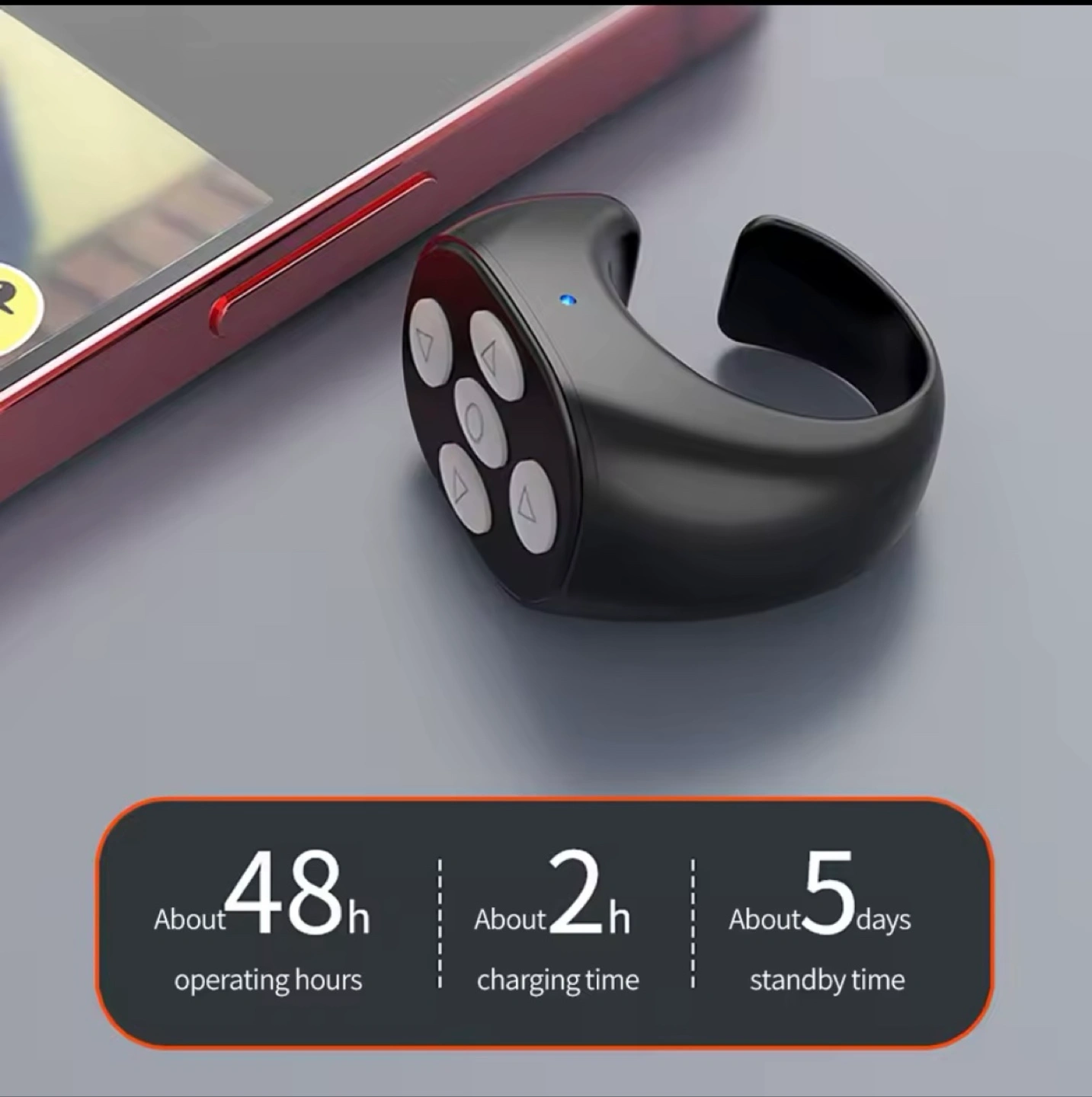 Mini Bluetooth ring controller. Compatible with multiple apps. Features five directional buttons and a central button. Long battery life; 48 hours of operating time and 5 days of standby. Charges in approximately 2 hours. 10-metre Bluetooth range. Easy one-handed operation. Great for photos and videos.