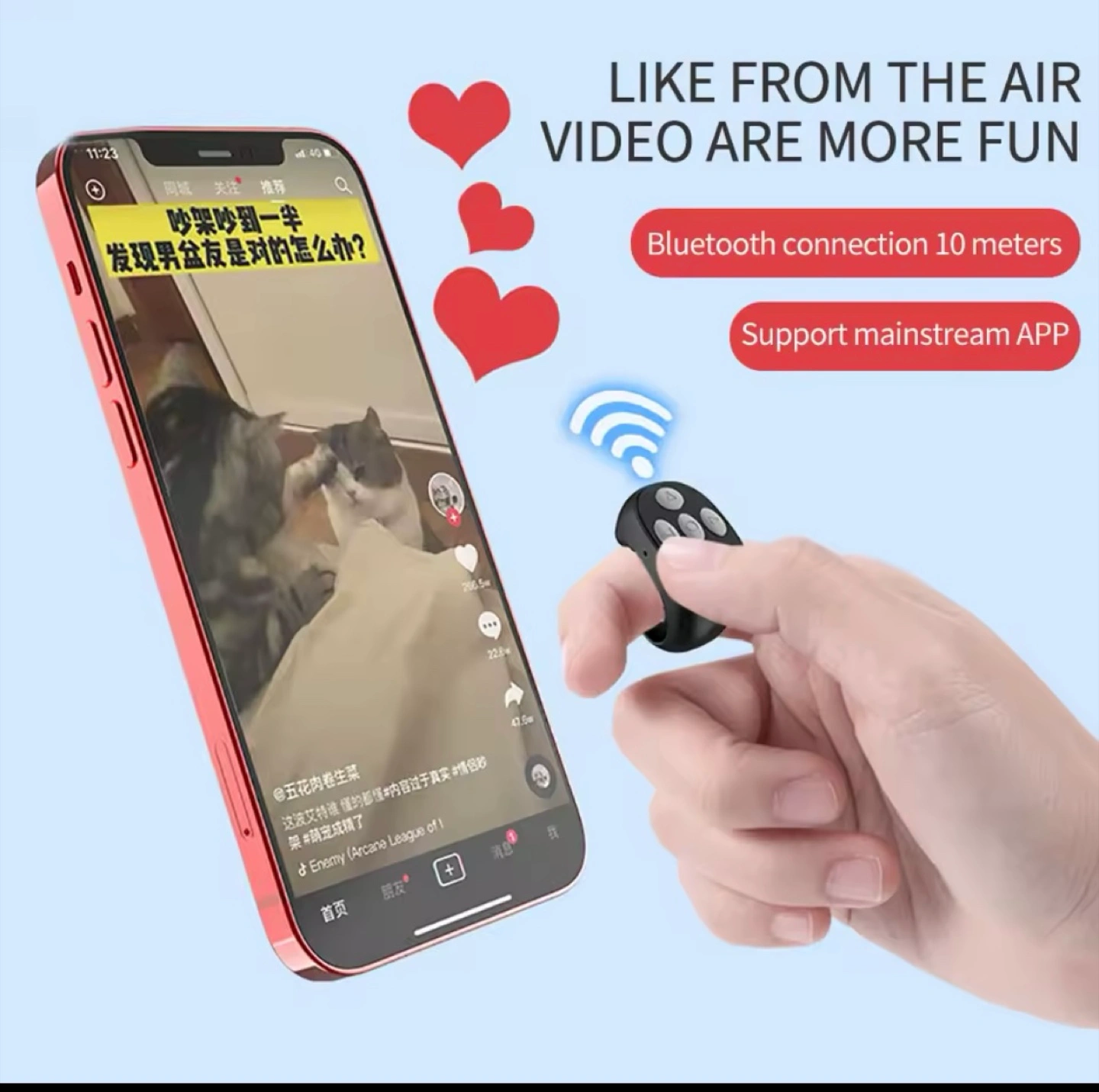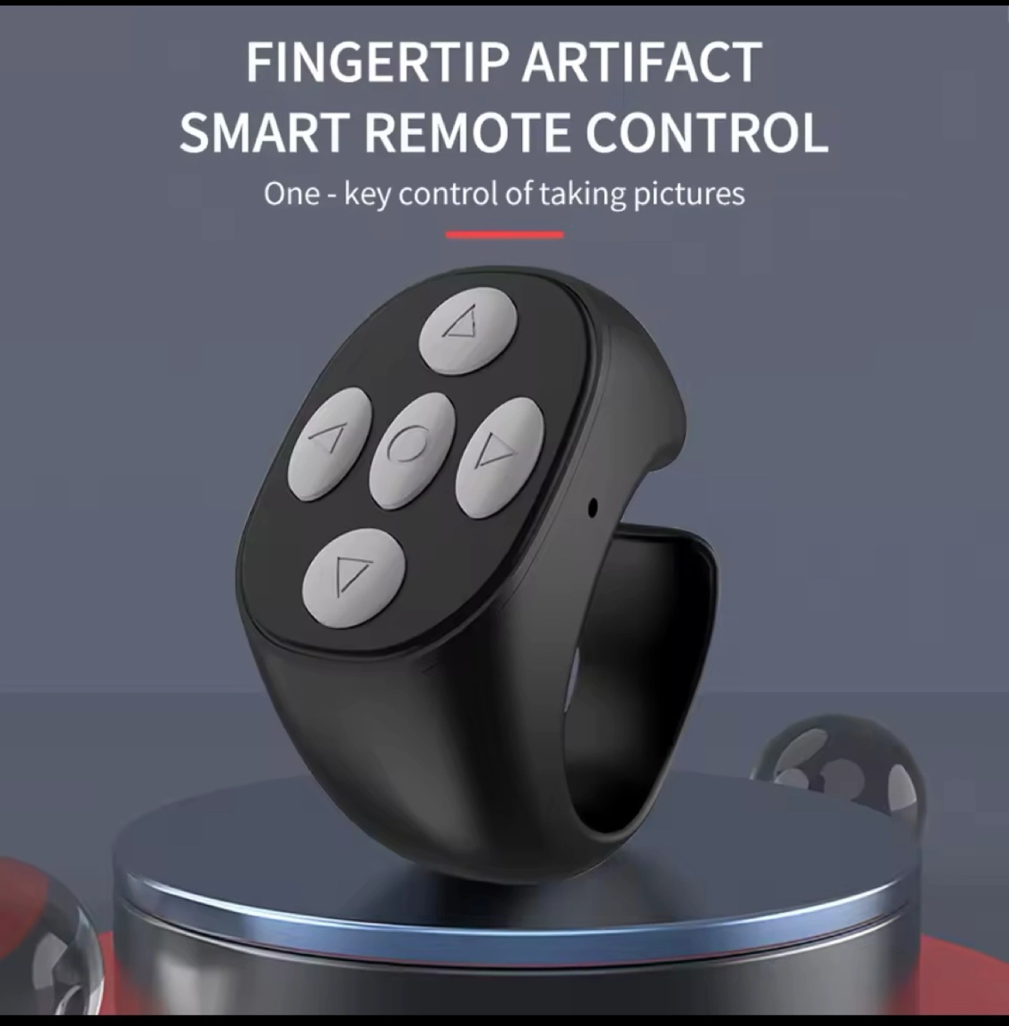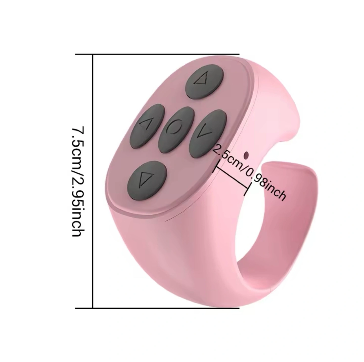 Mini Bluetooth ring controller. Compatible with multiple apps. Features five directional buttons and a central button. Long battery life; 48 hours of operating time and 5 days of standby. Charges in approximately 2 hours. 10-metre Bluetooth range. Easy one-handed operation. Great for photos and videos.