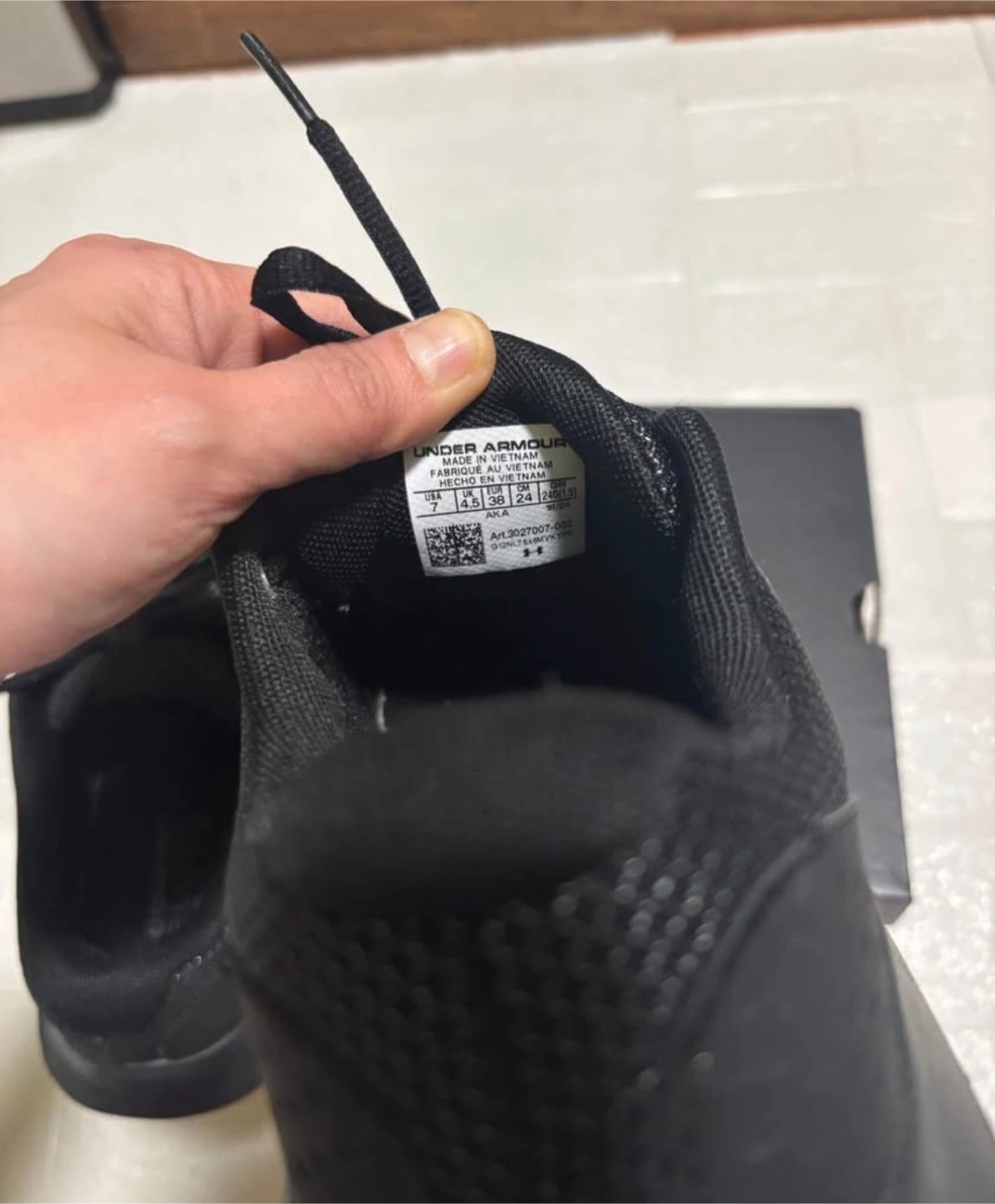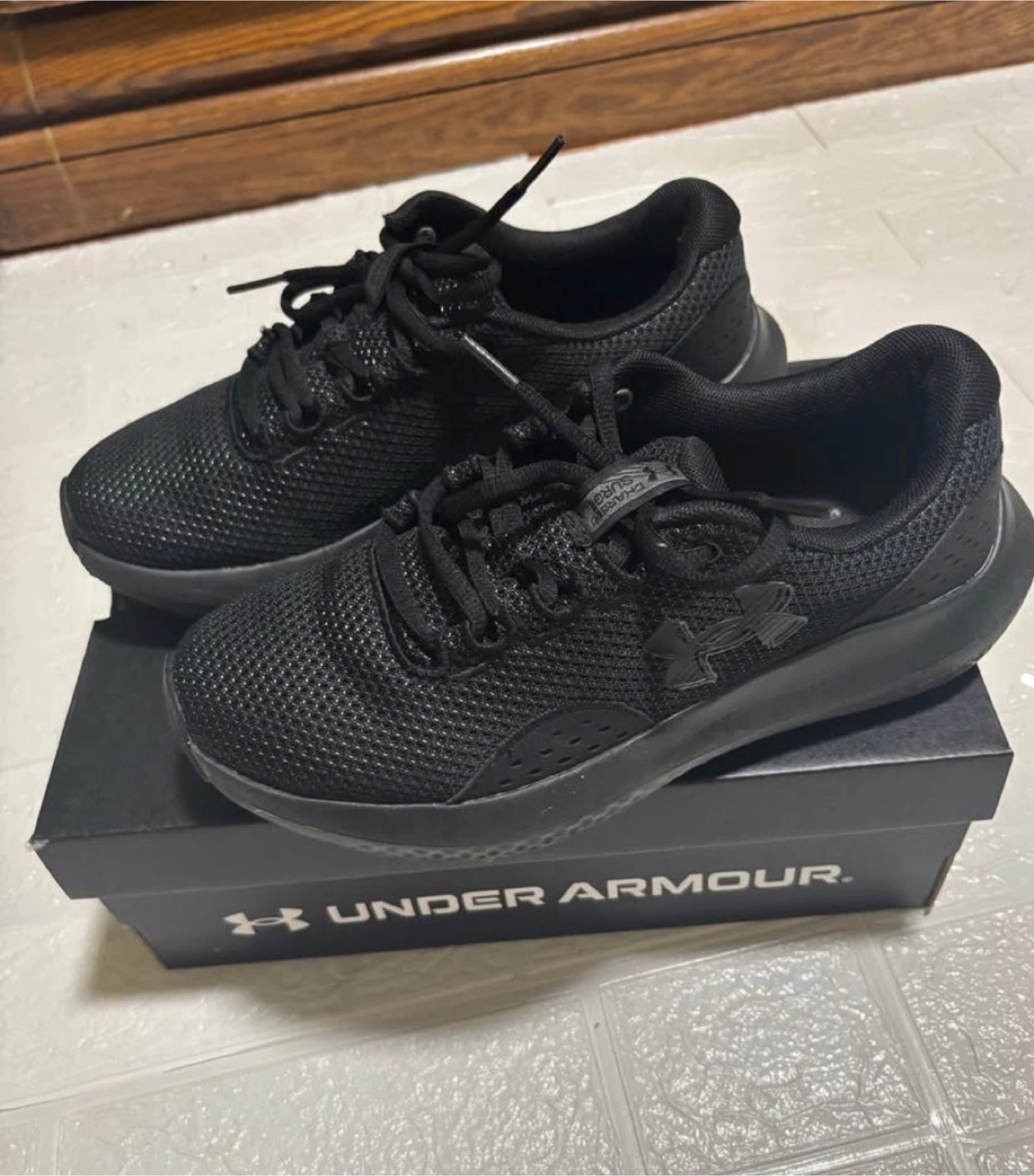 Pair of black Under Armour running shoes. size 7. Features a breathable mesh upper and comfortable cushioning. Come in original box. Used twice. Size doesn’t fit me.