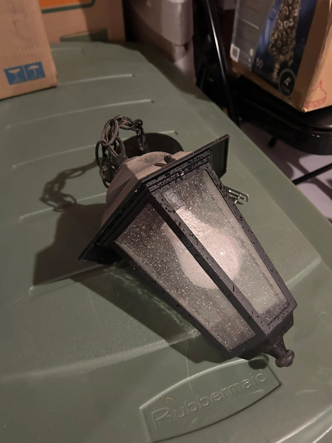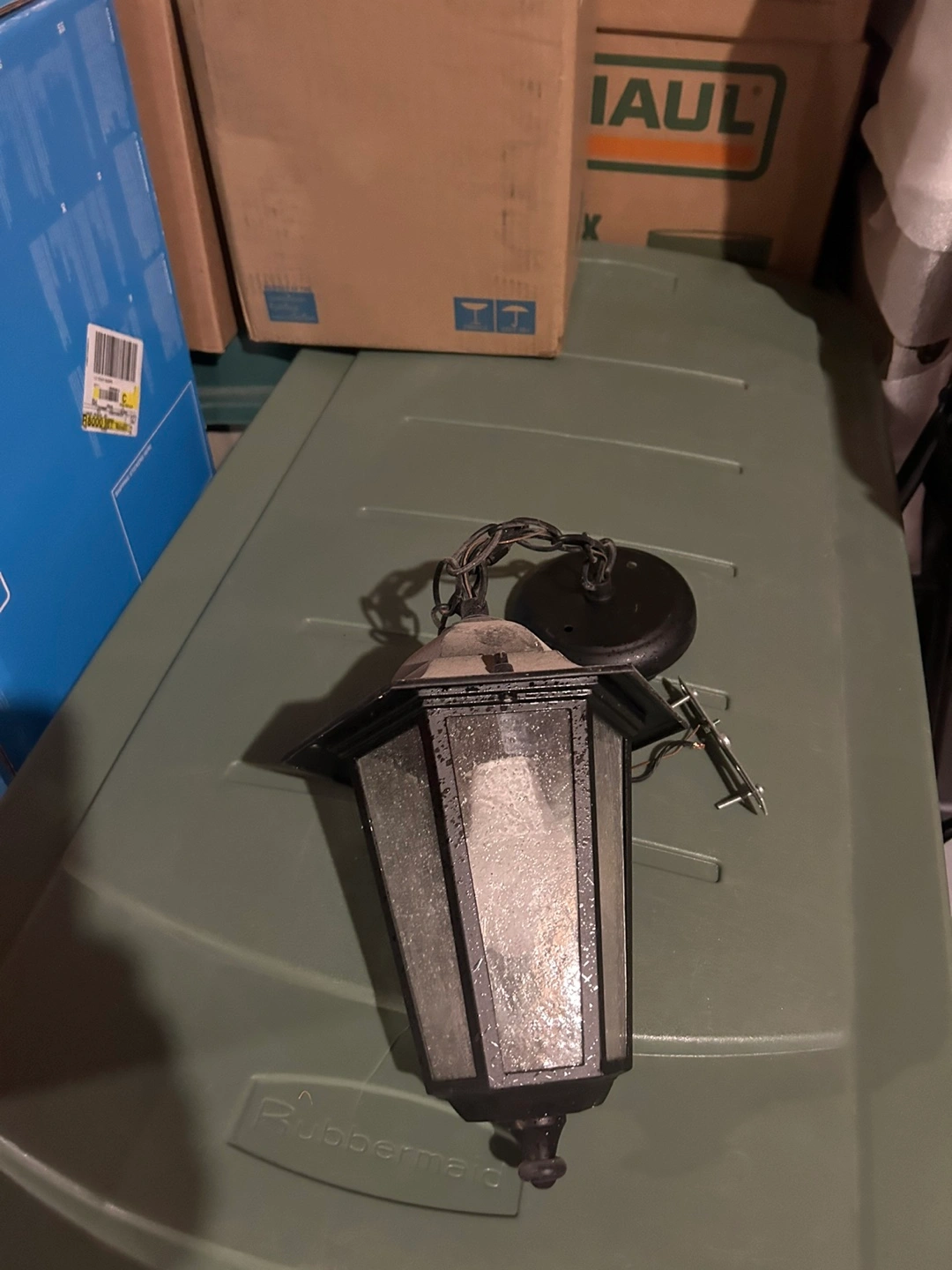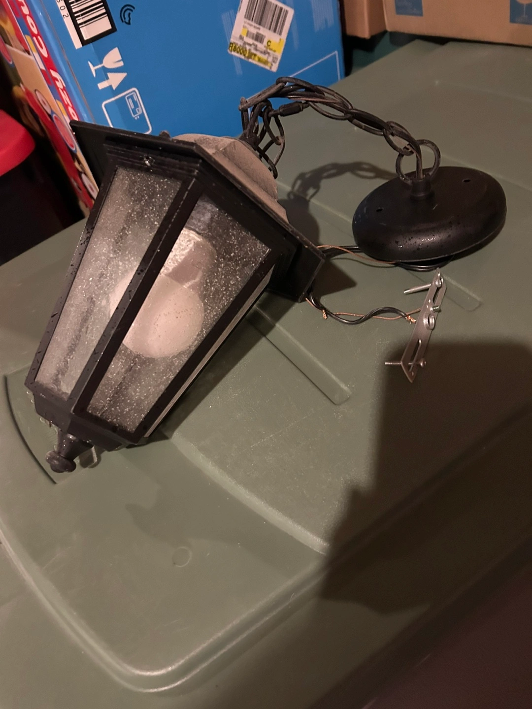Black metal outdoor pendant light. Glass panels. Chain included. Pre-owned.