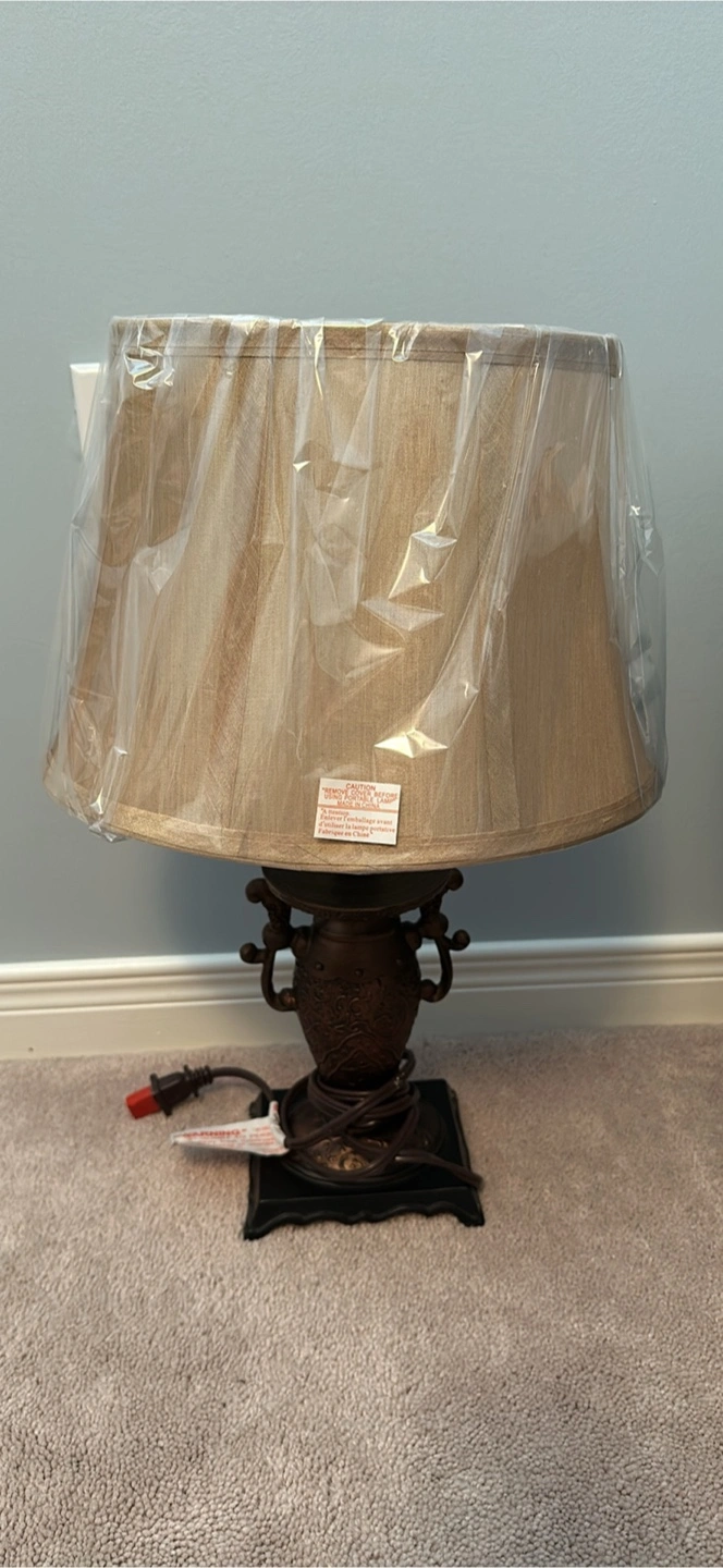 Beautiful table lamp. Ornate base. Beige fabric shade. New in plastic packaging. Bombay company