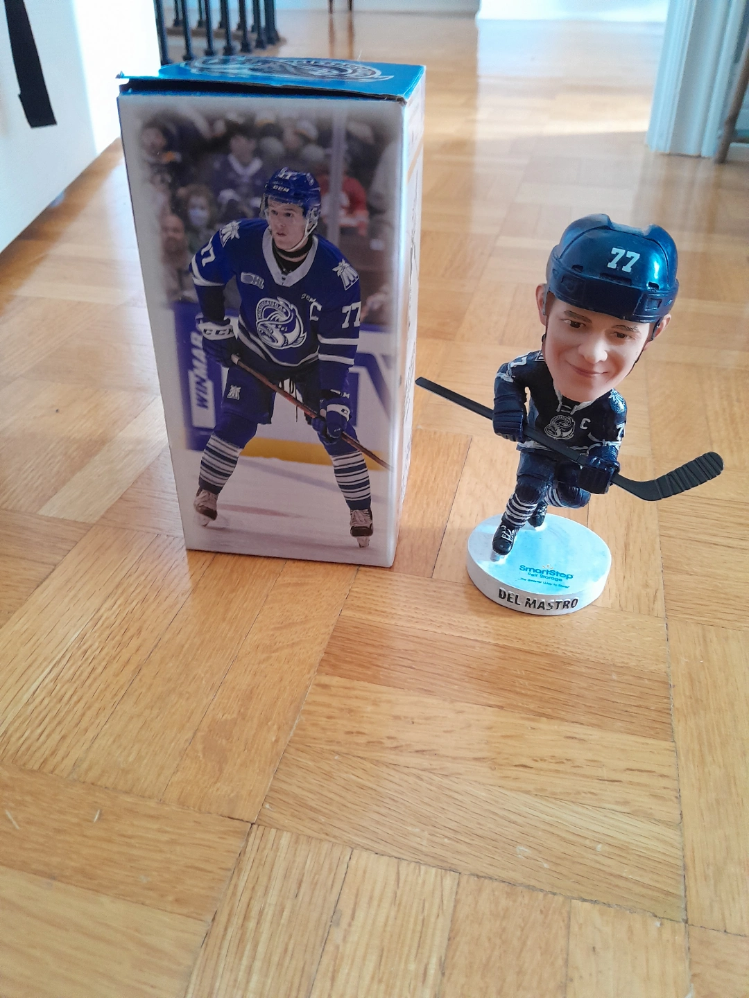 Hockey bobblehead figurine. Player number 77. SmartStop branding on base.
