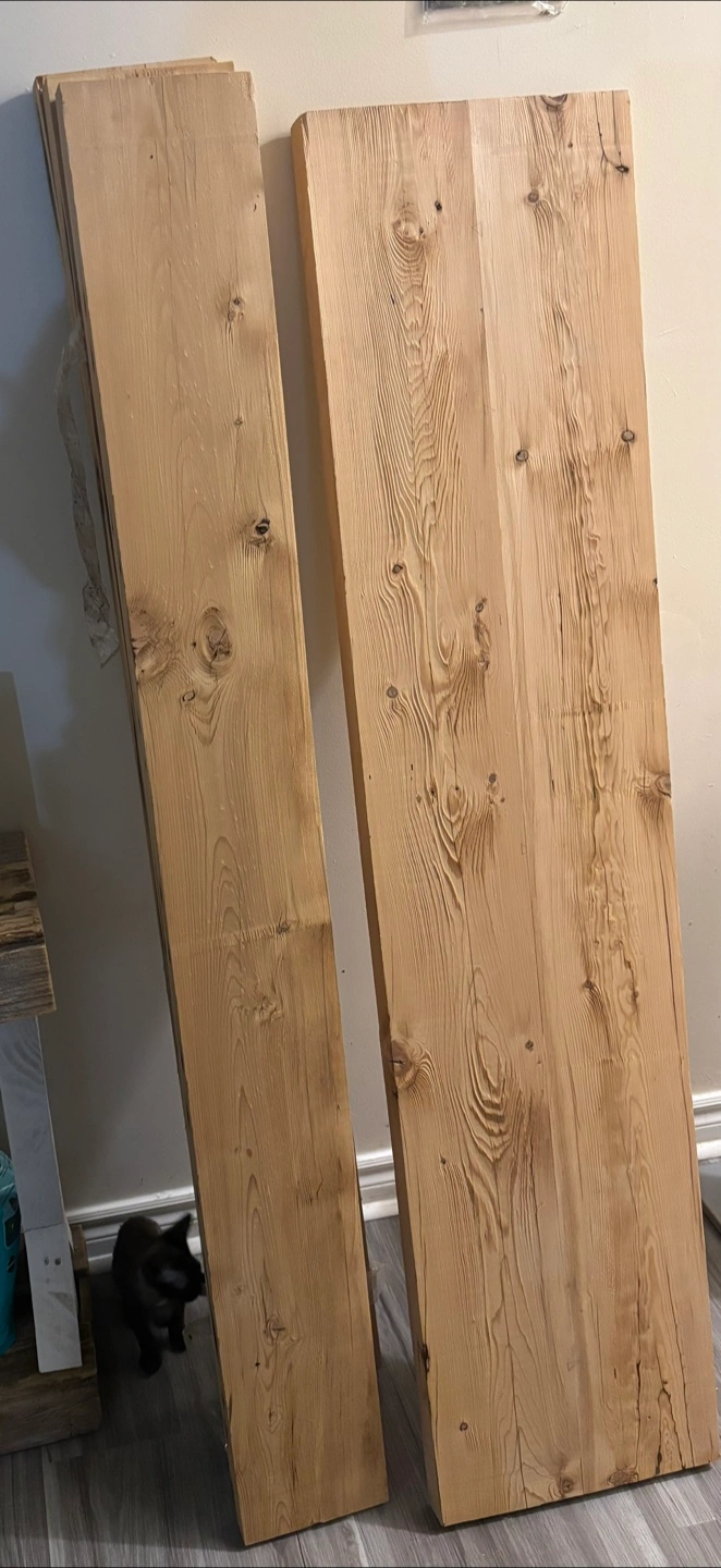 Four long, light brown reclaimed wood planks - 3 narrow and one wide. Perfect for various DIY projects. Untreated.
